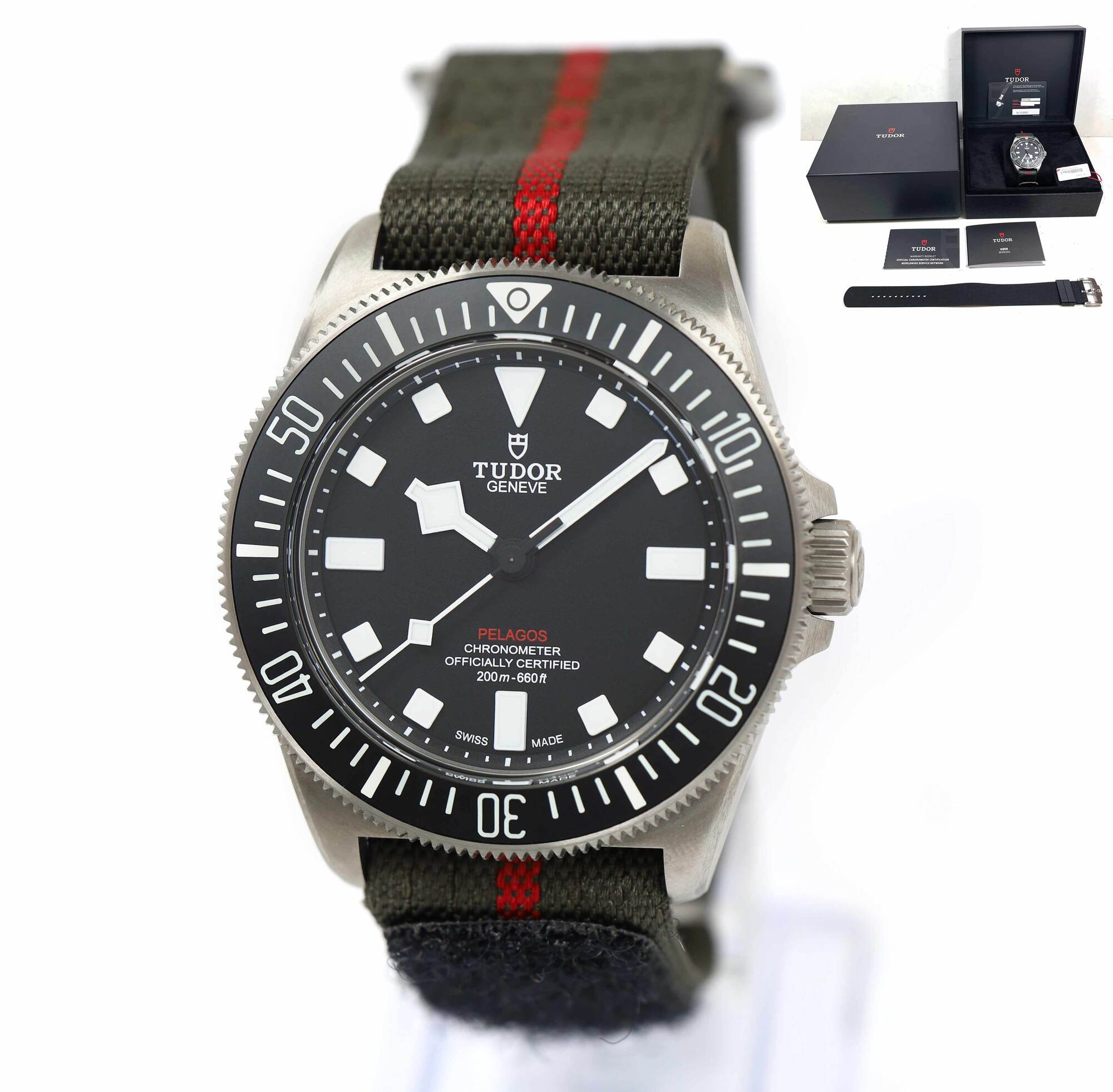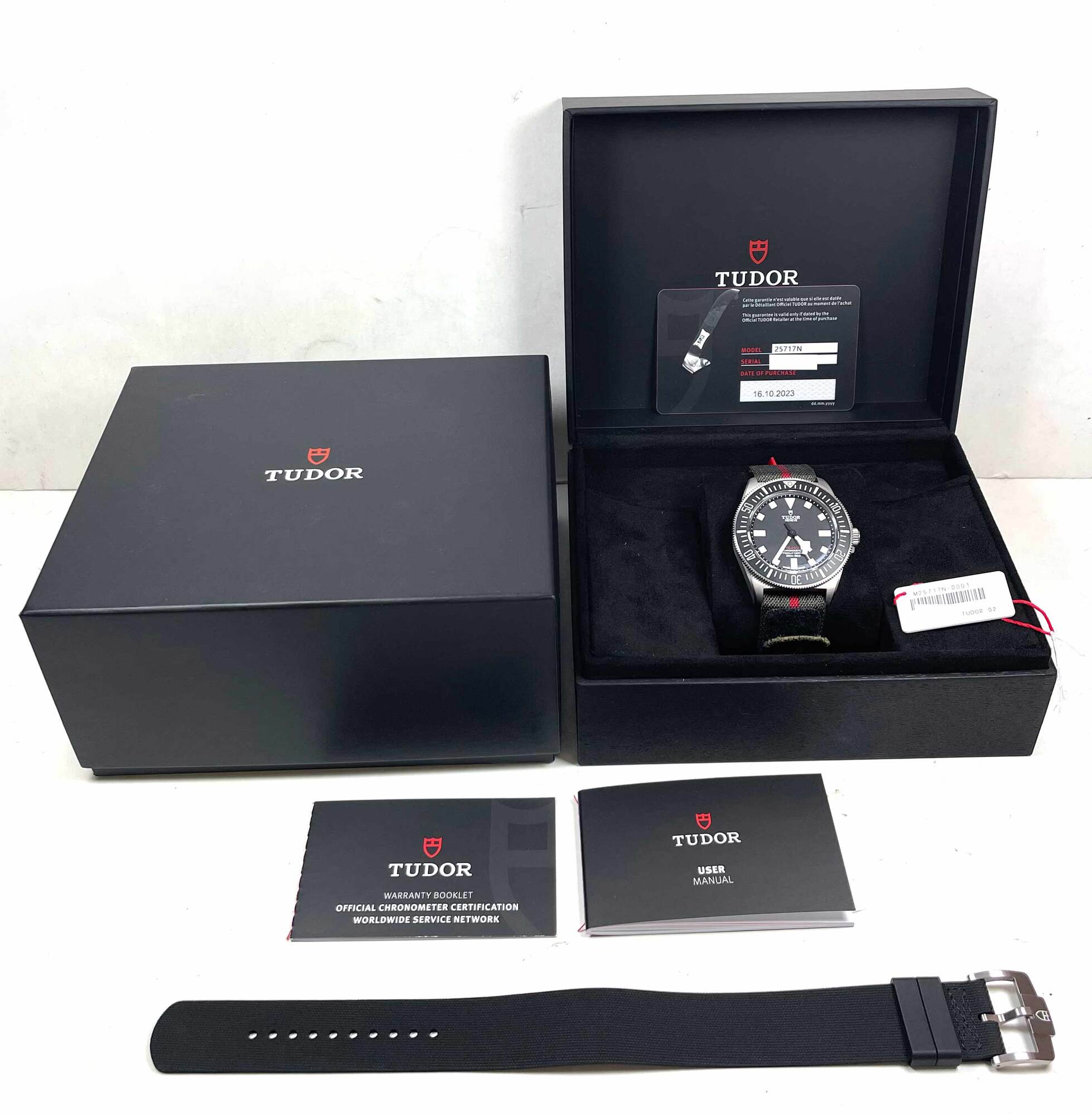 this tudor watch is new and comes with its box, booklets, hang tag, one additional black strap, and warranty card dated october 16th, 2023 as shown in the pictures attached. This watch is in stock and available to ship immediately!