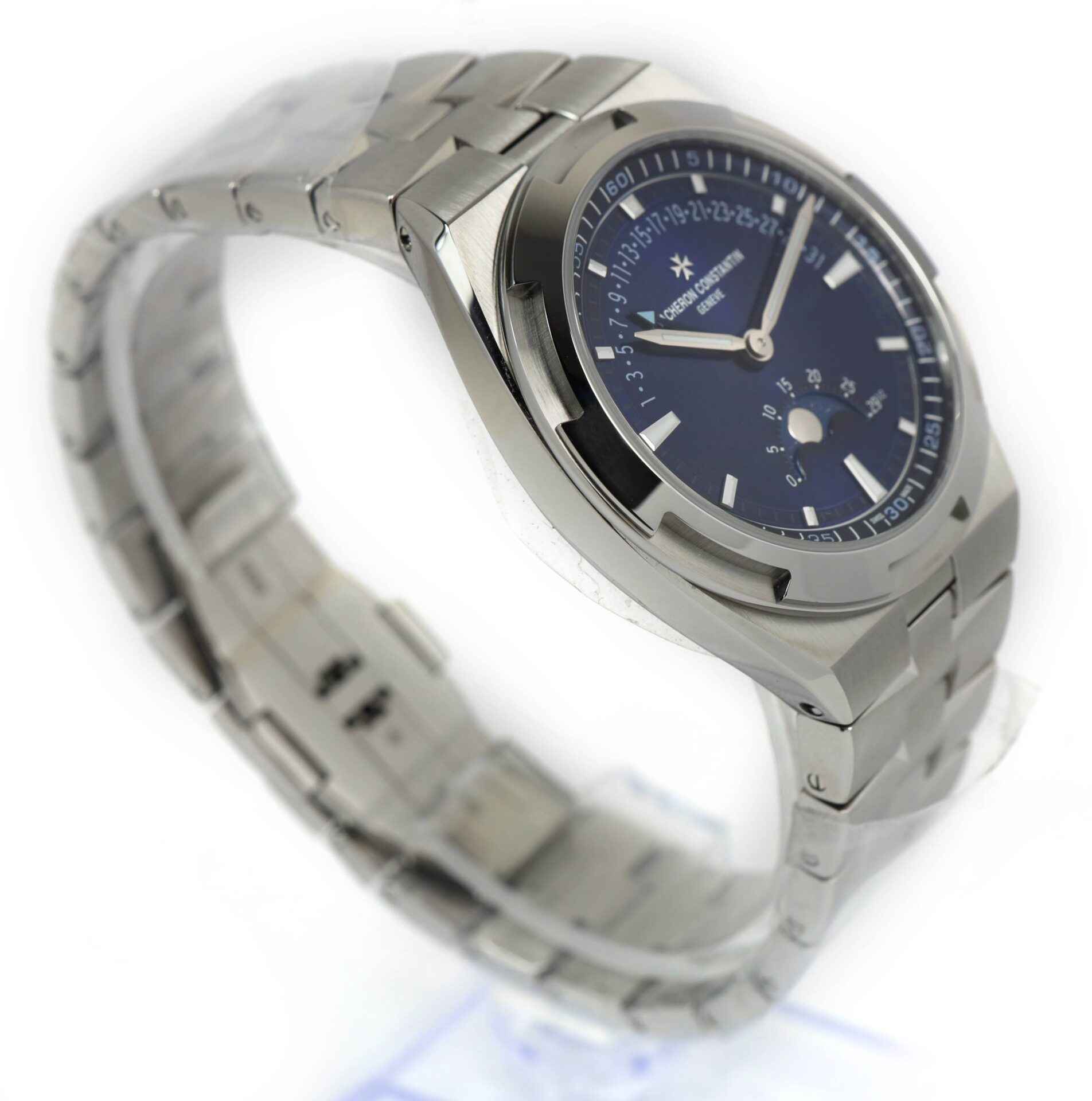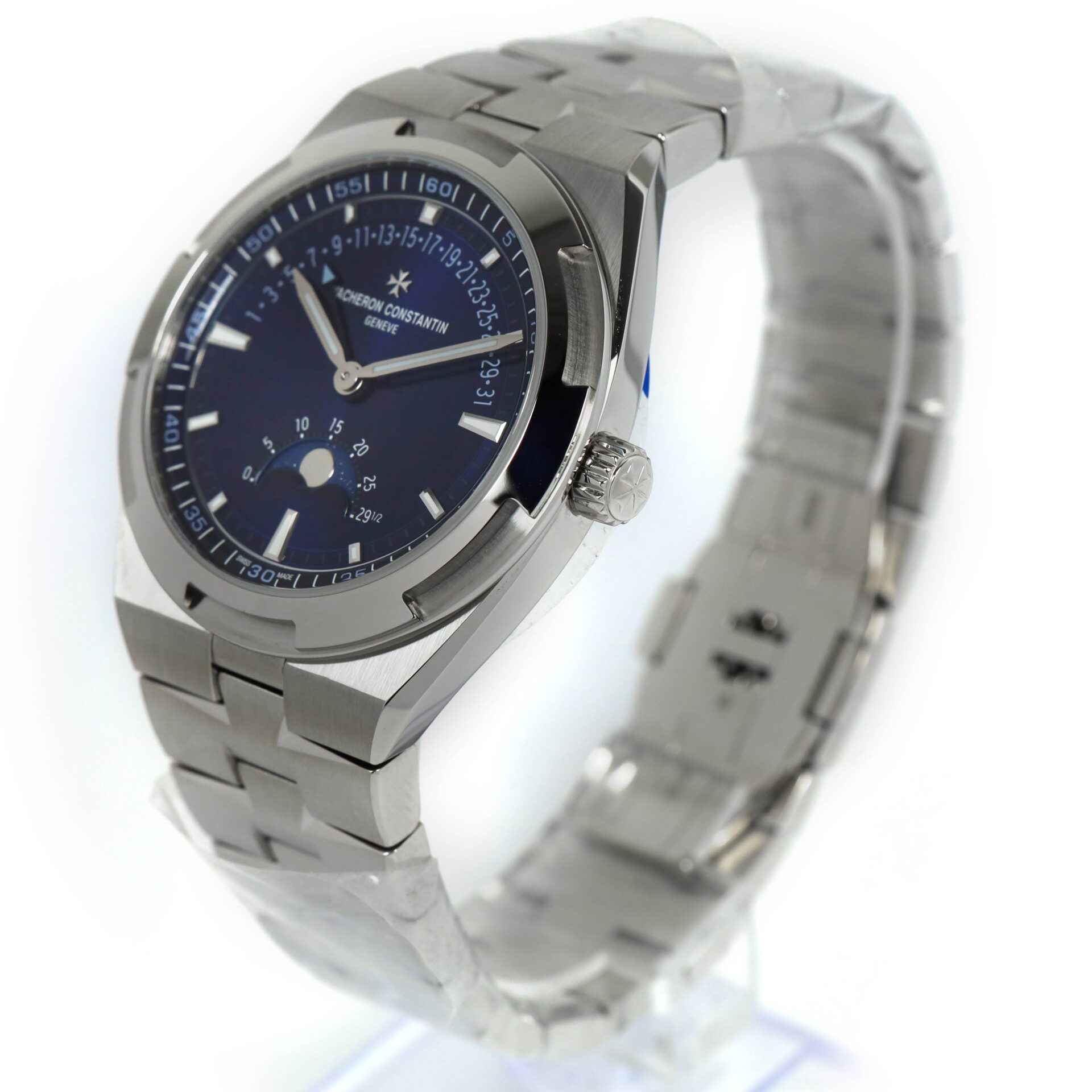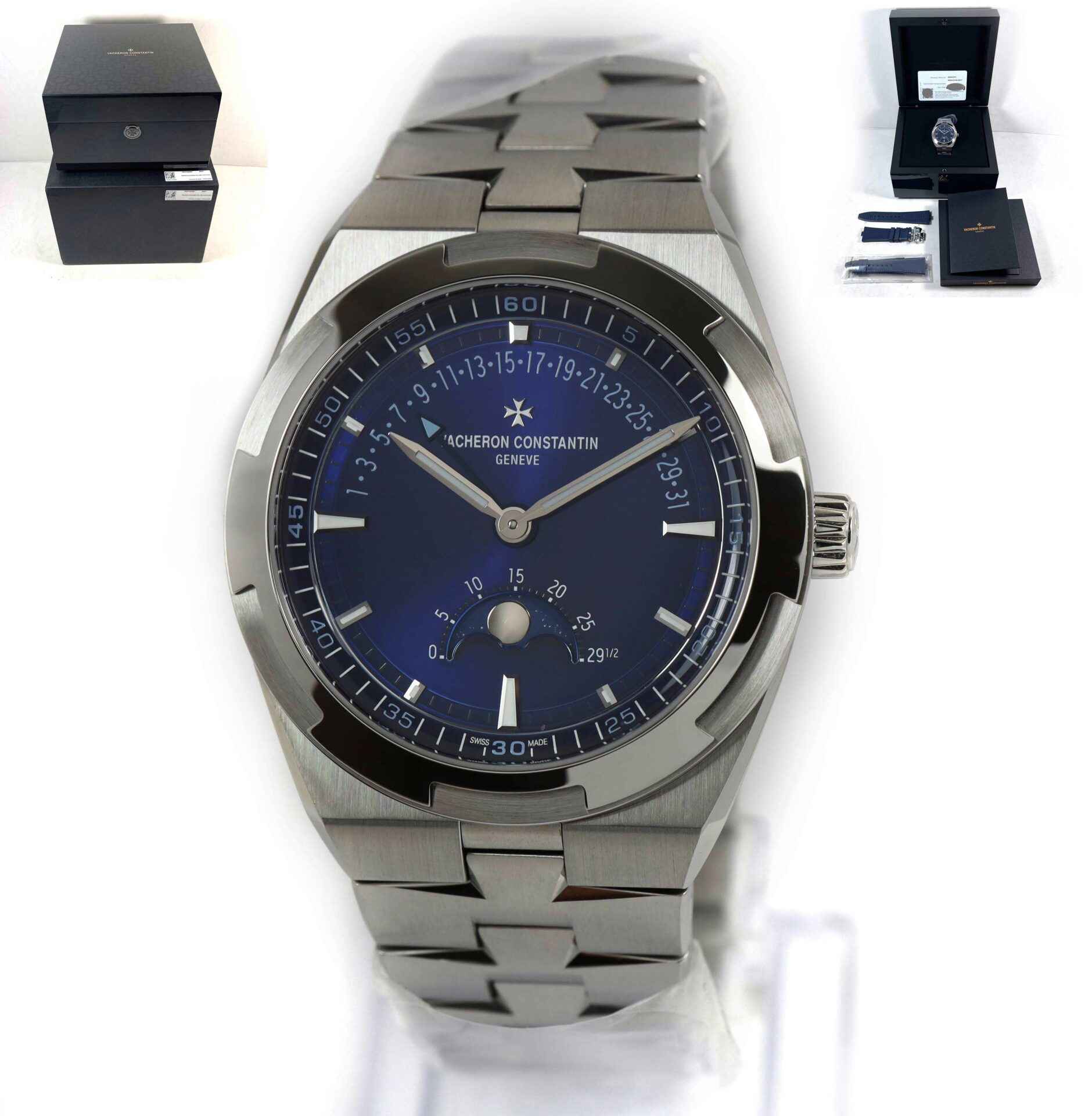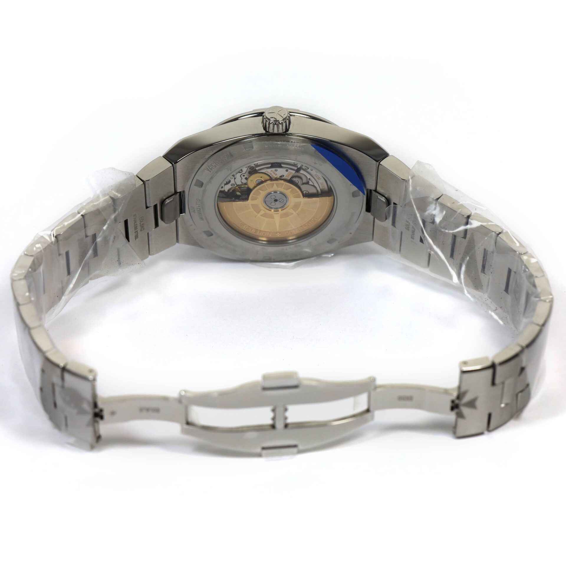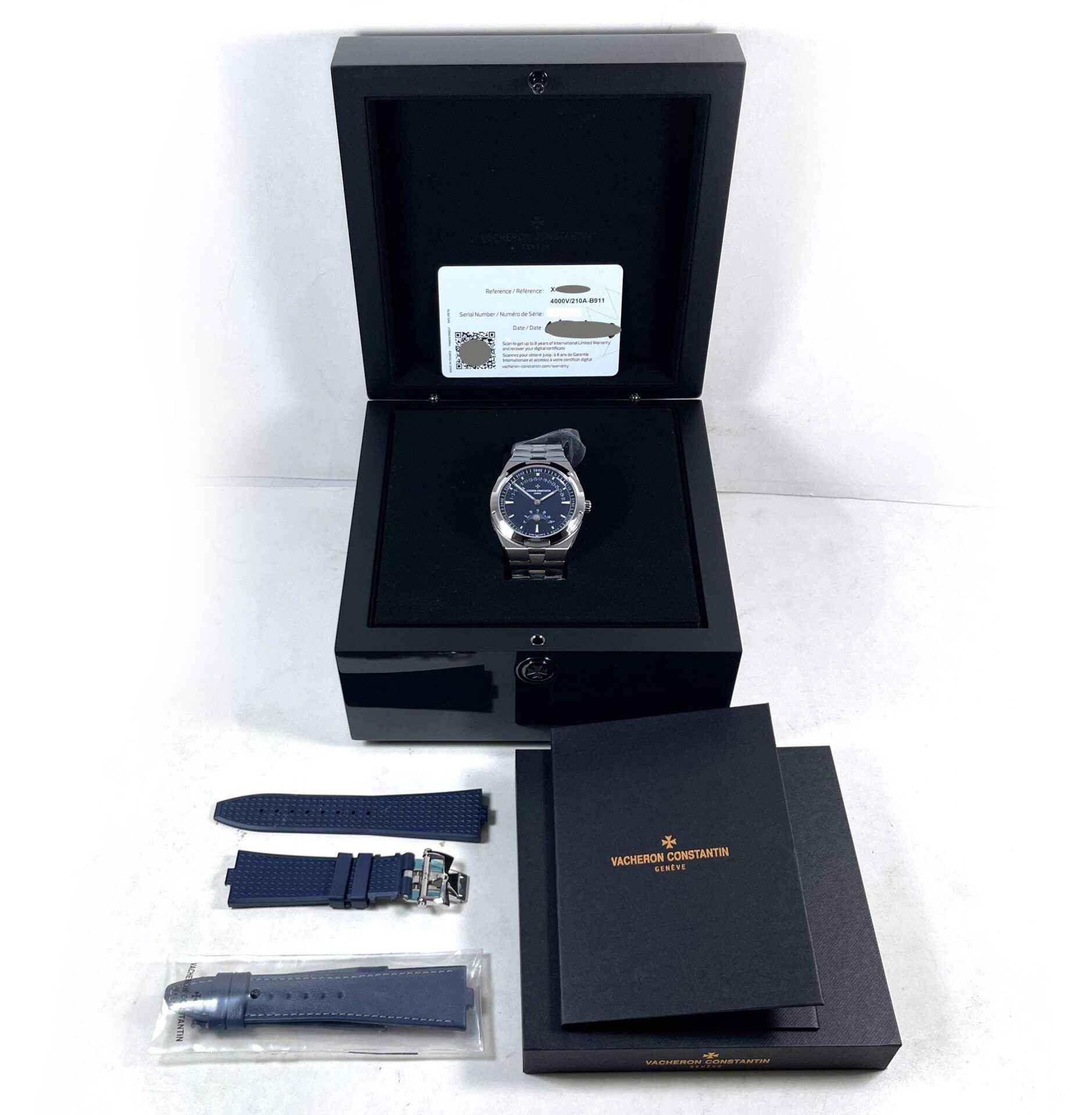 this vacheron constantin watch is new with the stickers on the bracelet and caseback and comes with its box, papers, two additional straps, and warranty card dated mid-2023.
