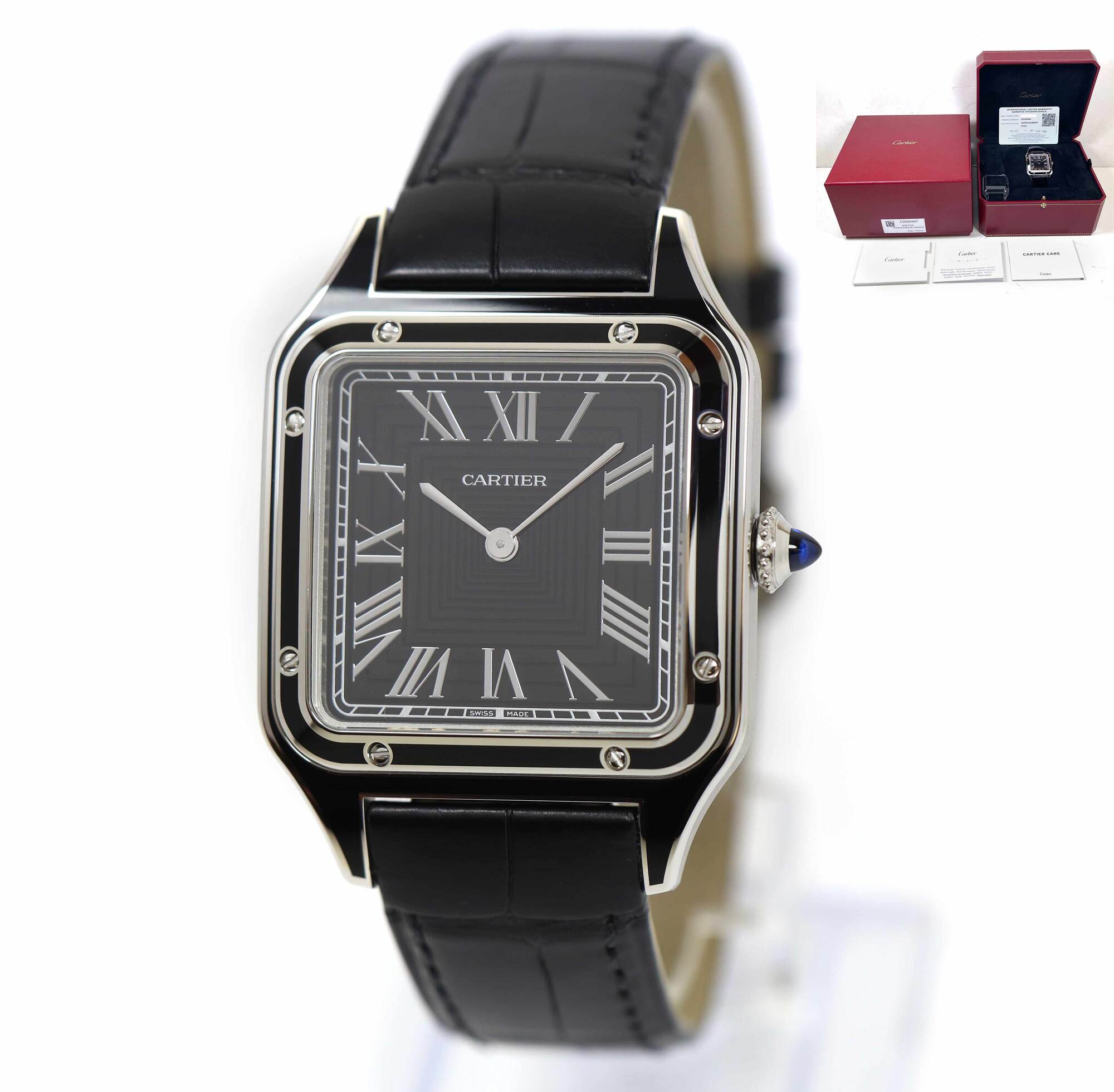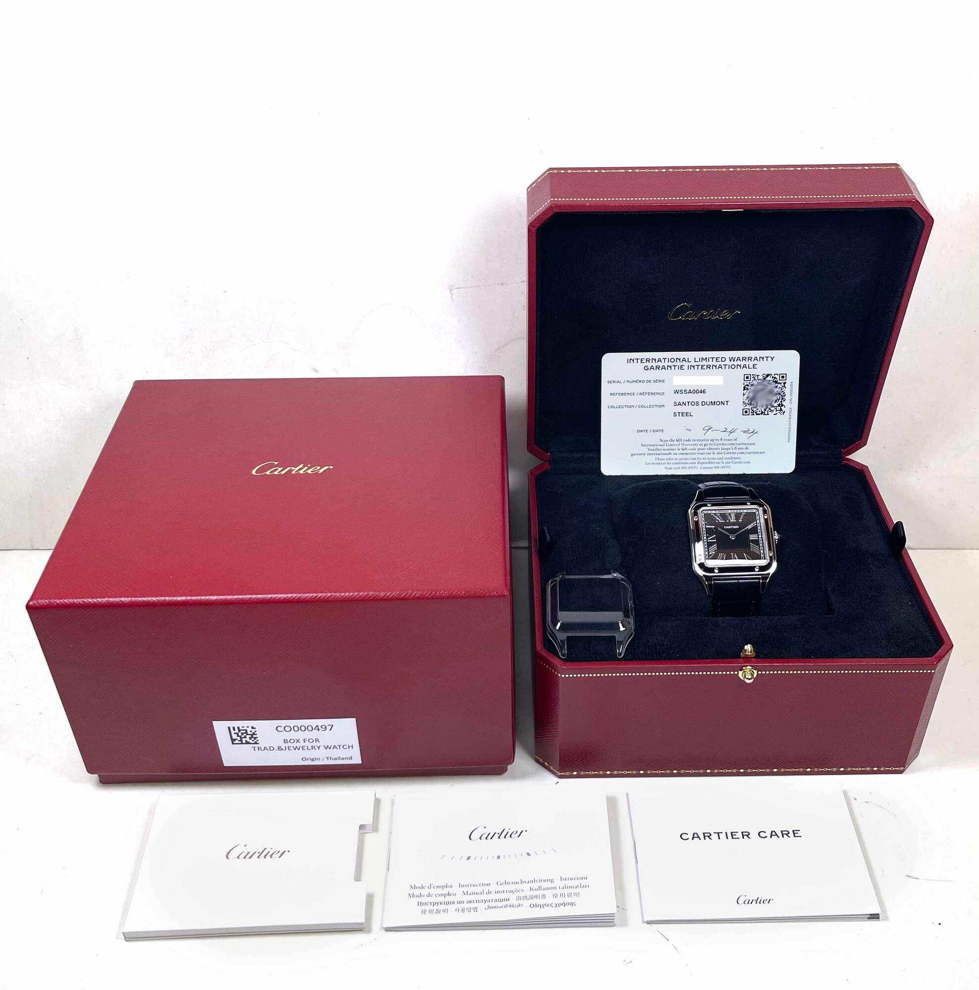 this cartier watch is new with the caseback sticker attached and comes with its box, booklets, and warranty card dated september 24th, 2024 as shown in the pictures attached. This watch is in stock and available to ship immediately!