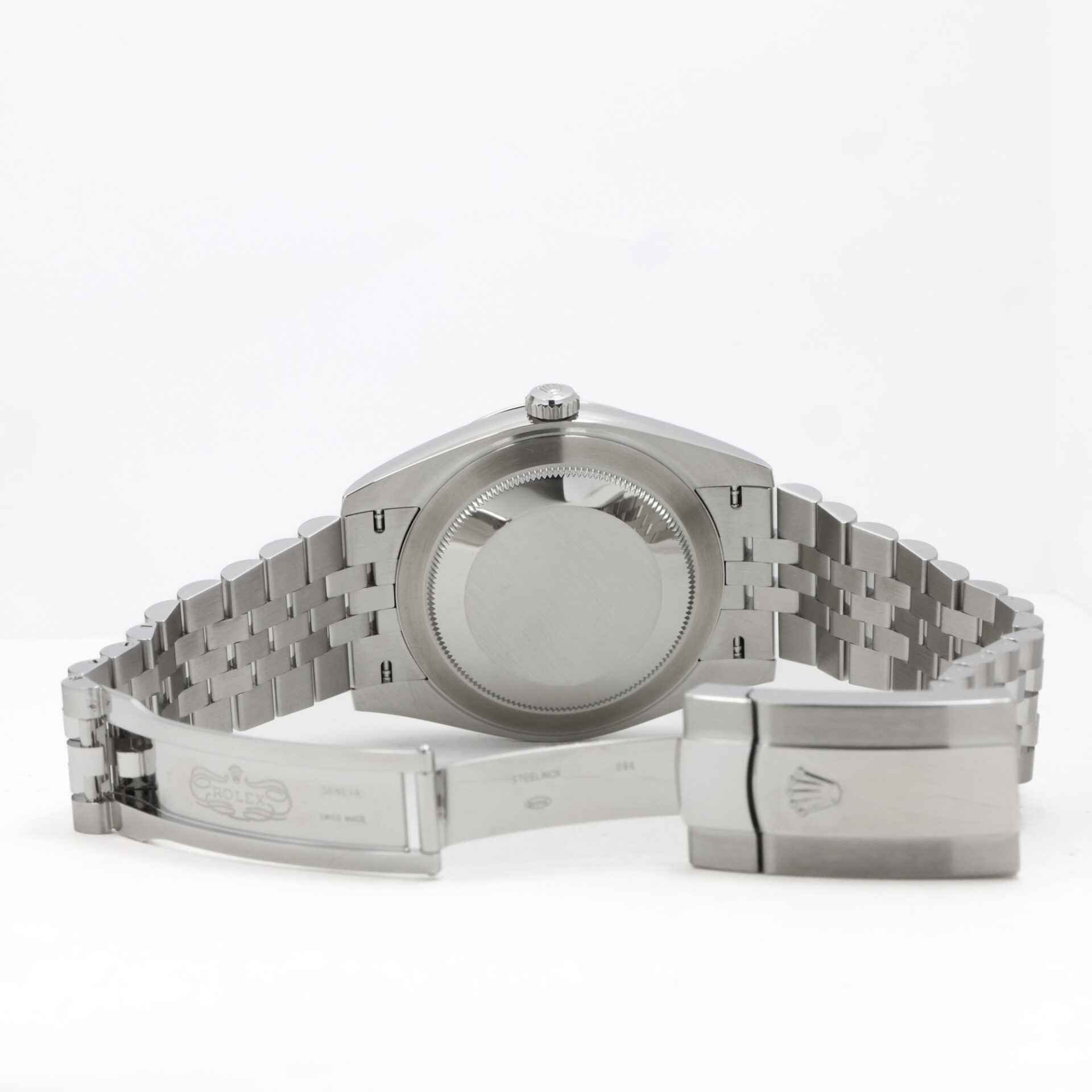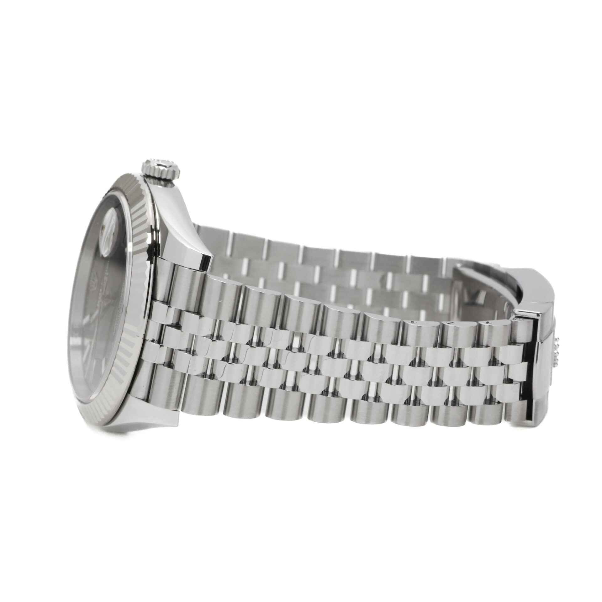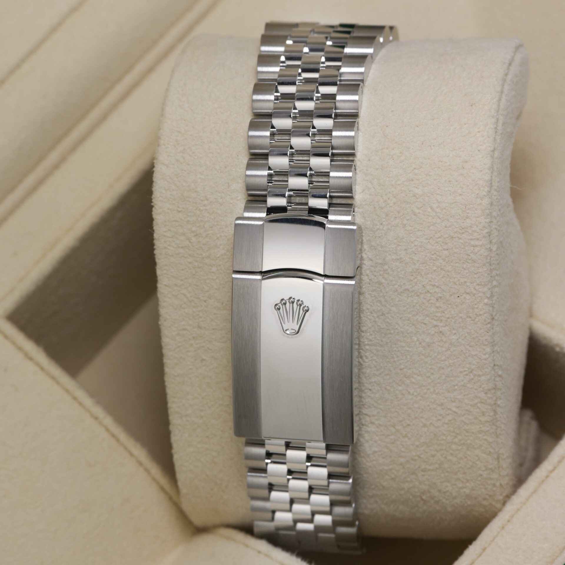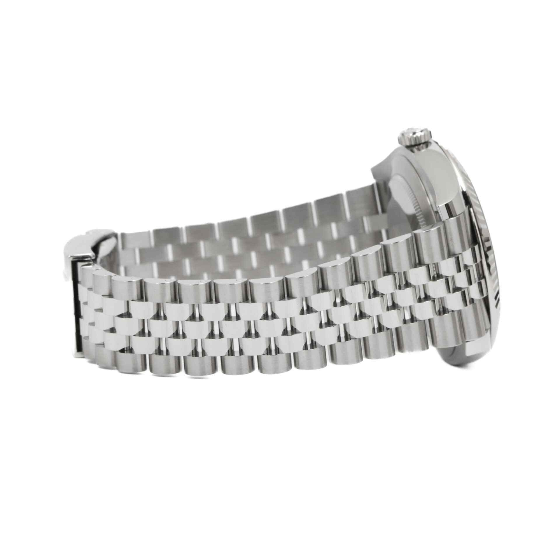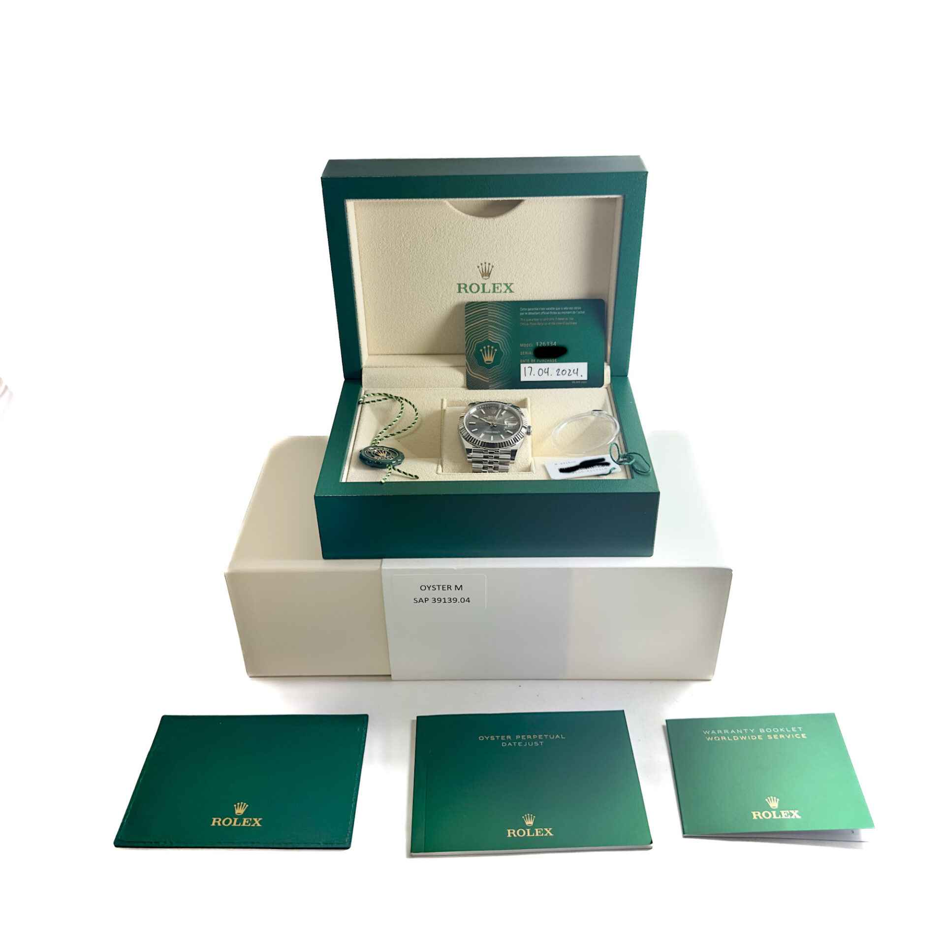 this rolex datejust is new and comes with its box, booklets, both hang tags, bezel protector, and warranty card dated april 17th, 2024. It features a rhodium dial with a fluted bezel on a jubilee bracelet.