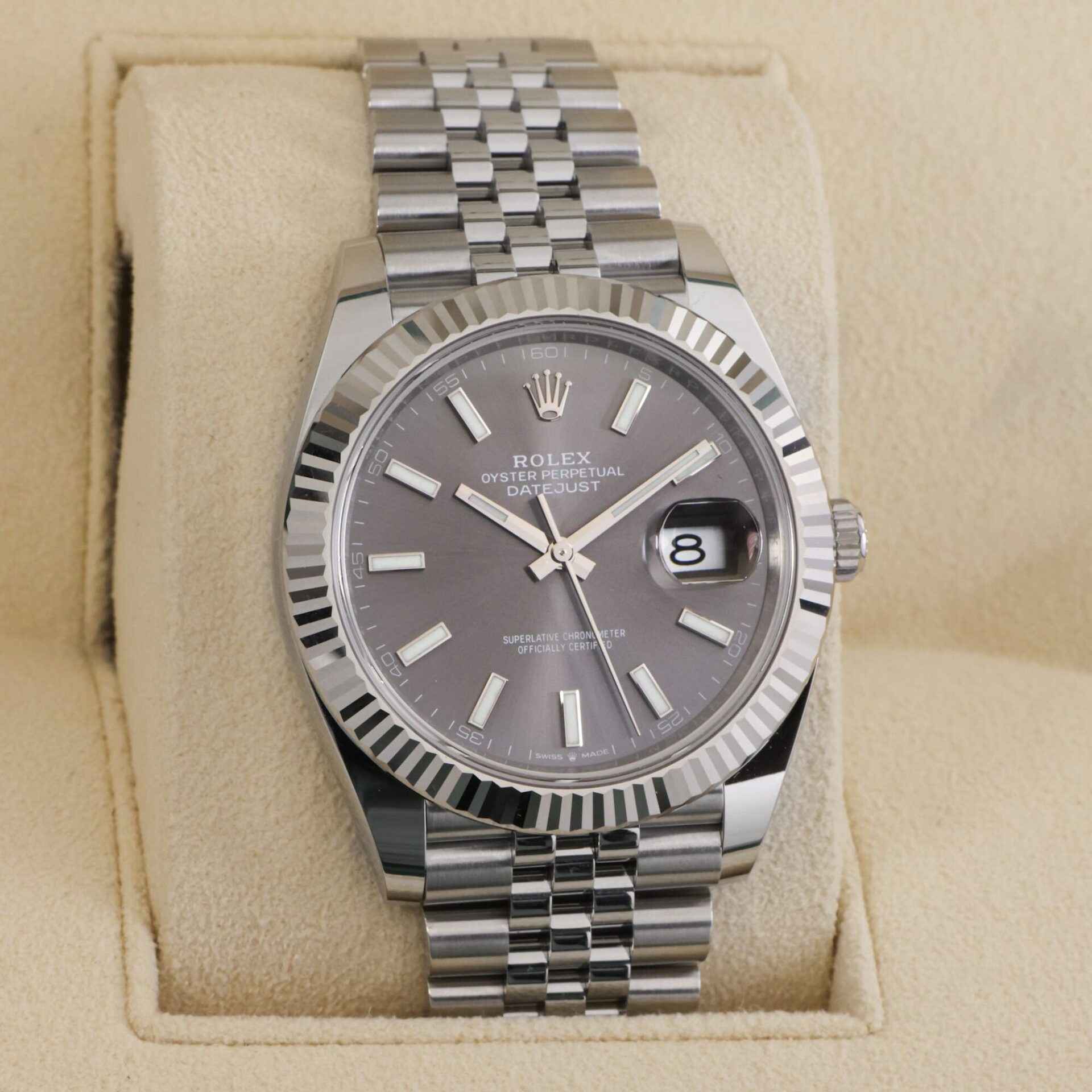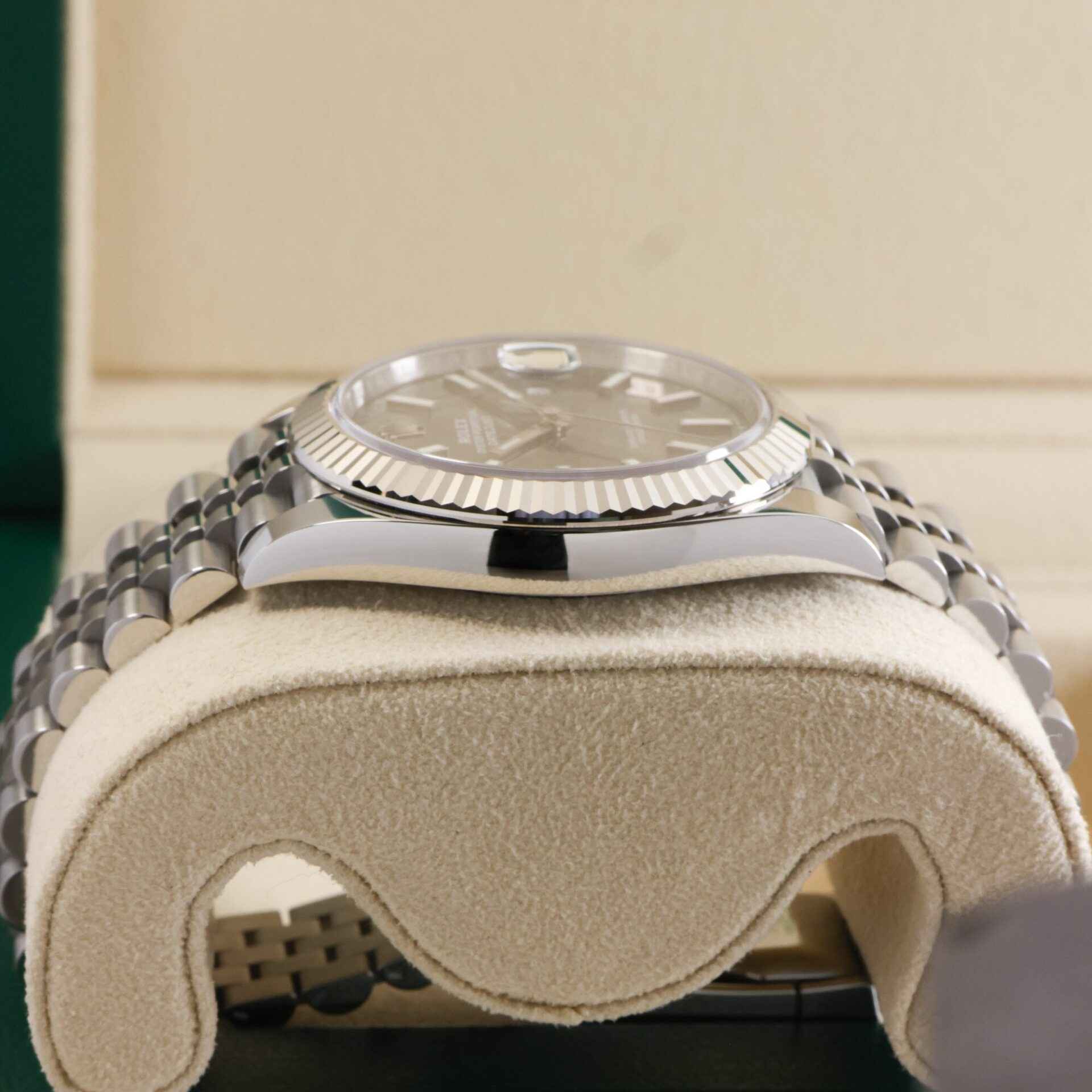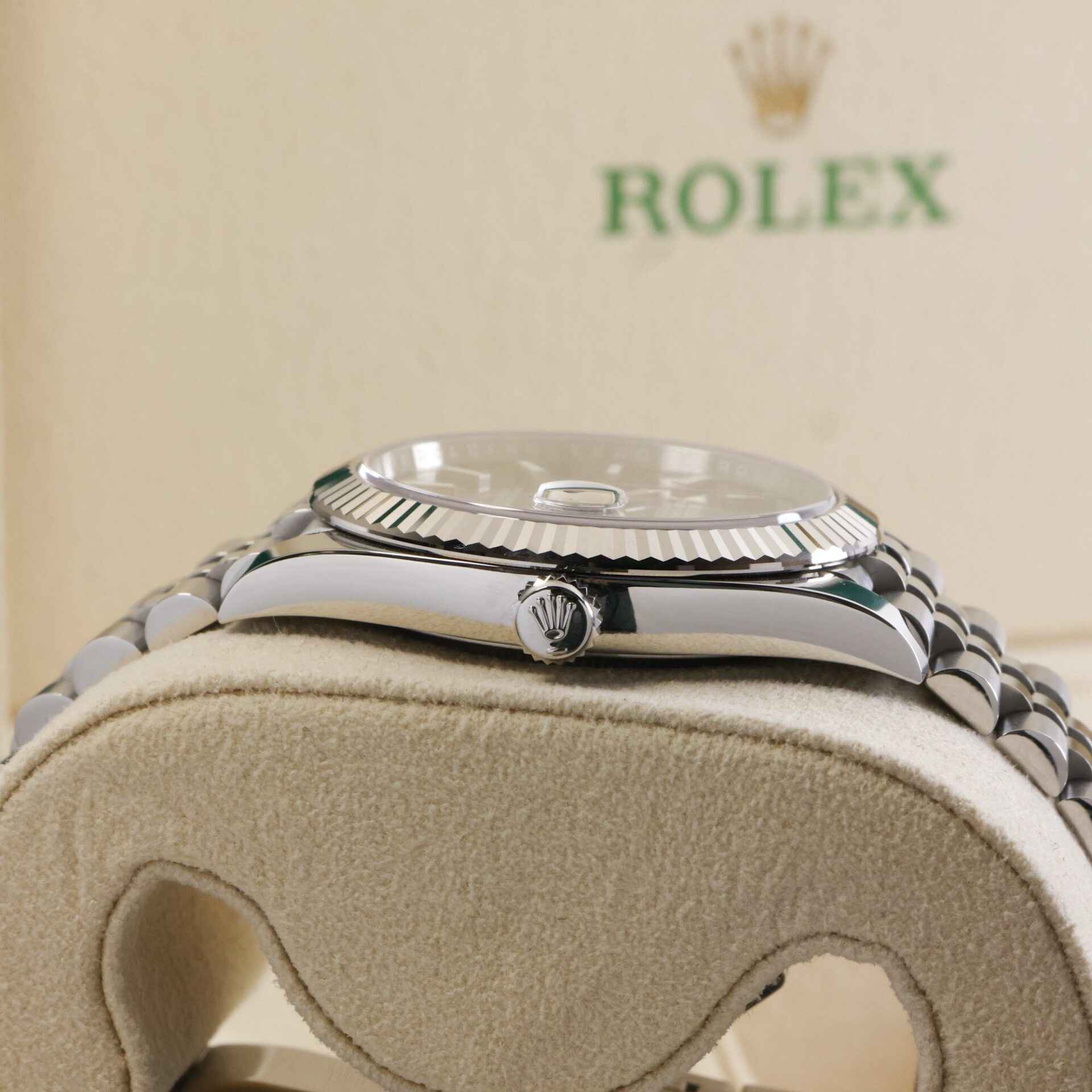 THIS ROLEX DATEJUST IS NEW AND COMES WITH ITS BOX, BOOKLETS, BOTH HANG TAGS, BEZEL PROTECTOR, AND WARRANTY CARD DATED APRIL 17TH, 2024. IT FEATURES A RHODIUM DIAL WITH A FLUTED BEZEL ON A JUBILEE BRACELET.