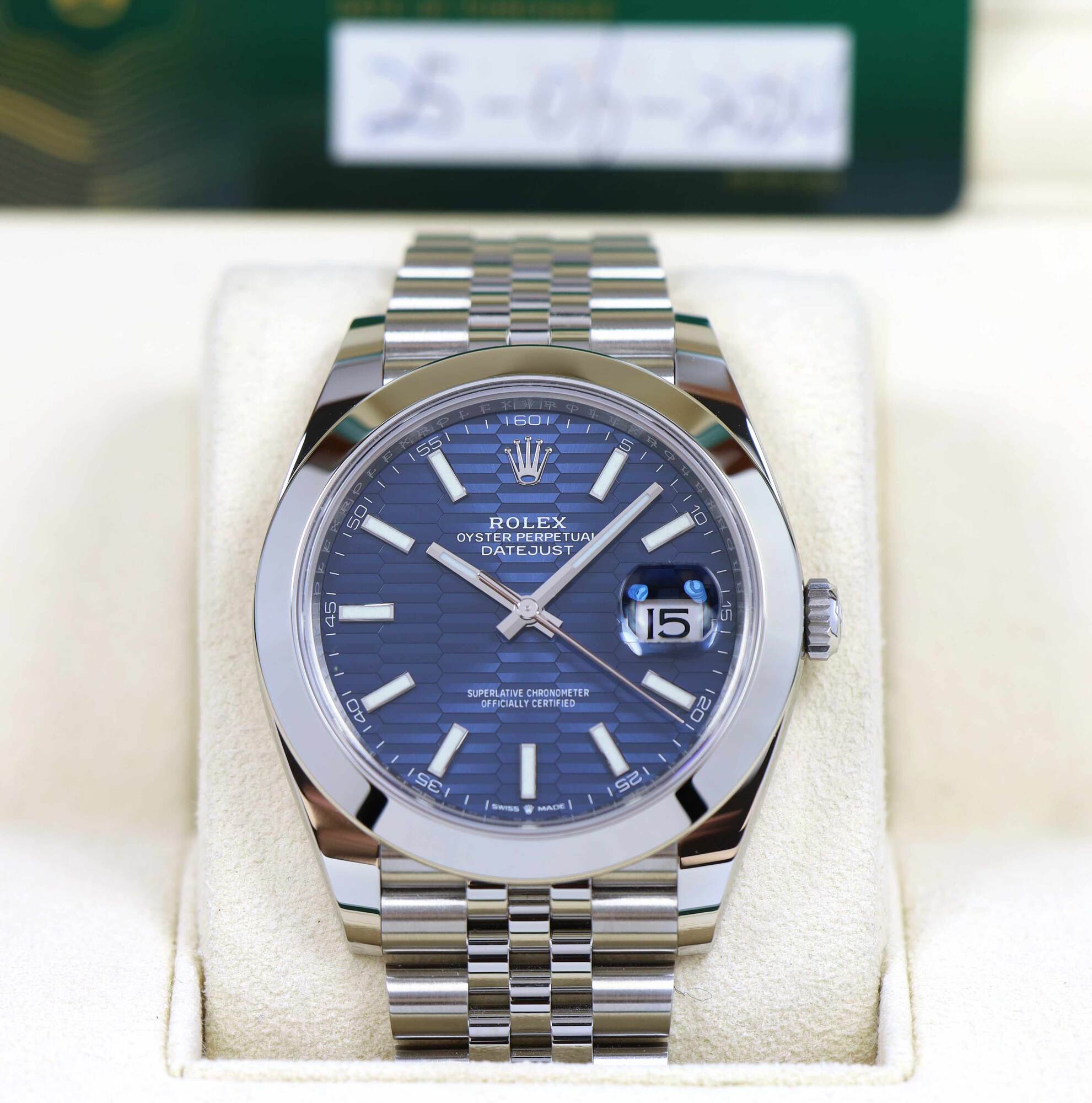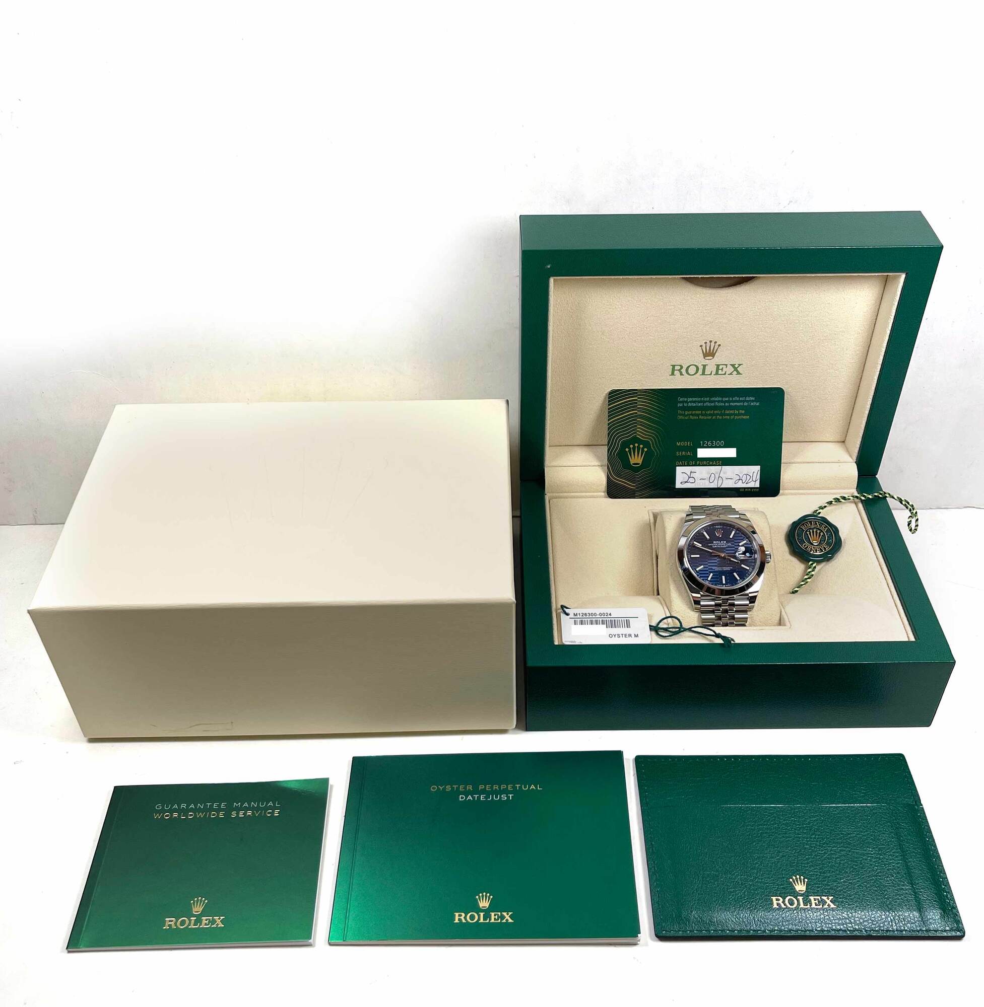 this rolex datejust is new and comes with its box, booklets, both hang tags, and warranty card dated june 25th, 2024 as shown in the pictures attached. This watch is in stock and available to ship immediately!
