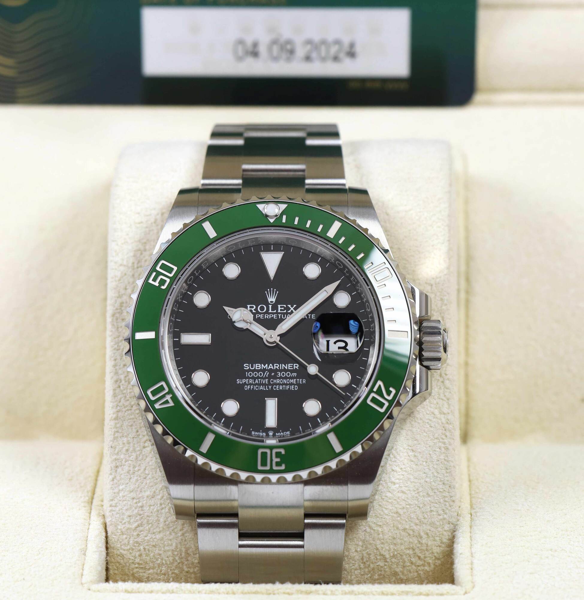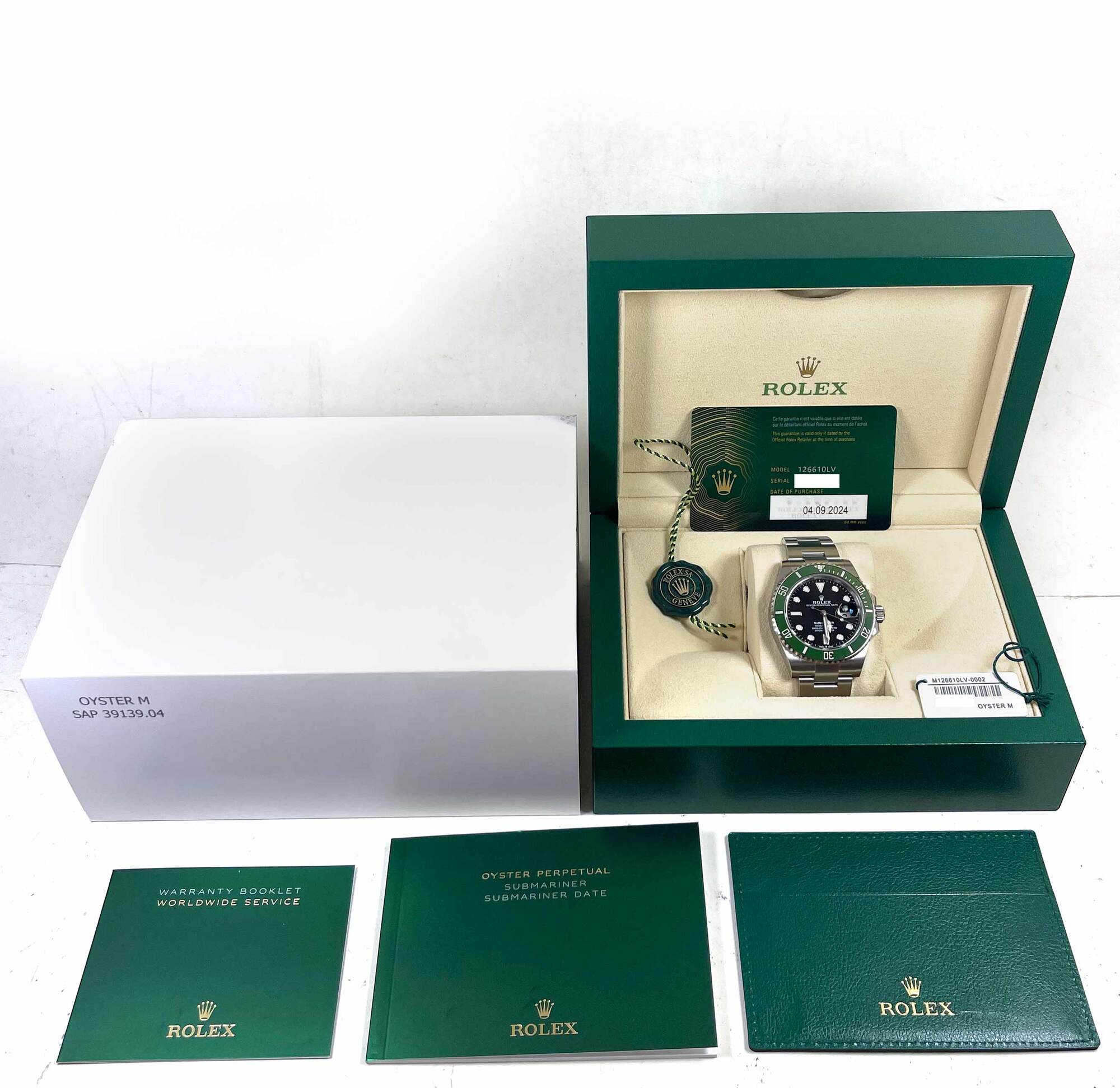 THIS ROLEX IS NEW AND COMES WITH ITS BOX, BOOKLETS, BOTH HANG TAGS, AND WARRANTY CARD DATED SEPTEMBER 4TH, 2024 AS SHOWN IN THE PICTURES ATTACHED. THIS WATCH IS IN STOCK AND AVAILABLE TO SHIP IMMEDIATELY!