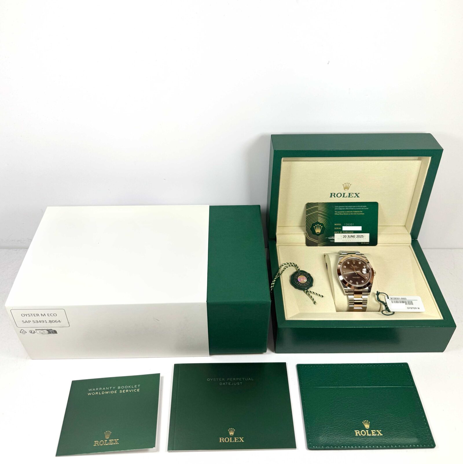 this rolex is new and comes with its box, booklets, both hang tags, and warranty card dated june 20th, 2025 as shown in the pictures attached. This watch is in stock and available to ship immediately!