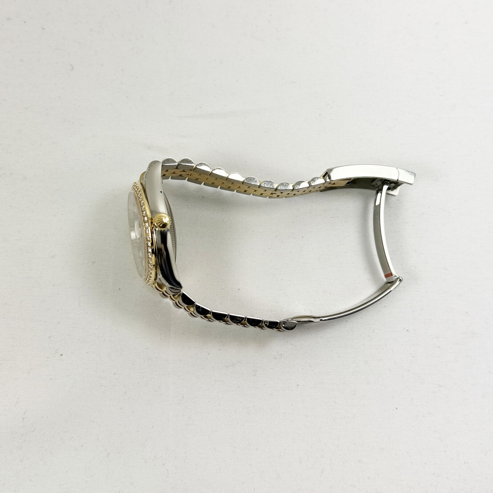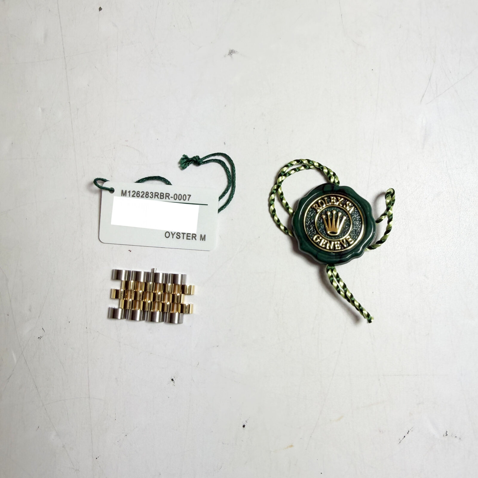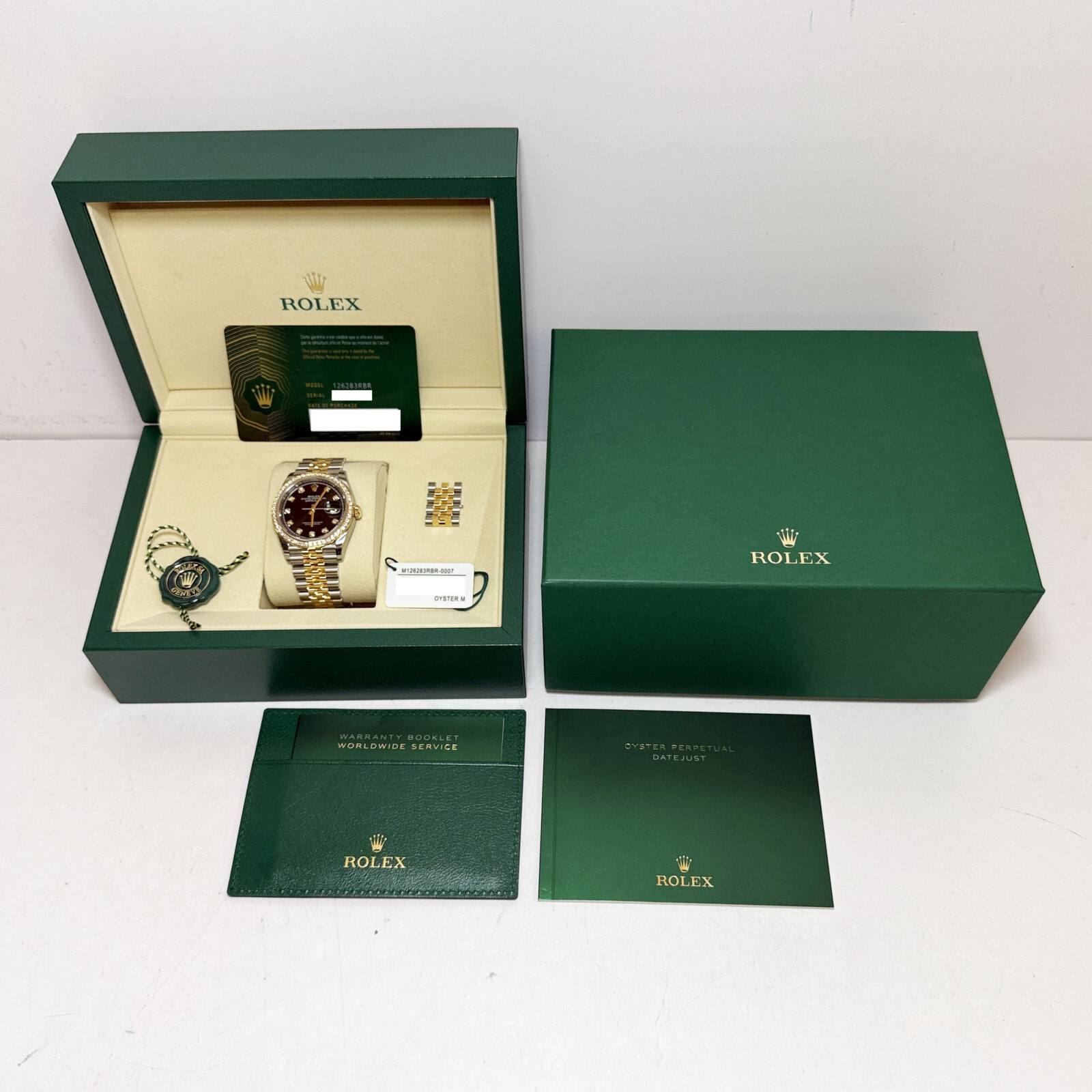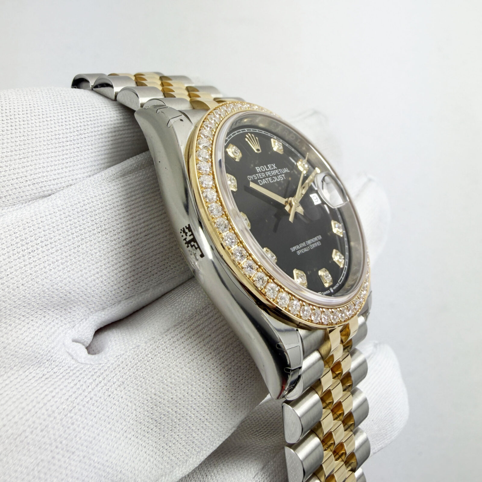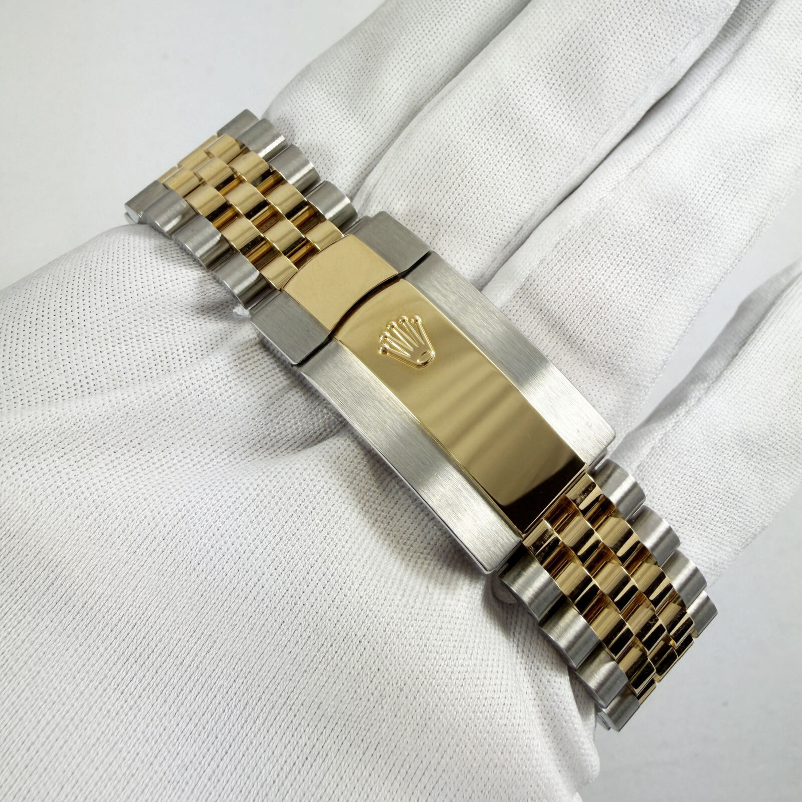 this rolex datejust watch is new with stickers and comes with its box, booklets, hangtags, extra links, and warranty card dated september, 2025. The photos shown are of the exact watch being sold and accurately represent its condition. This watch is in stock and ready to ship immediately!