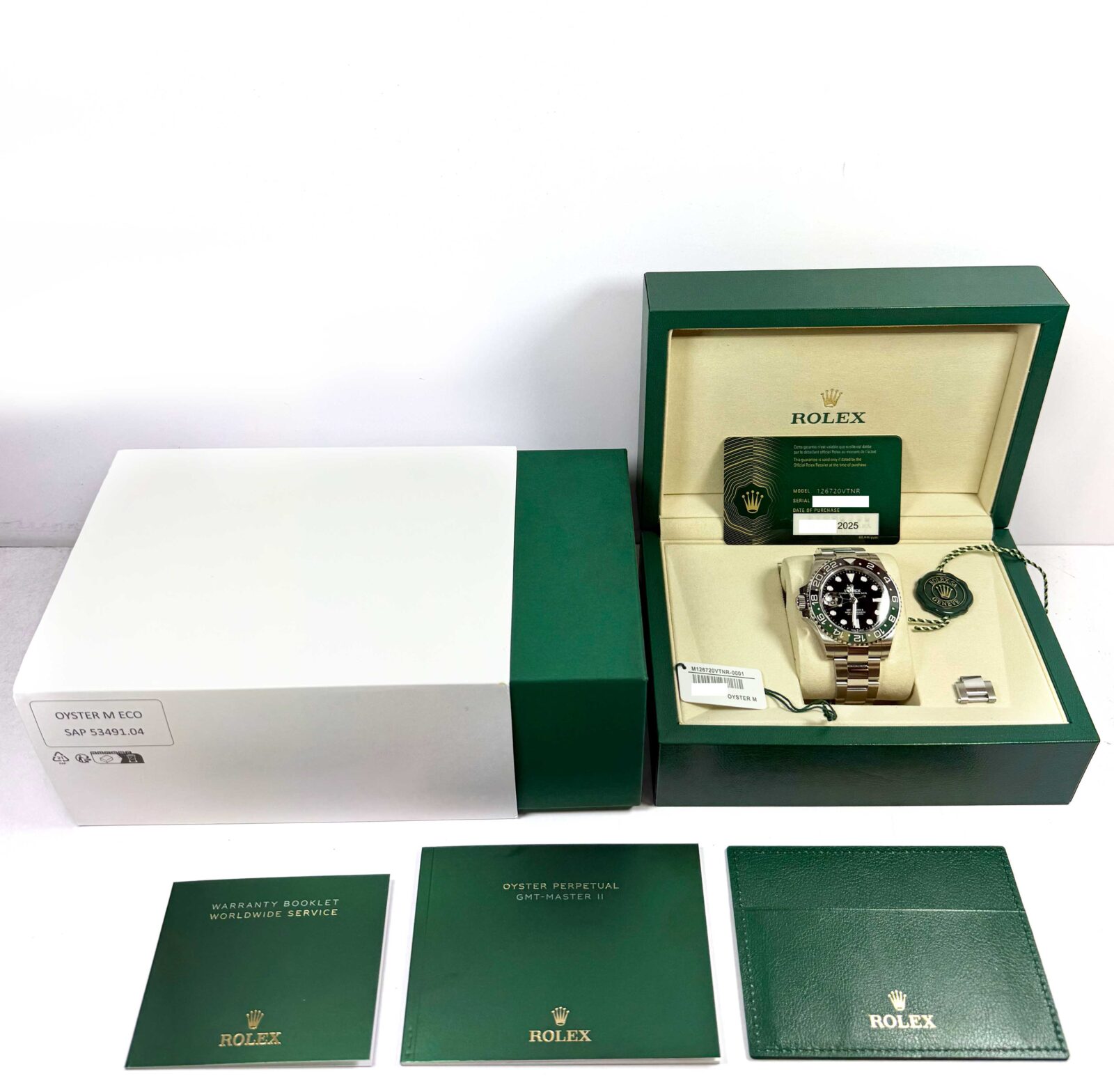 this rolex is new and comes with its box, booklets, both hang tags, one spare link, and warranty card dated 2025 as shown in the pictures attached. This watch is in stock and available to ship immediately!