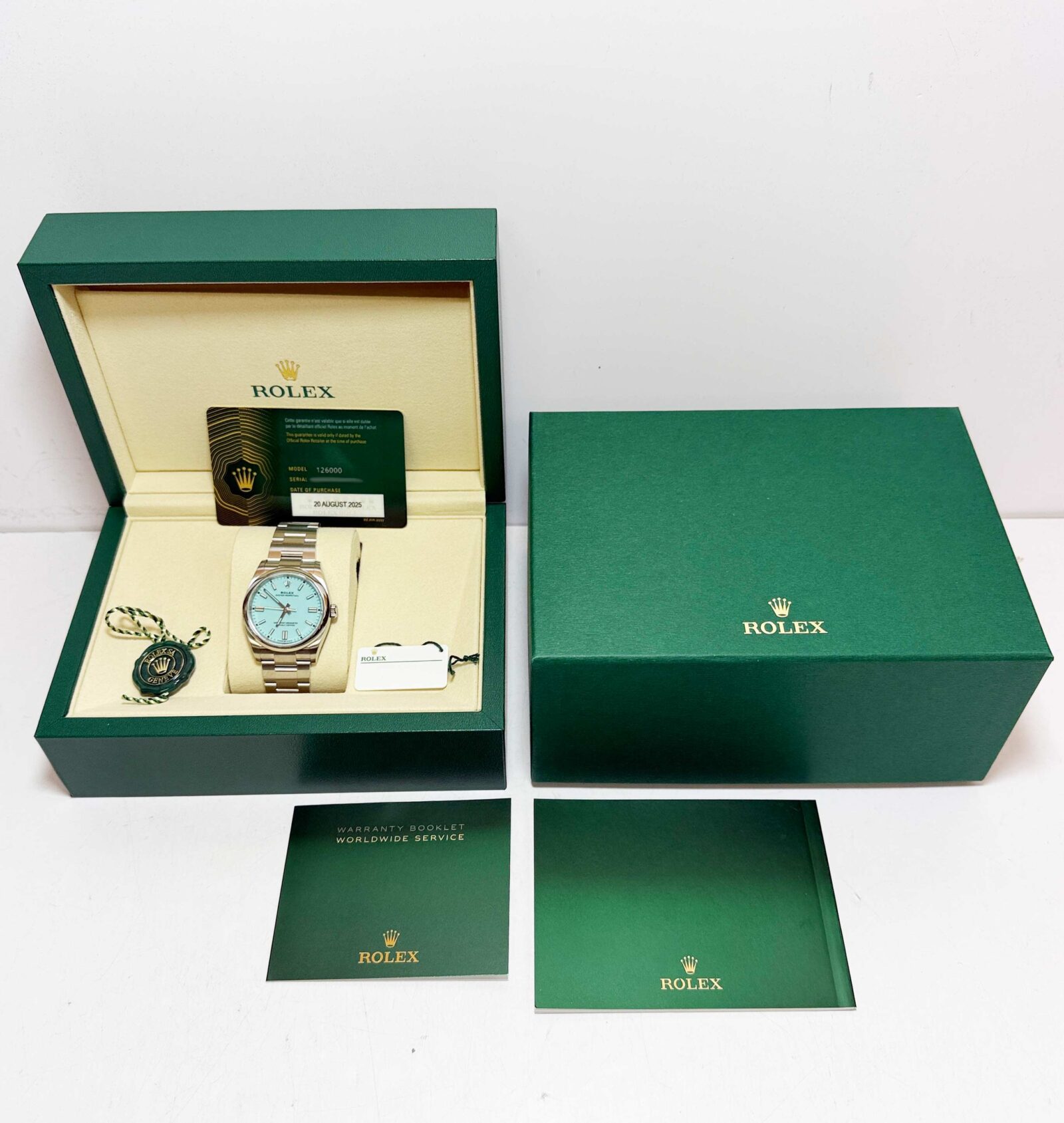 this rolex watch is new and comes with its box, booklets, hang tags, and warranty card dated august 20th, 2025. The photos being shown are of the exact watch being sold and accurately represent its condition. This watch is in stock and ready to ship immediately!
