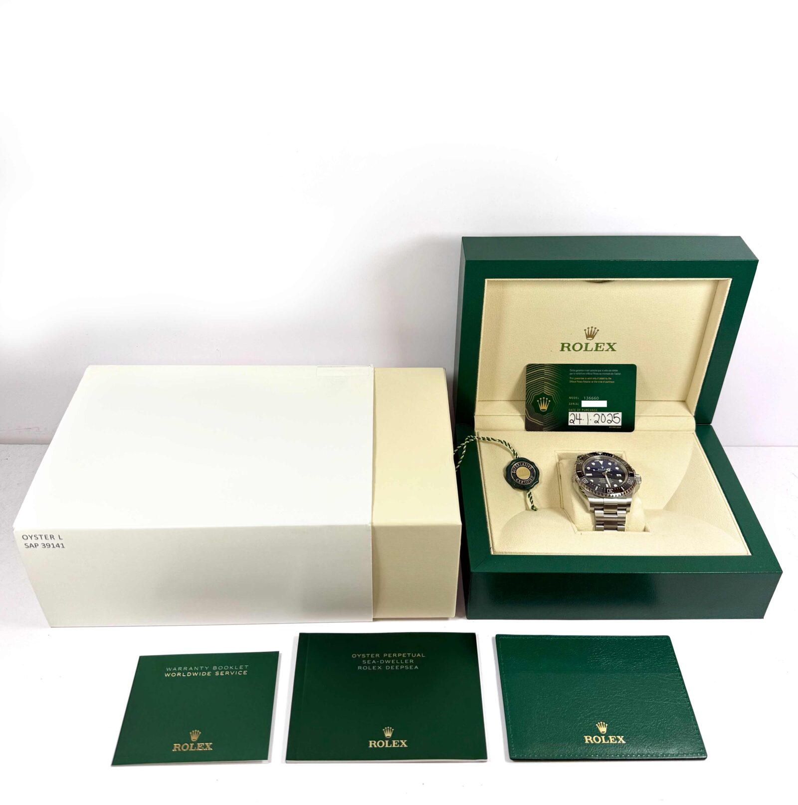 THIS ROLEX IS NEW WITH SOME STICKERS ATTACHED AND COMES WITH ITS BOX, BOOKLETS, GREEN HANG TAG, AND WARRANTY CARD DATED JANUARY 24TH, 2025 AS SHOWN IN THE PICTURES ATTACHED. THIS WATCH IS IN STOCK AND AVAILABLE TO SHIP IMMEDIATELY!