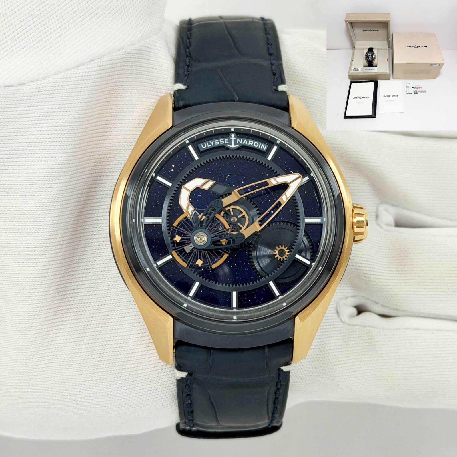 this brand new ulysse nardin watch comes with its box, hangtag, booklets, and warranty card dated august 1st, 2025. The photos shown are of the exact watch being sold and accurately represent its condition. This watch is in stock and ready to ship immediately!