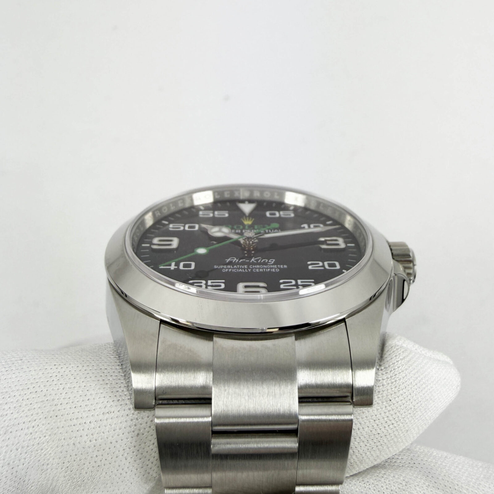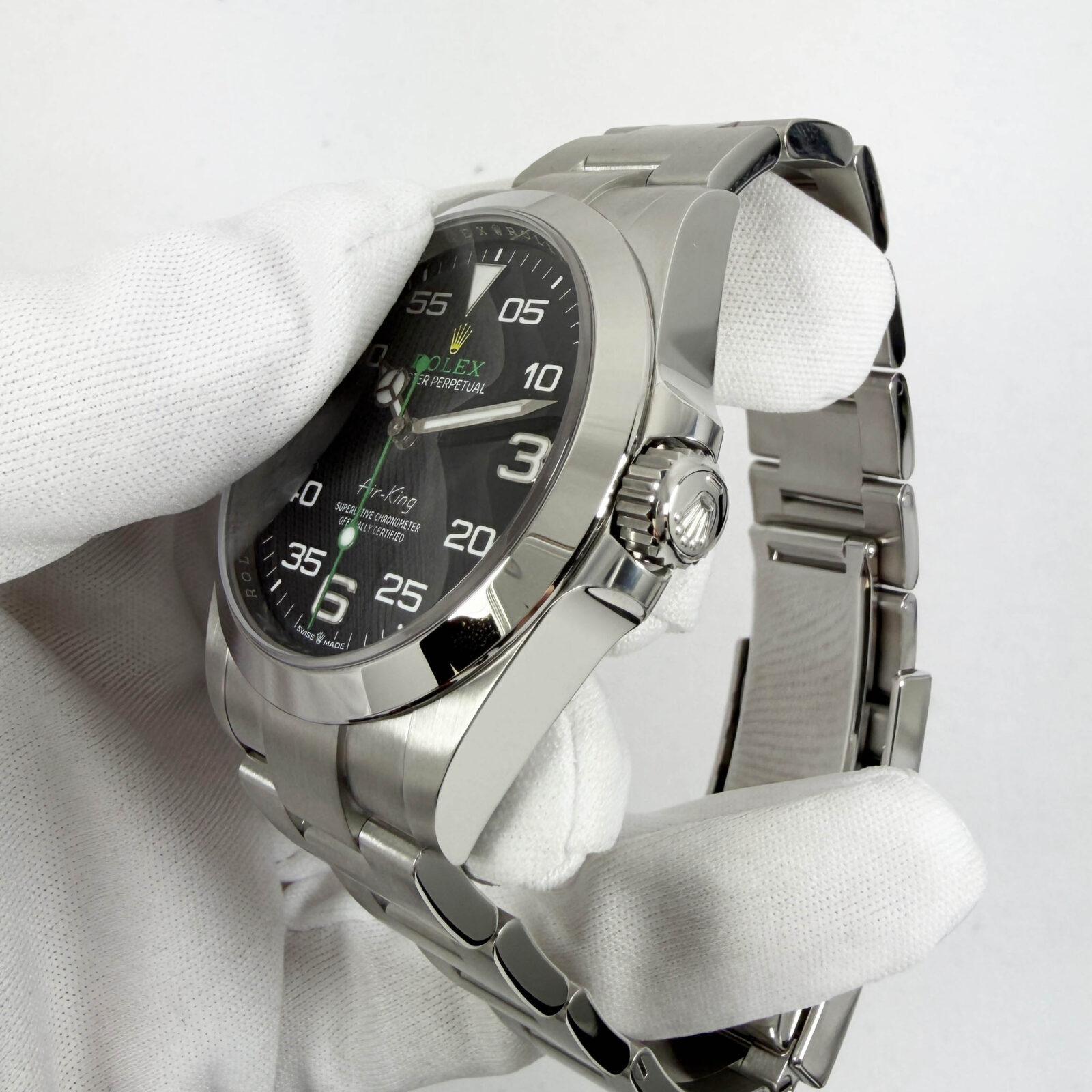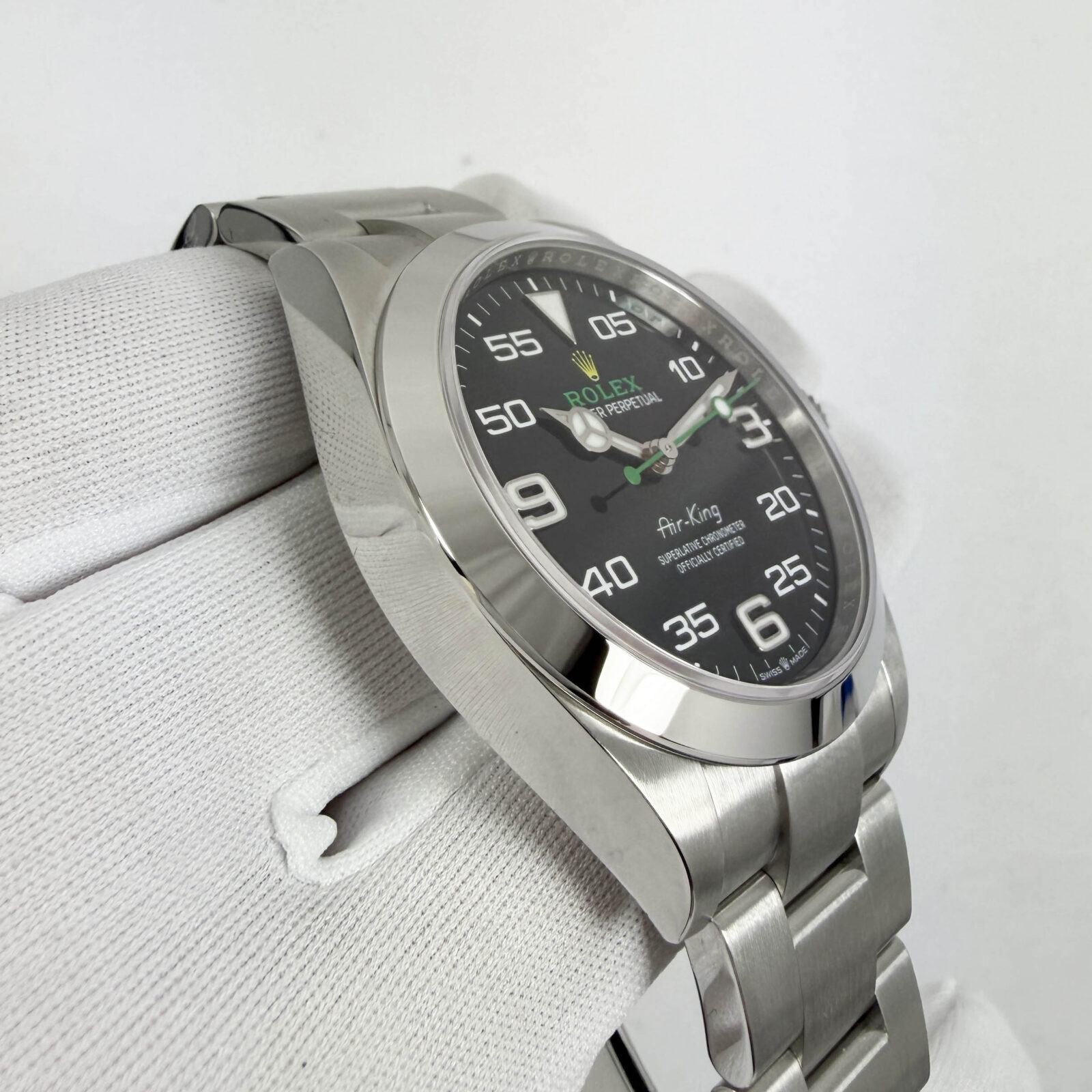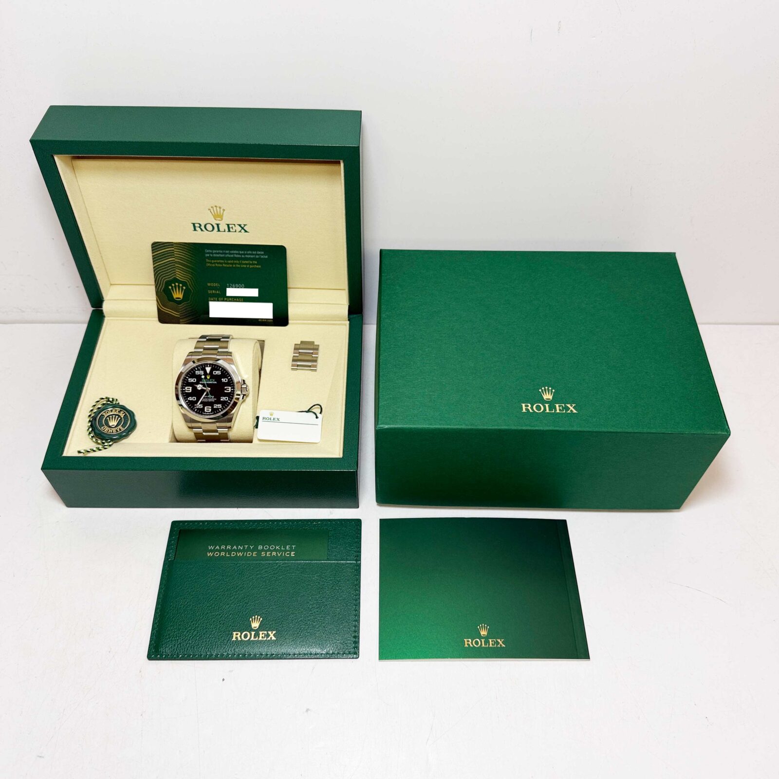 this brand new rolex air king watch comes with its box, booklets, extra links, hangtags, and warranty card dated january, 2026. The photos shown are of the exact watch being sold and accurately represent its condition. This watch is in stock and ready to ship immediately!