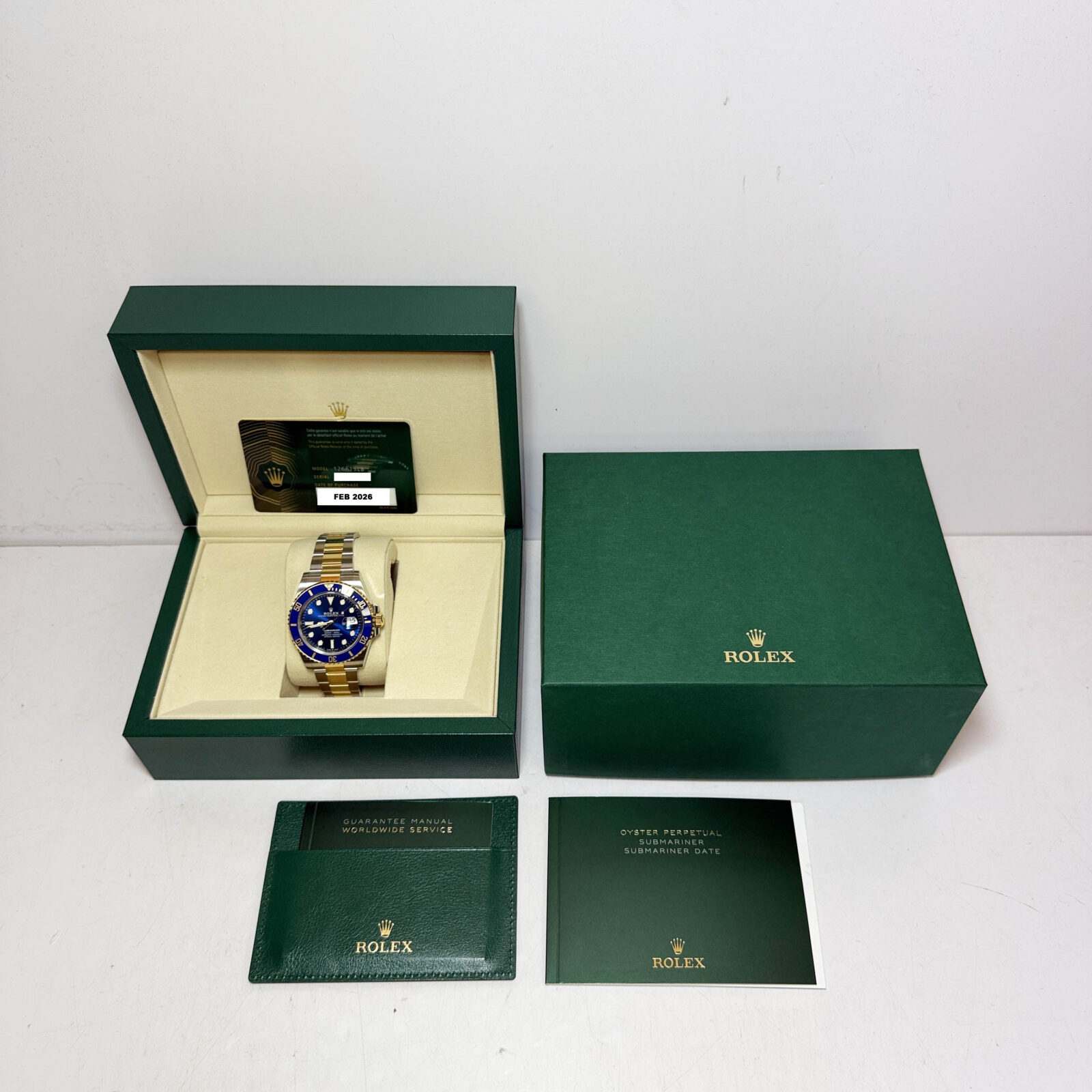 this brand new rolex submariner date watch comes with its box, booklets, and warranty card dated february 2026. The photos shown are of the exact watch being sold and accurately represent its condition. This watch is in stock and ready to ship immediately!
