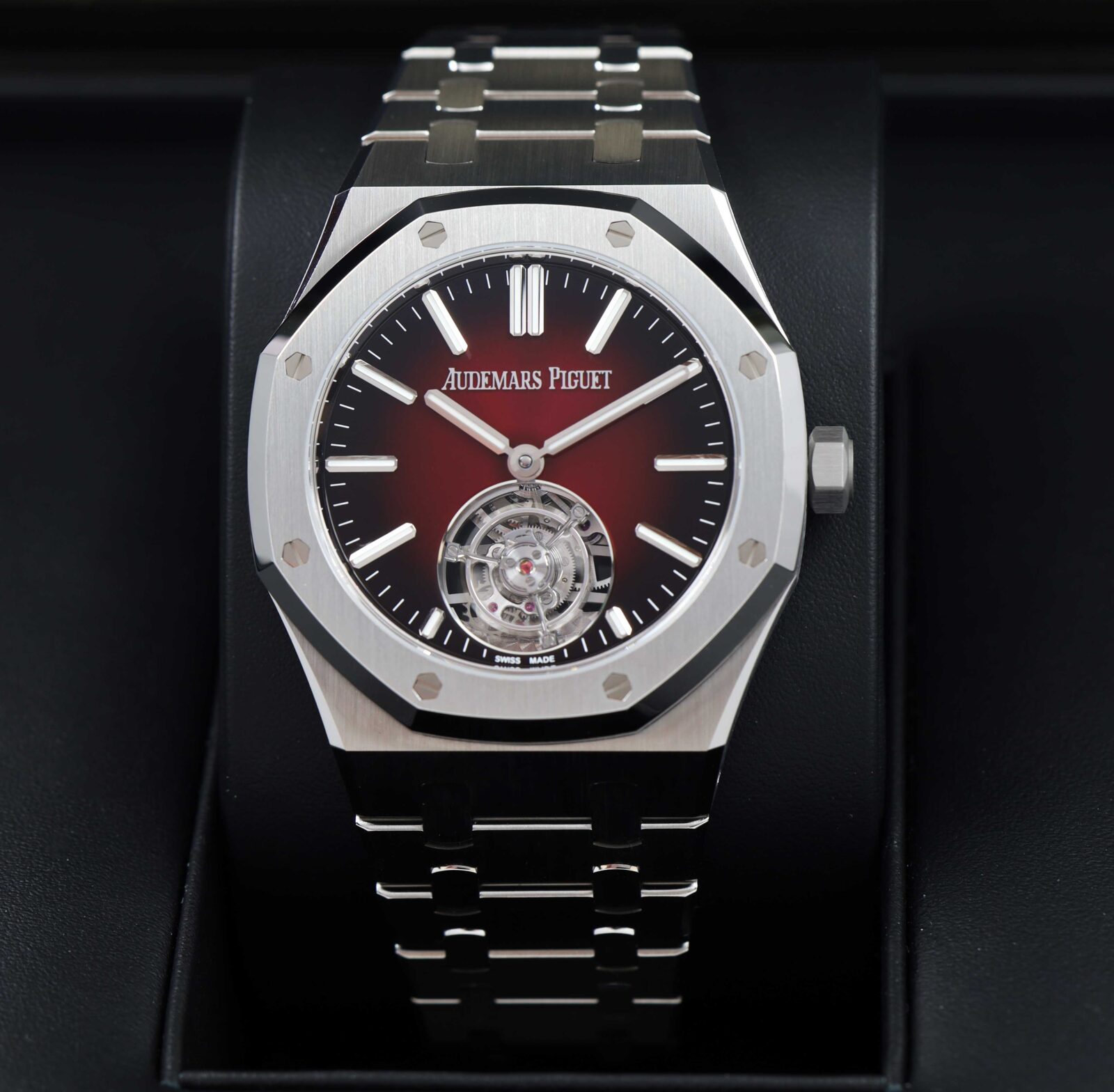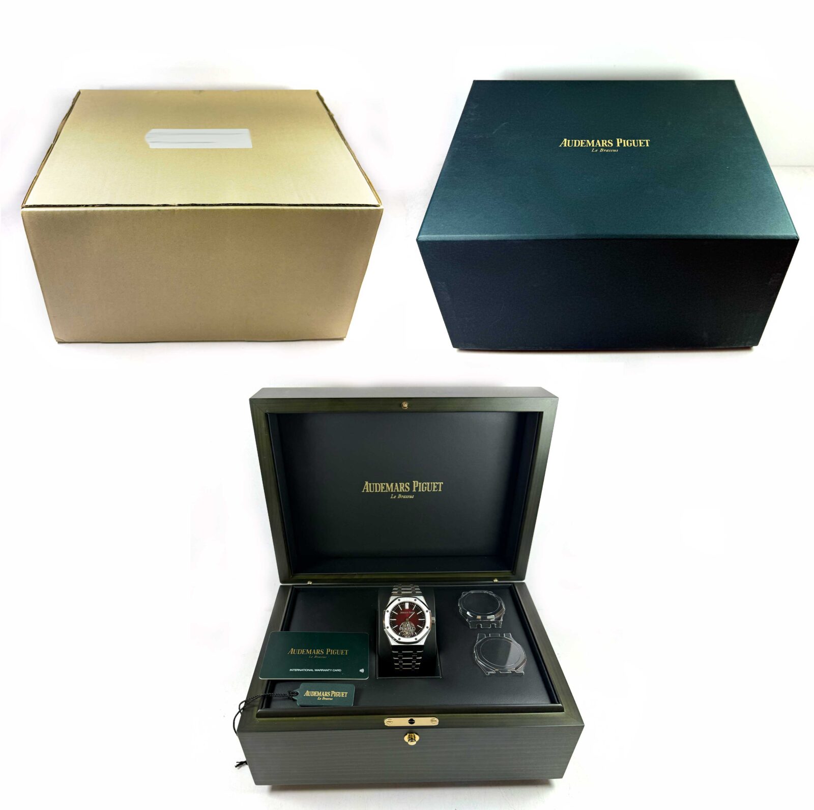This Audemars Piguet watch is new with some stickers attached and comes with its box, hang tag, bezel protector, and warranty card as shown in the pictures attached. This watch is in stock and available to ship immediately!