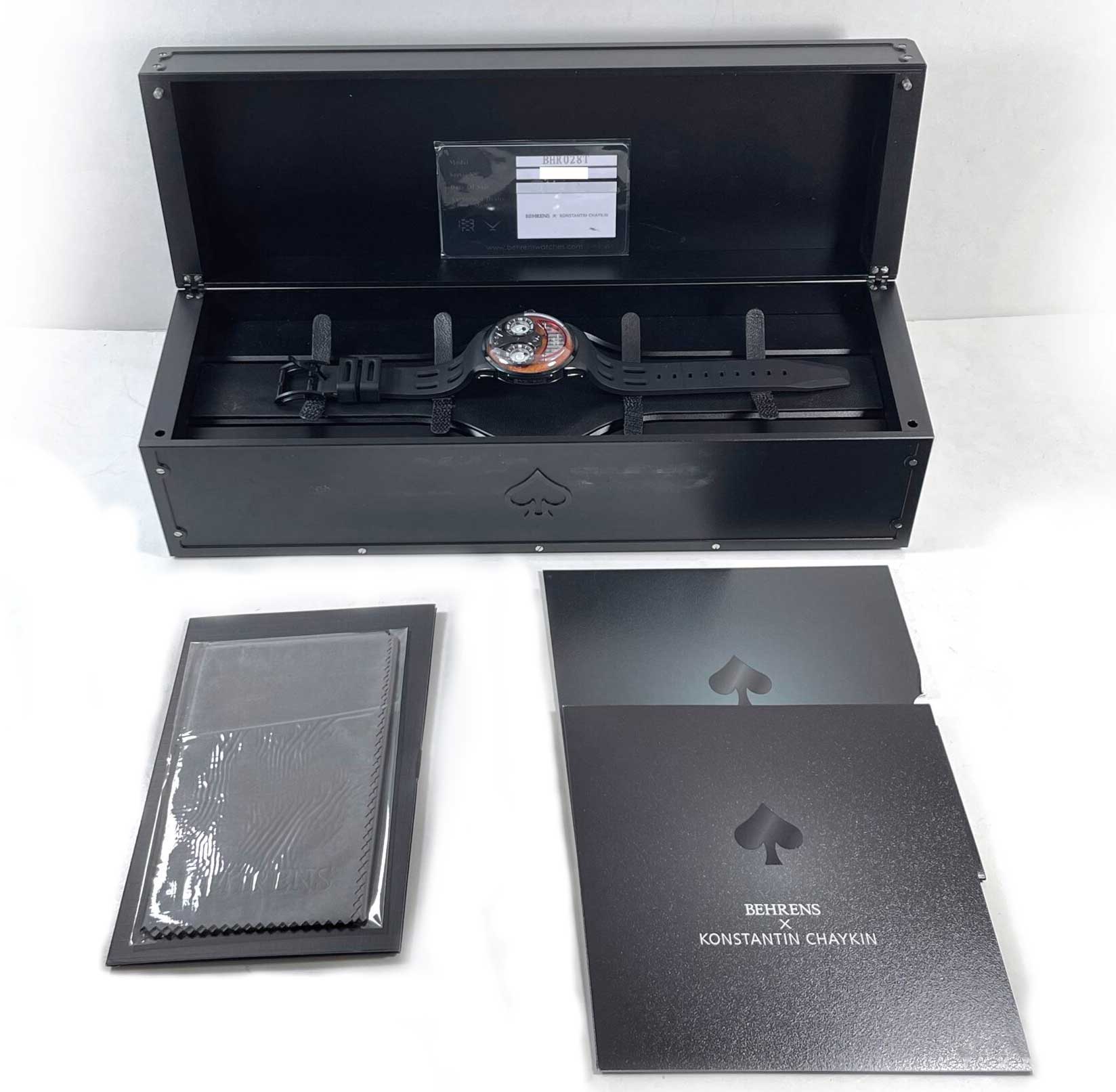 Read Morethis behrens x konstantin chaykin watch is new and comes with its boxes, booklets, travel case, and warranty card as shown in the pictures attached. This collaboration project between two independent watch brands “behrens” and “konstantin chaykin”. A mechanical wristwatch produced by behrens, designed by behrens & konstantin chaykin that is limited to 200 timepieces produced.