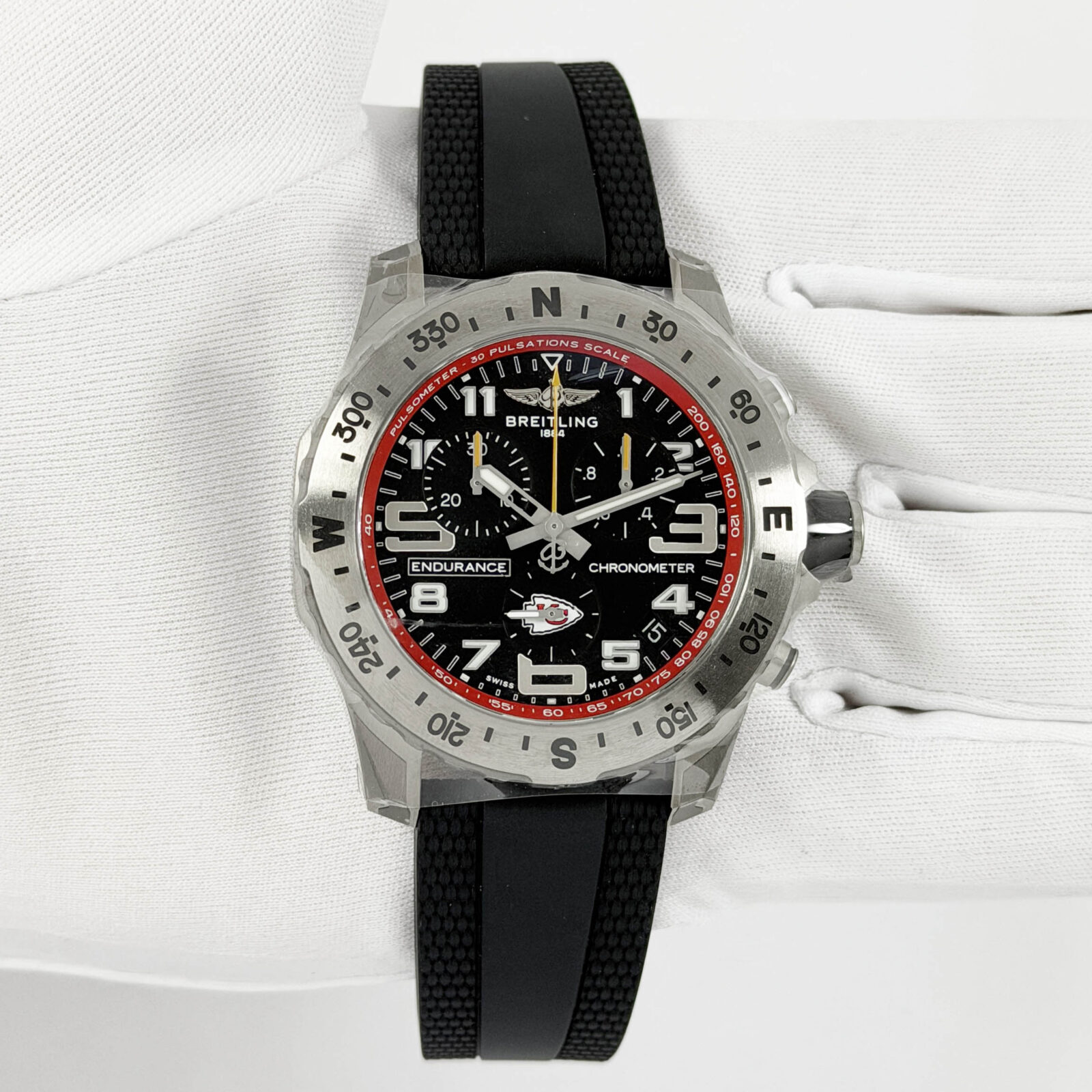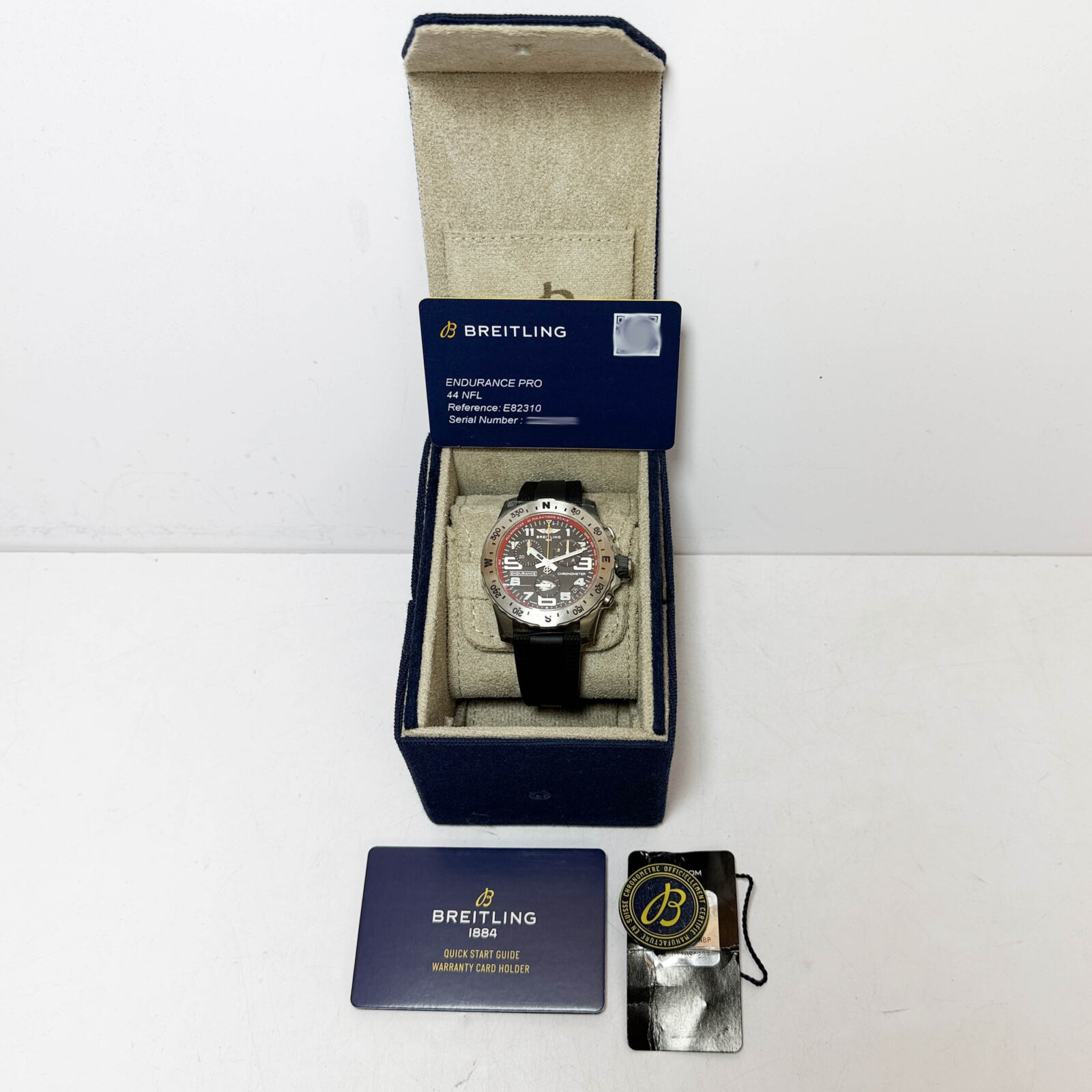this new breitling endurance pro watch comes with its box, hangtags, booklet, and warranty card. The photos shown are of the exact watch being sold and accurately represent its condition. This watch is in stock and ready to ship immediately!