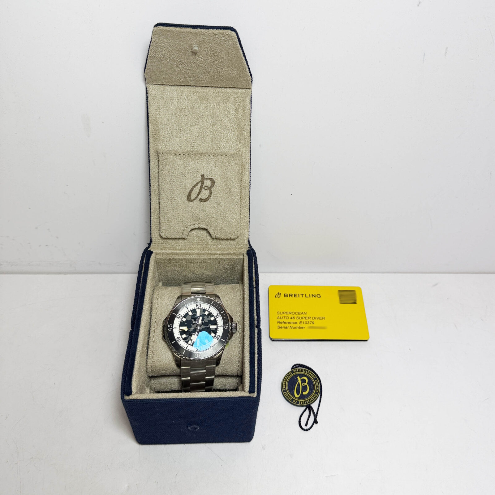 this breitling superocean 46 watch comes with its box, booklet, hangtag, and warranty card. The photos shown are of the exact watch being sold and accurately represent its condition. This watch is in stock and ready to ship immediately!