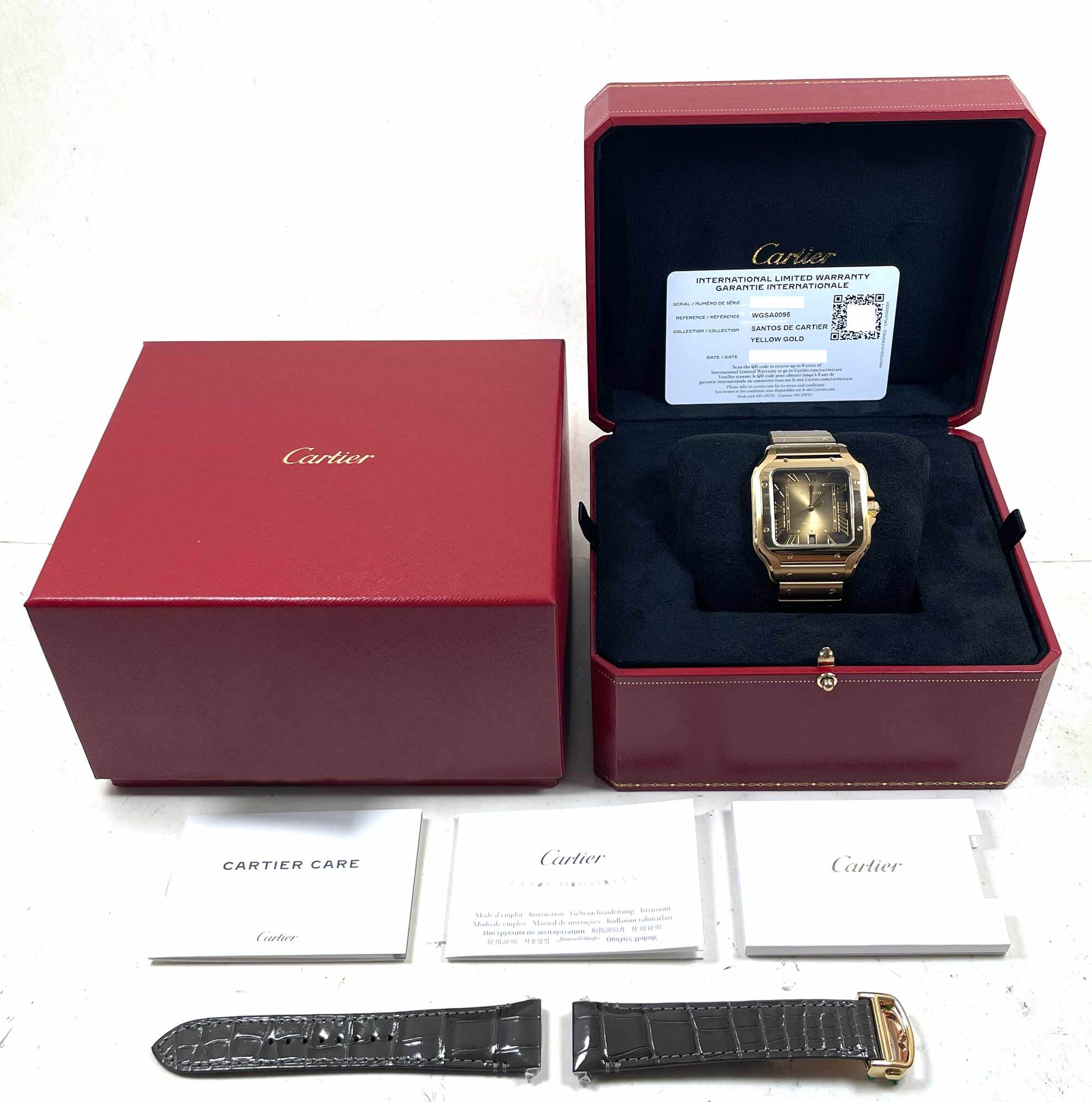 this cartier watch is new and comes with its box, booklets, one additional cartier strap, and warranty card as shown in the pictures attached. This watch is in stock and available to ship immediately!