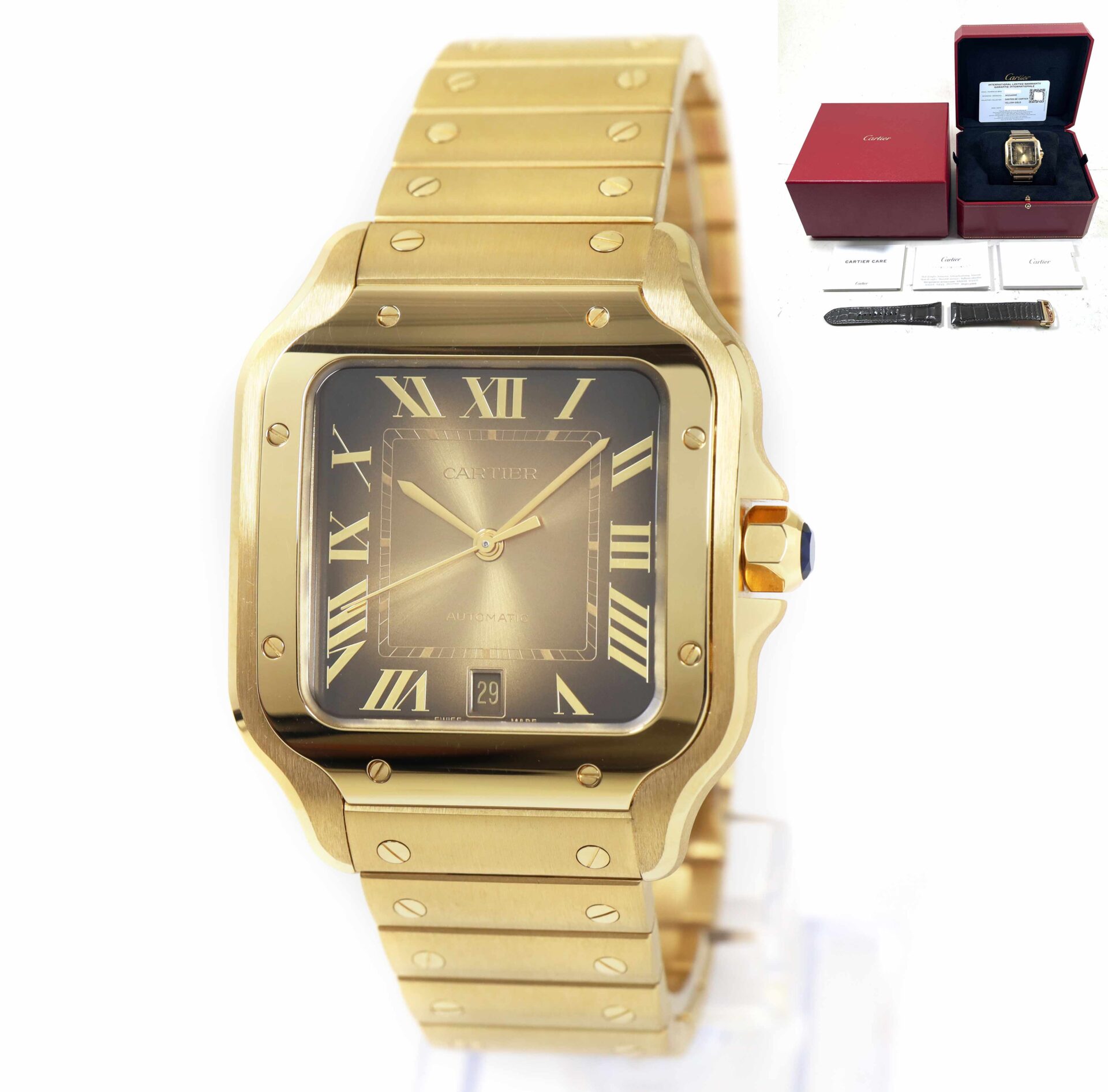 THIS CARTIER WATCH IS NEW AND COMES WITH ITS BOX, BOOKLETS, ONE ADDITIONAL CARTIER STRAP, AND WARRANTY CARD AS SHOWN IN THE PICTURES ATTACHED. THIS WATCH IS IN STOCK AND AVAILABLE TO SHIP IMMEDIATELY!