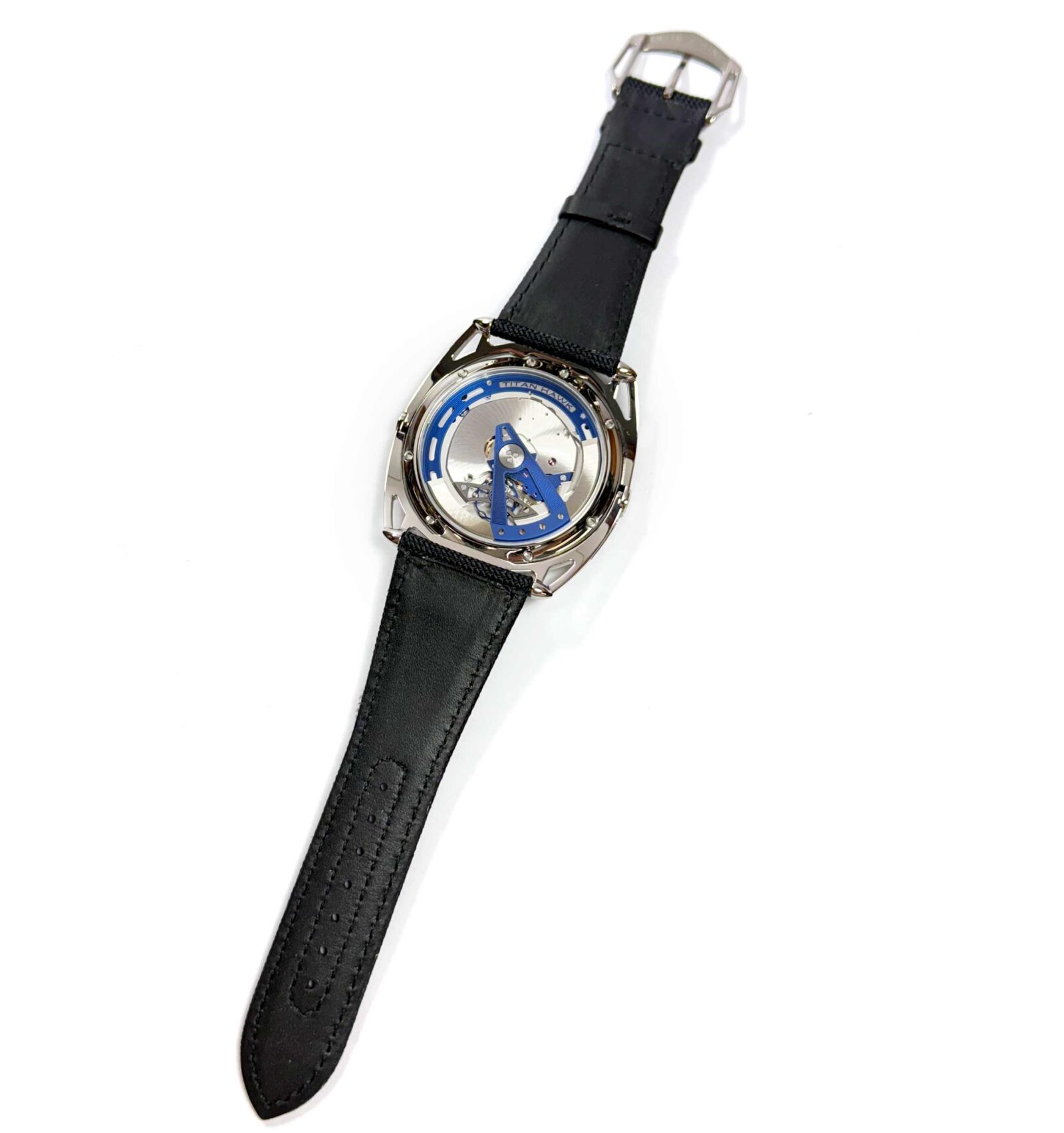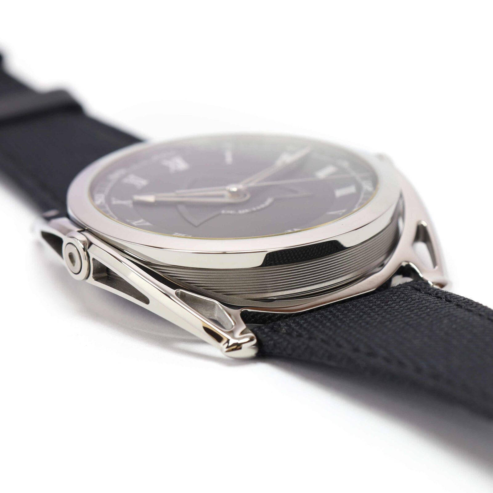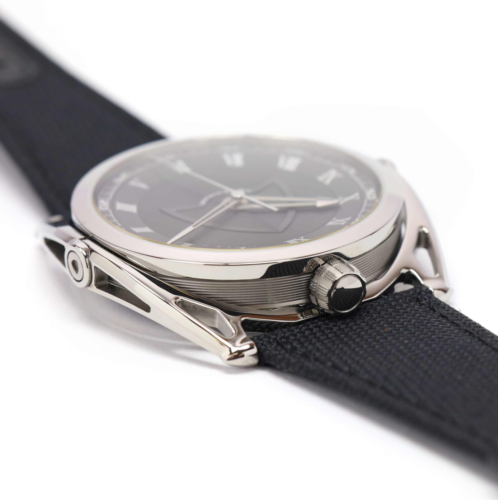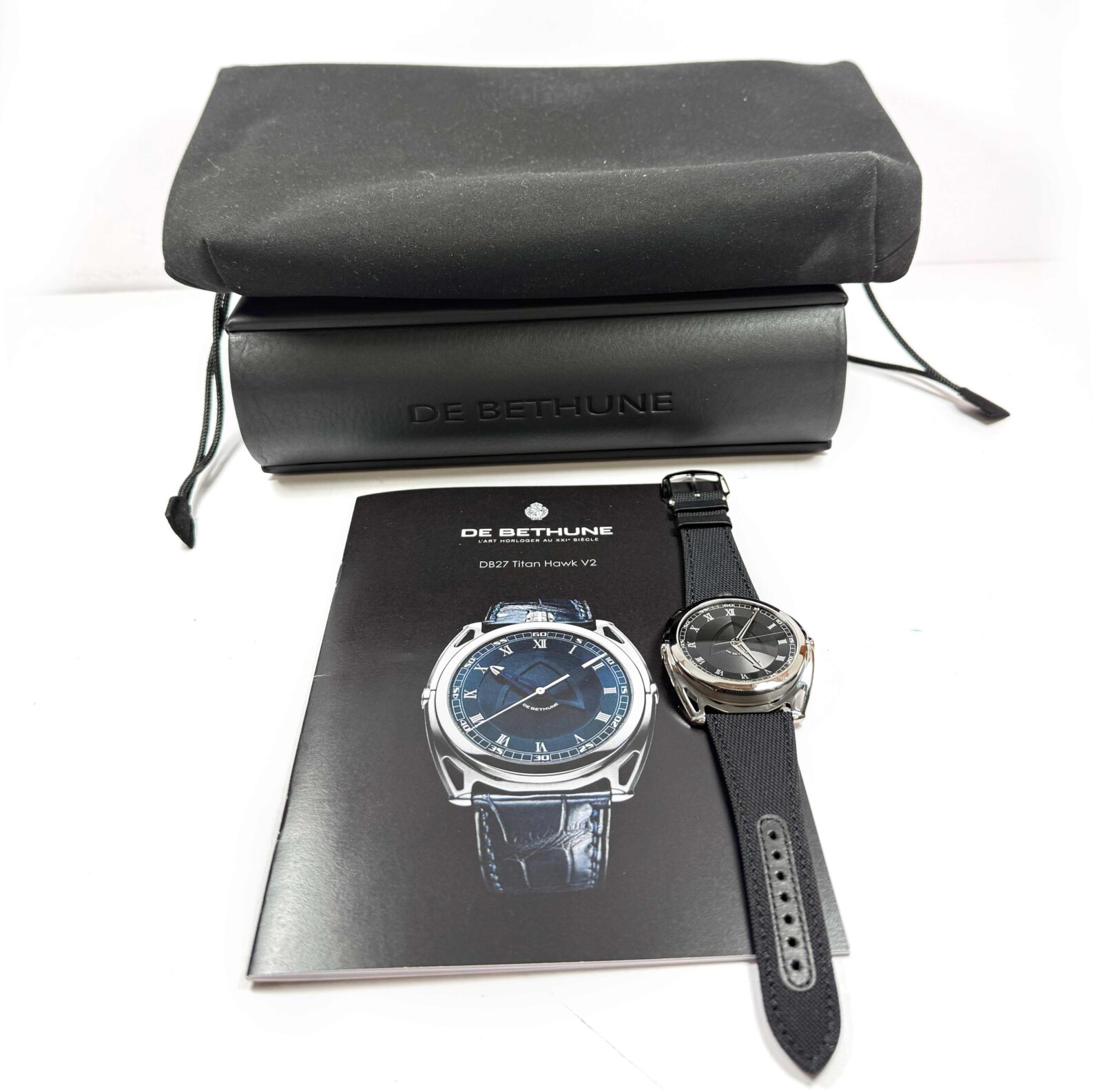 this de bethune watch is new and comes with its box and warranty paper as shown in the pictures attached. This watch features a 43mm titanium case that surrounds a black dial and comes on a black fabric strap with a titanium tang buckle. This watch is in stock and available to ship immediately!