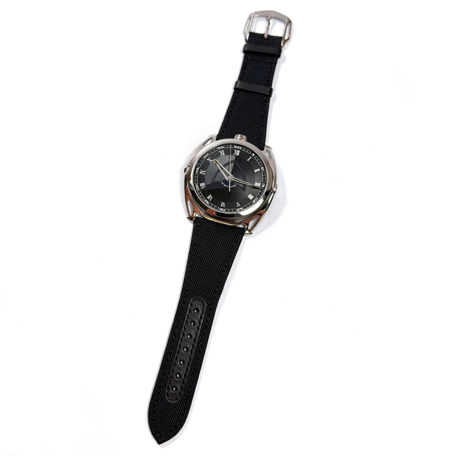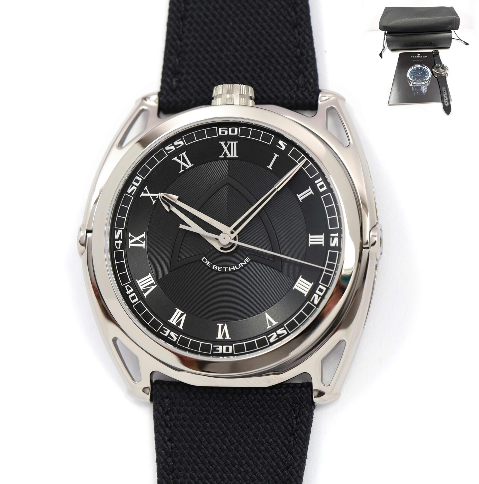 THIS DE BETHUNE WATCH IS NEW AND COMES WITH ITS BOX AND WARRANTY PAPER AS SHOWN IN THE PICTURES ATTACHED. THIS WATCH FEATURES A 43MM TITANIUM CASE THAT SURROUNDS A BLACK DIAL AND COMES ON A BLACK FABRIC STRAP WITH A TITANIUM TANG BUCKLE. THIS WATCH IS IN ST...