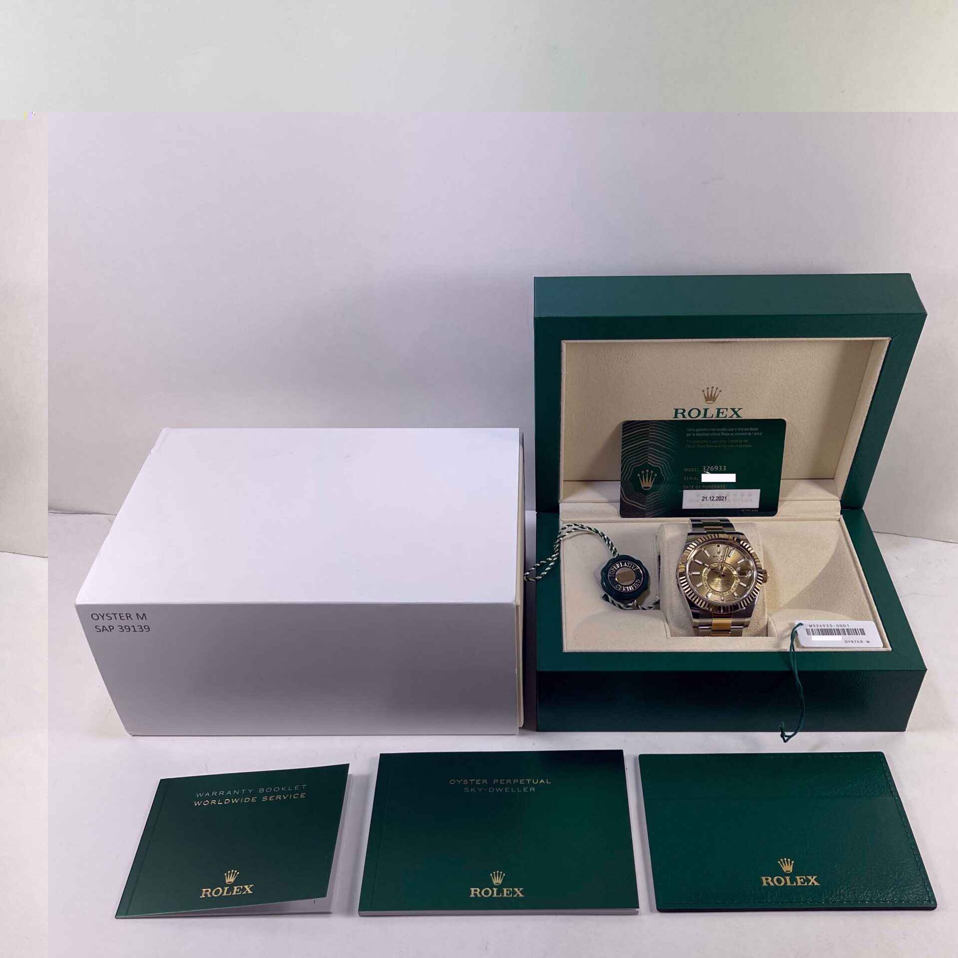 this rolex is new and comes with box, papers, hang tags, and warranty card dated december 21st, 2021. This watch is in stock and available to ship immediately!