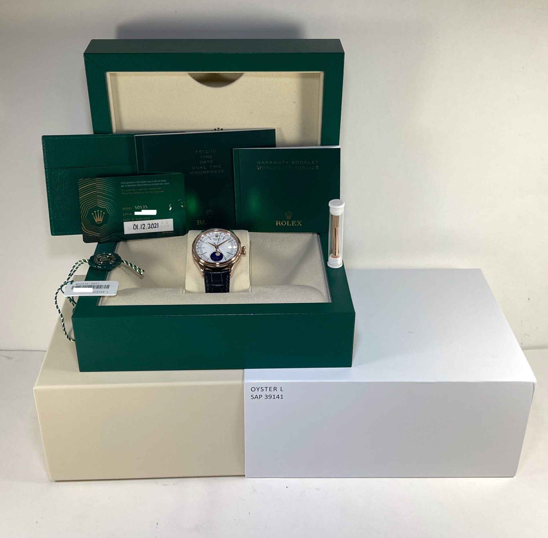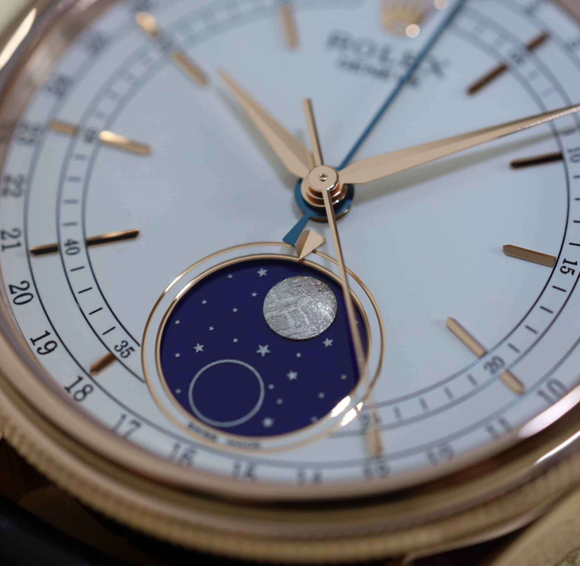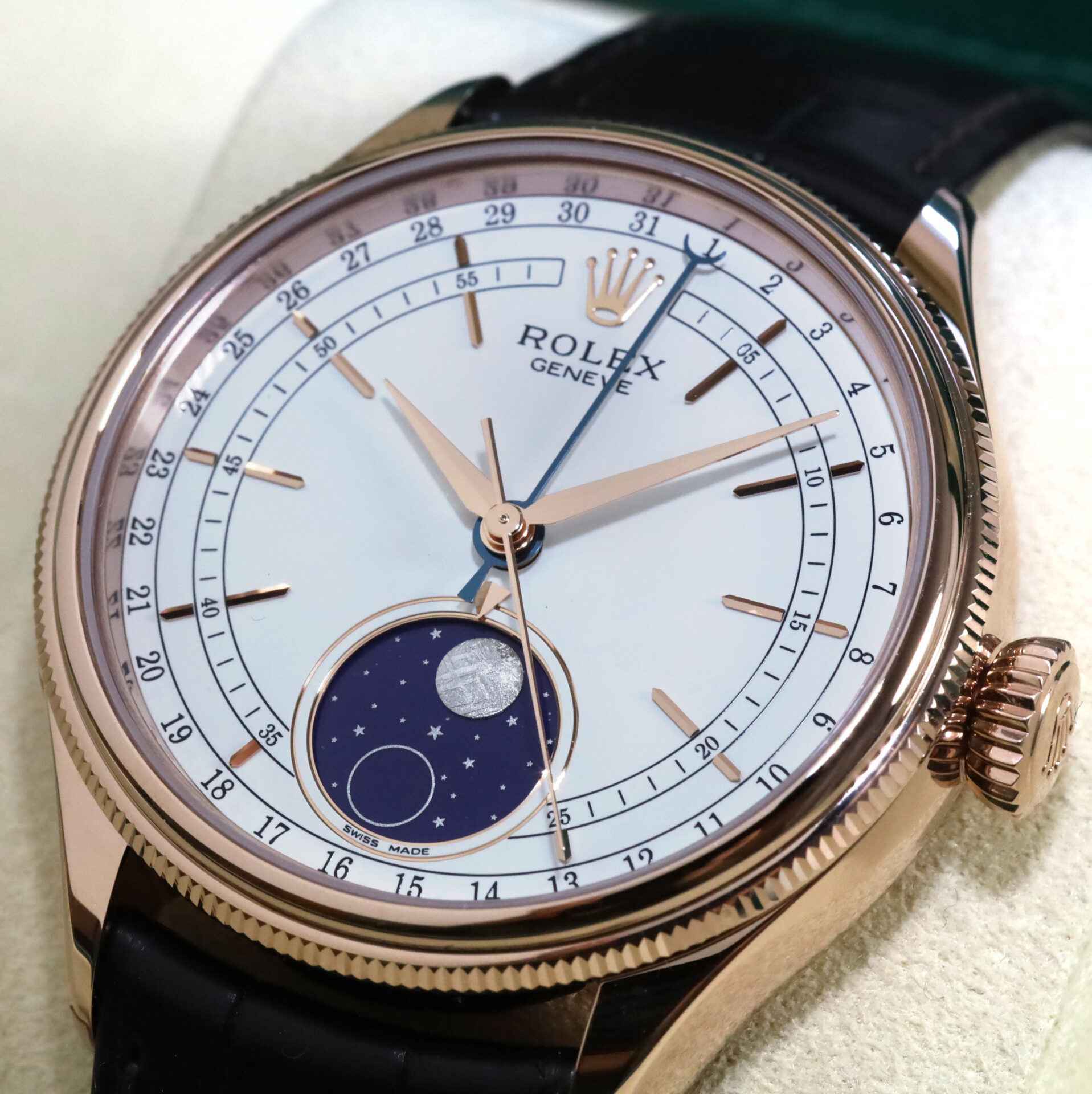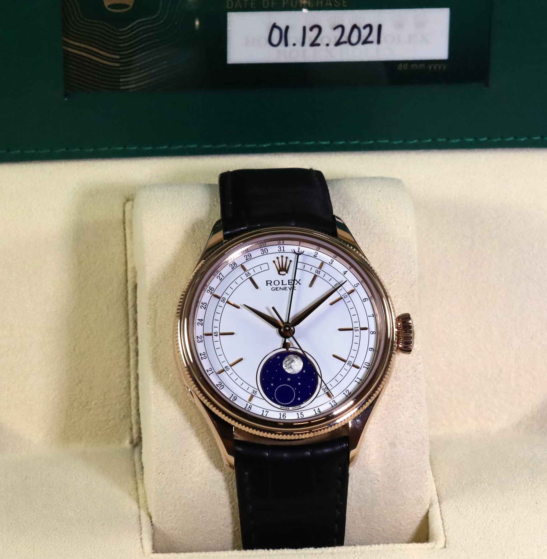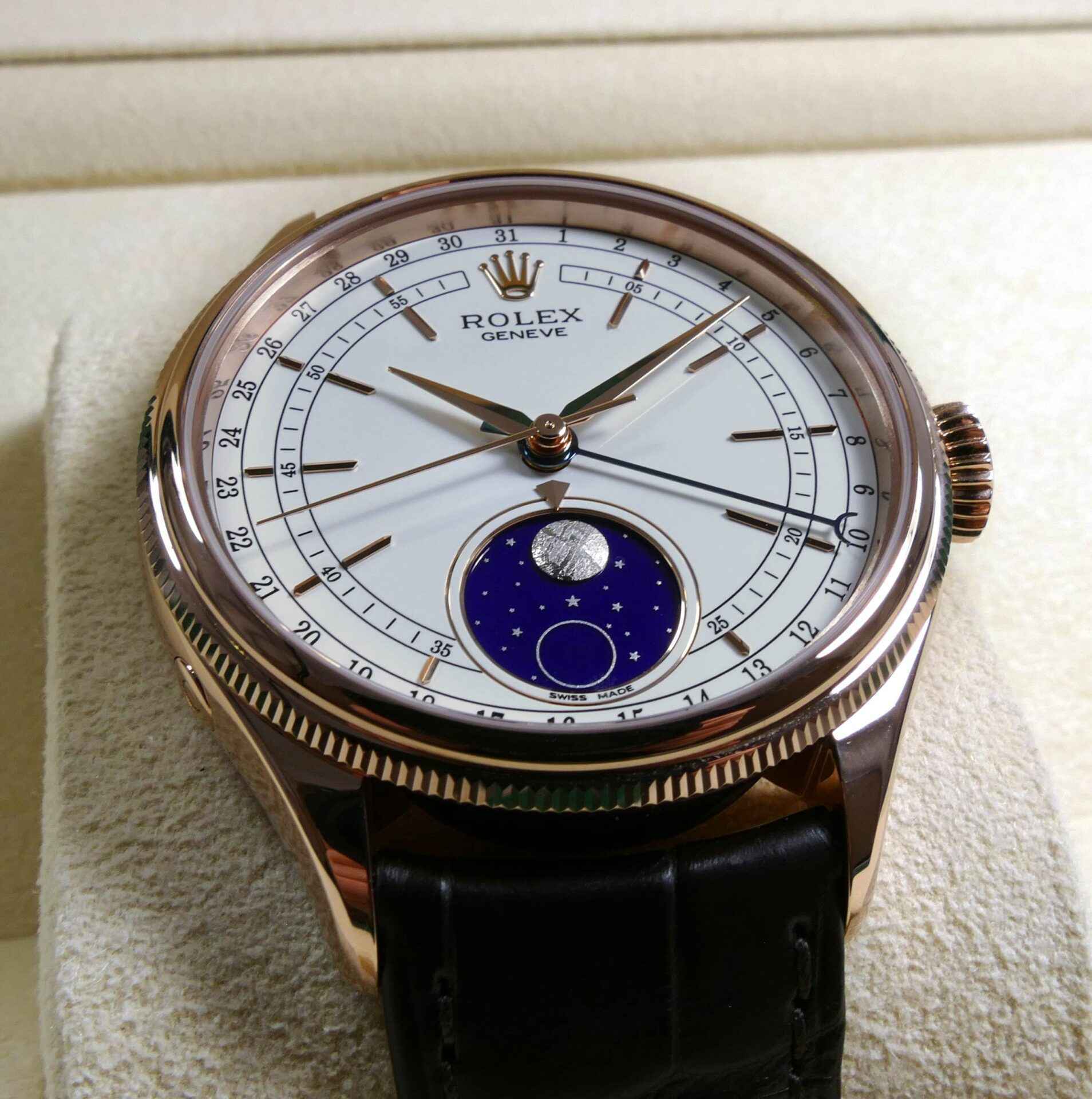 Read Morethis rolex cellini is new and comes with its box, papers, pusher tool, hang tags and warranty card dated december 1st, 2021. This watch features a moon phase disk at 6 o’clock which displays the lunar cycle where the full moon is depicted by a meteorite. This watch is in stock and ready to ship immediately!