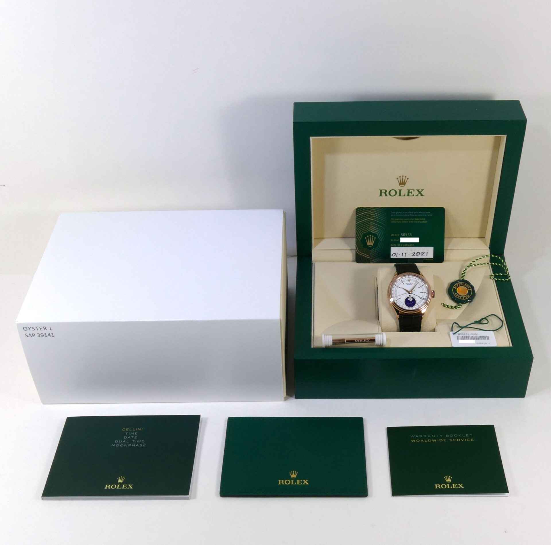 This Rolex Cellini is new and comes with its box, papers, pusher tool, hang tags and warranty card dated December 1st, 2021. This watch features a moon phase disk at 6 o’clock which displays the lunar cycle where the ful...