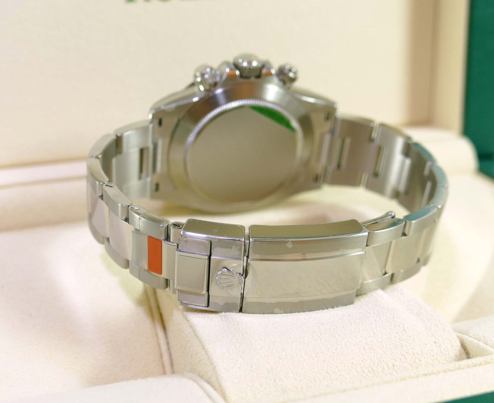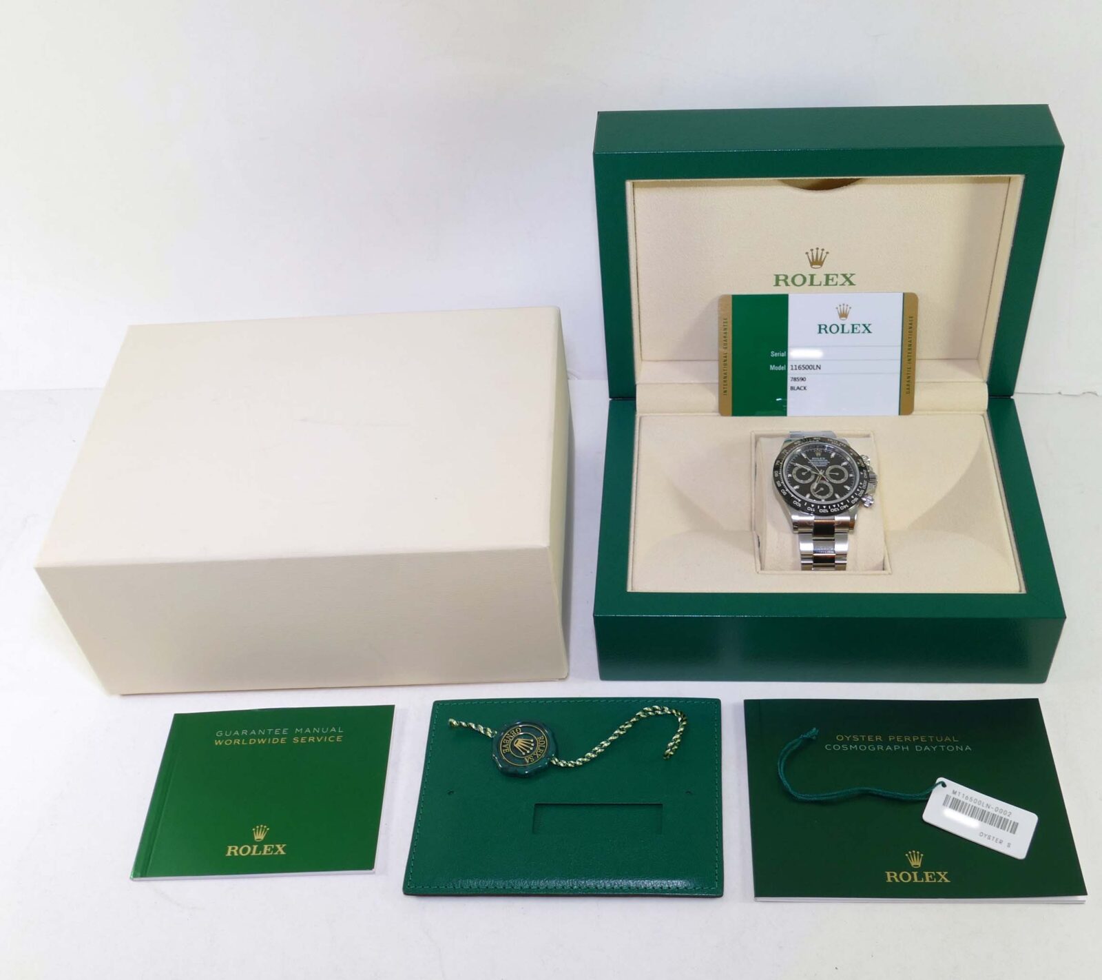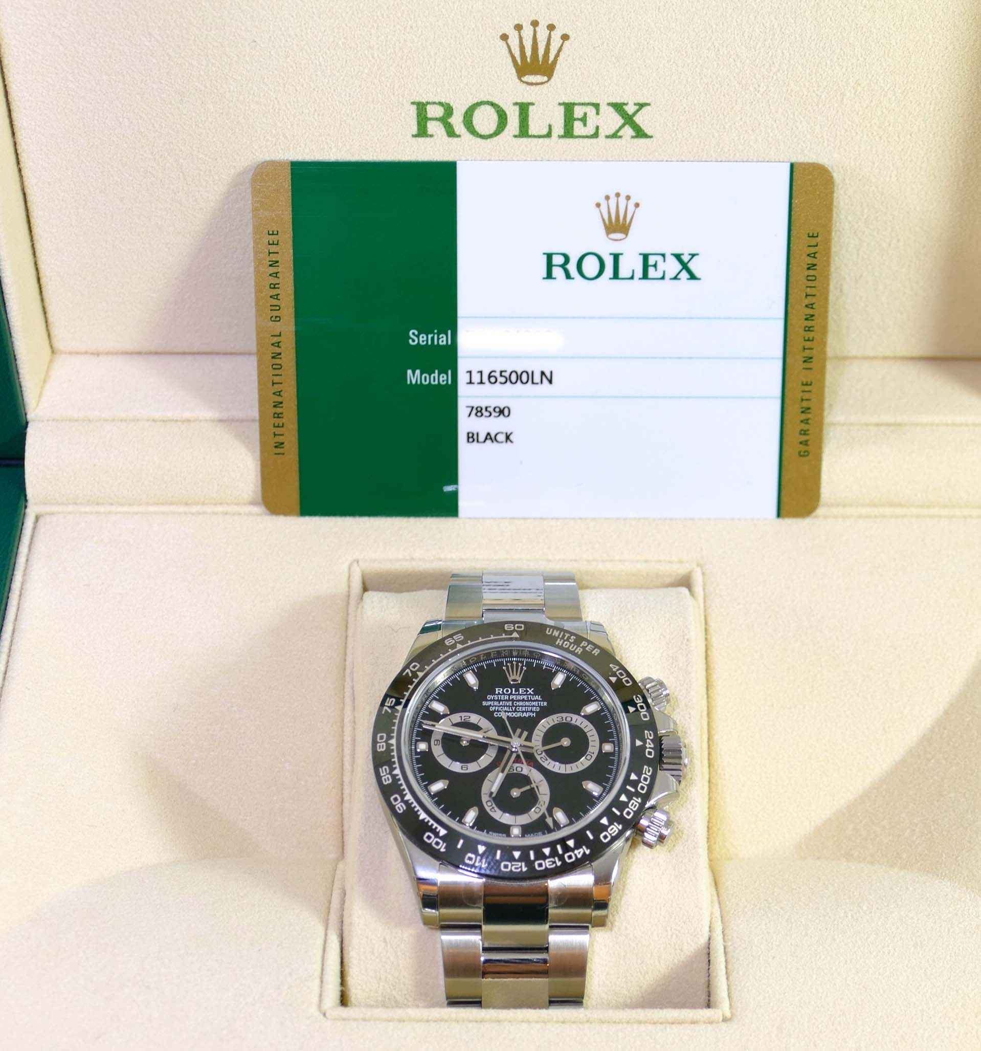 This watch is 100% new and unworn, and has all of its original stickers never removed from the watch. The warranty card is undated and unnamed, we will have to fill this information out upon the sale.
