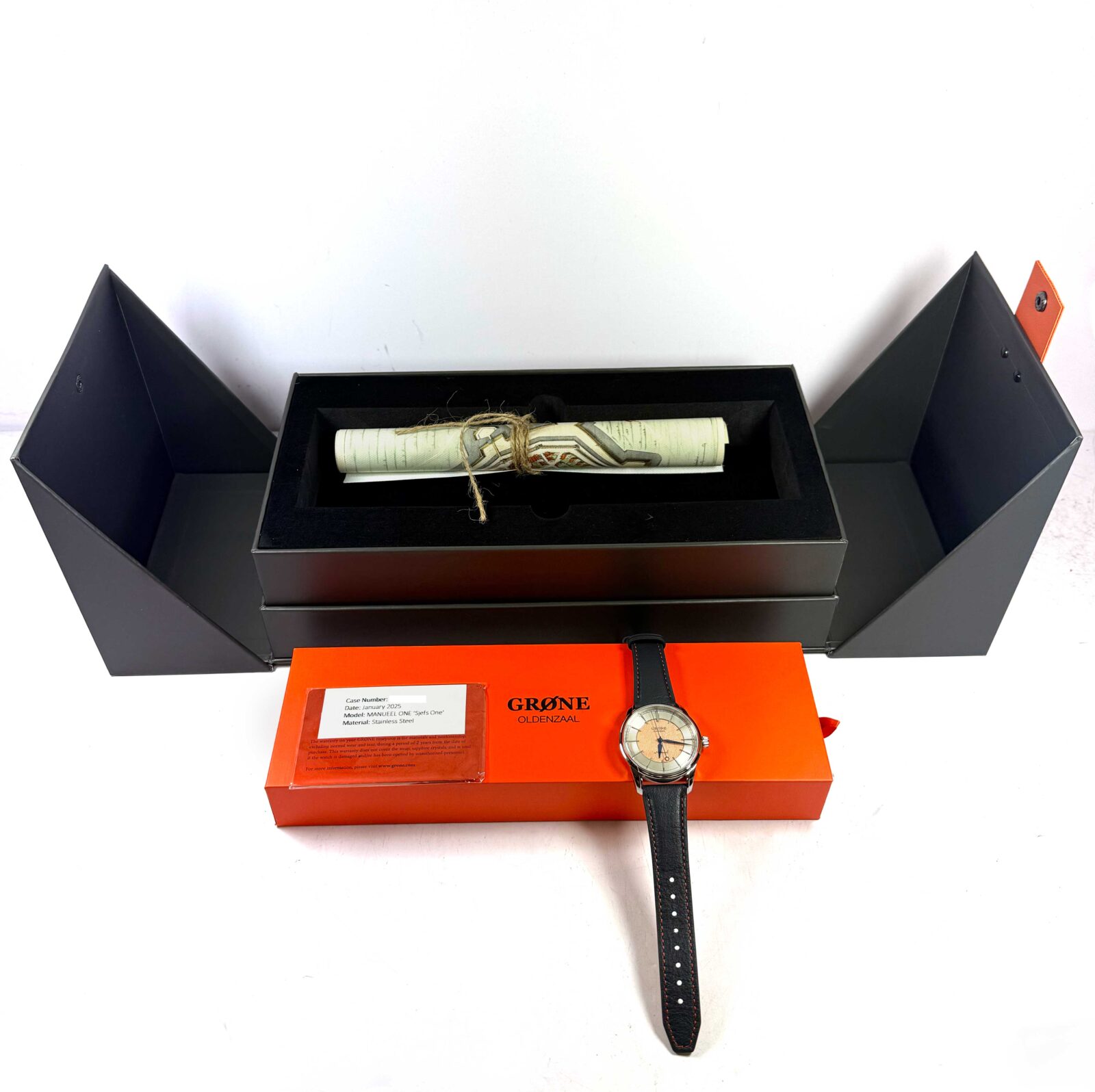 Read Morethis grone watch is new and comes with its box and warranty card dated january 2025 as shown in the pictures attached. This grone is part of a limited edition with only 388 total pieces produced in this model. This watch is in stock and available to ship immediately!