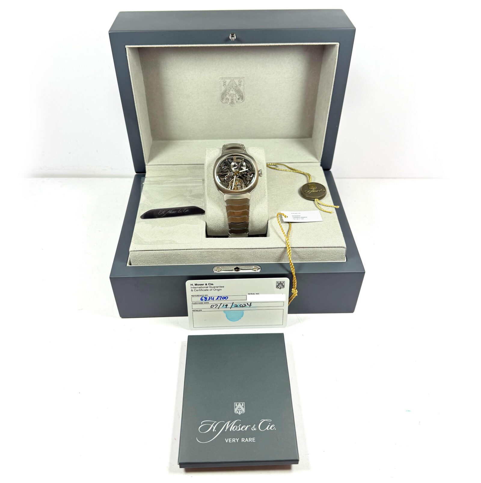 THIS H. MOSER & CIE WATCH IS NEW AND COMES WITH ITS BOX, BOOKLETS, HANG TAGS, AND WARRANTY CARD DATED JULY 19TH, 2024 AS SHOWN IN THE PICTURES ATTACHED. THIS WATCH IS IN STOCK AND AVAILABLE TO SHIP IMMEDIATELY!