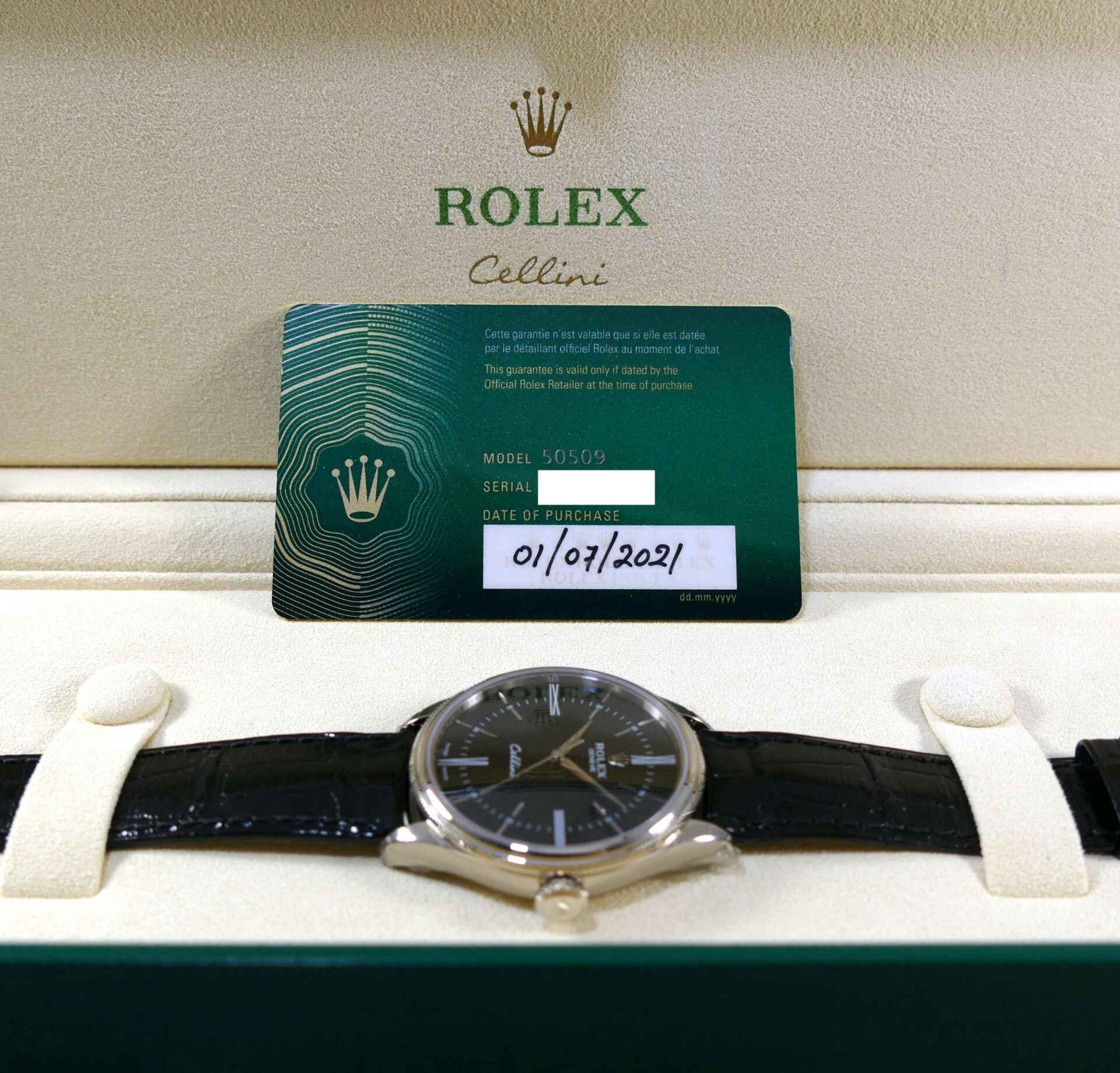 New July 2021 Rolex Cellini 50509 39mm 18k WG Black Box Papers Full Stickers