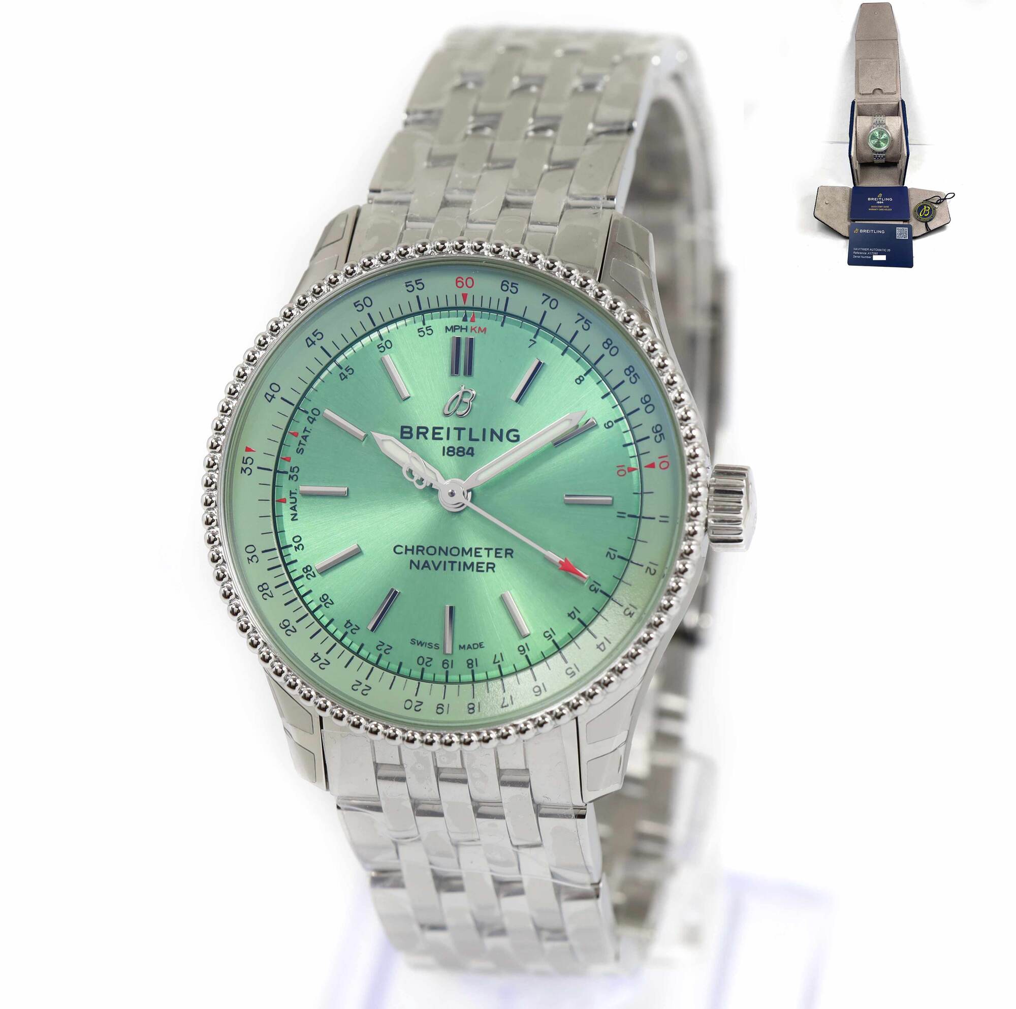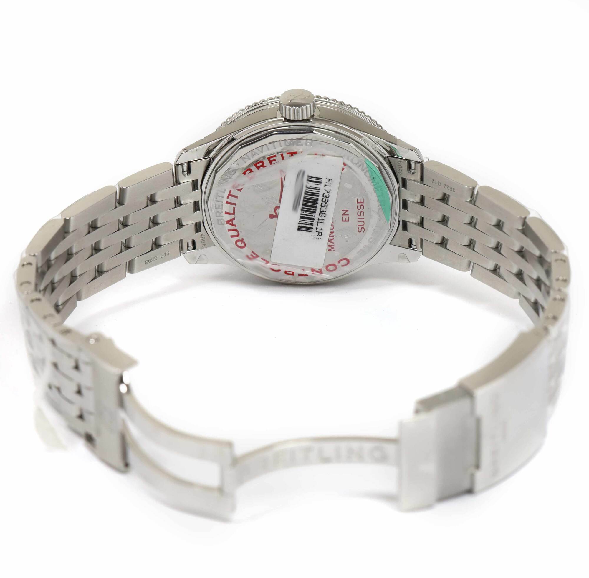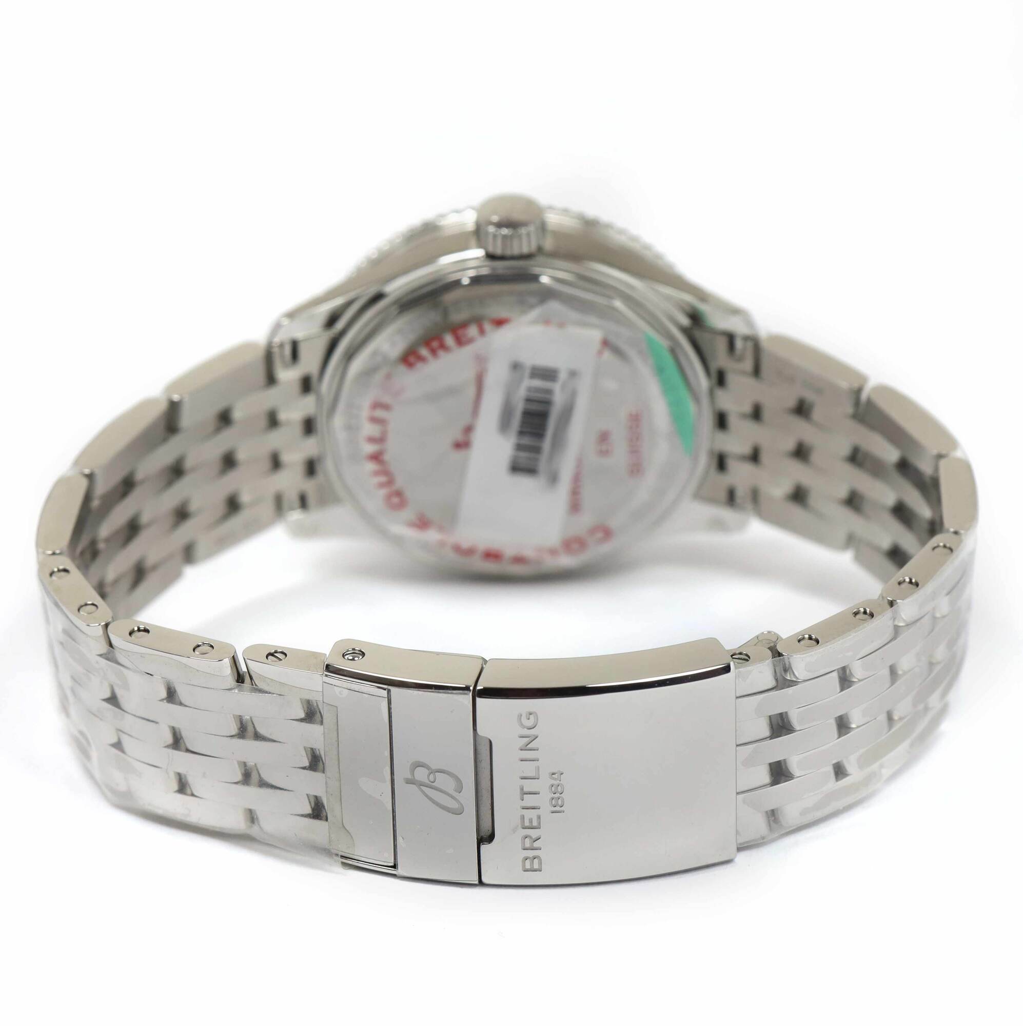THIS BREITLING IS NEW WITH STICKERS AND COMES WITH ITS BOX, BOOKLET, HANG TAG, AND WARRANTY CARD AS SHOWN IN THE PICTURES ATTACHED. THIS WATCH IS IN STOCK AND AVAILABLE TO SHIP IMMEDIATELY!