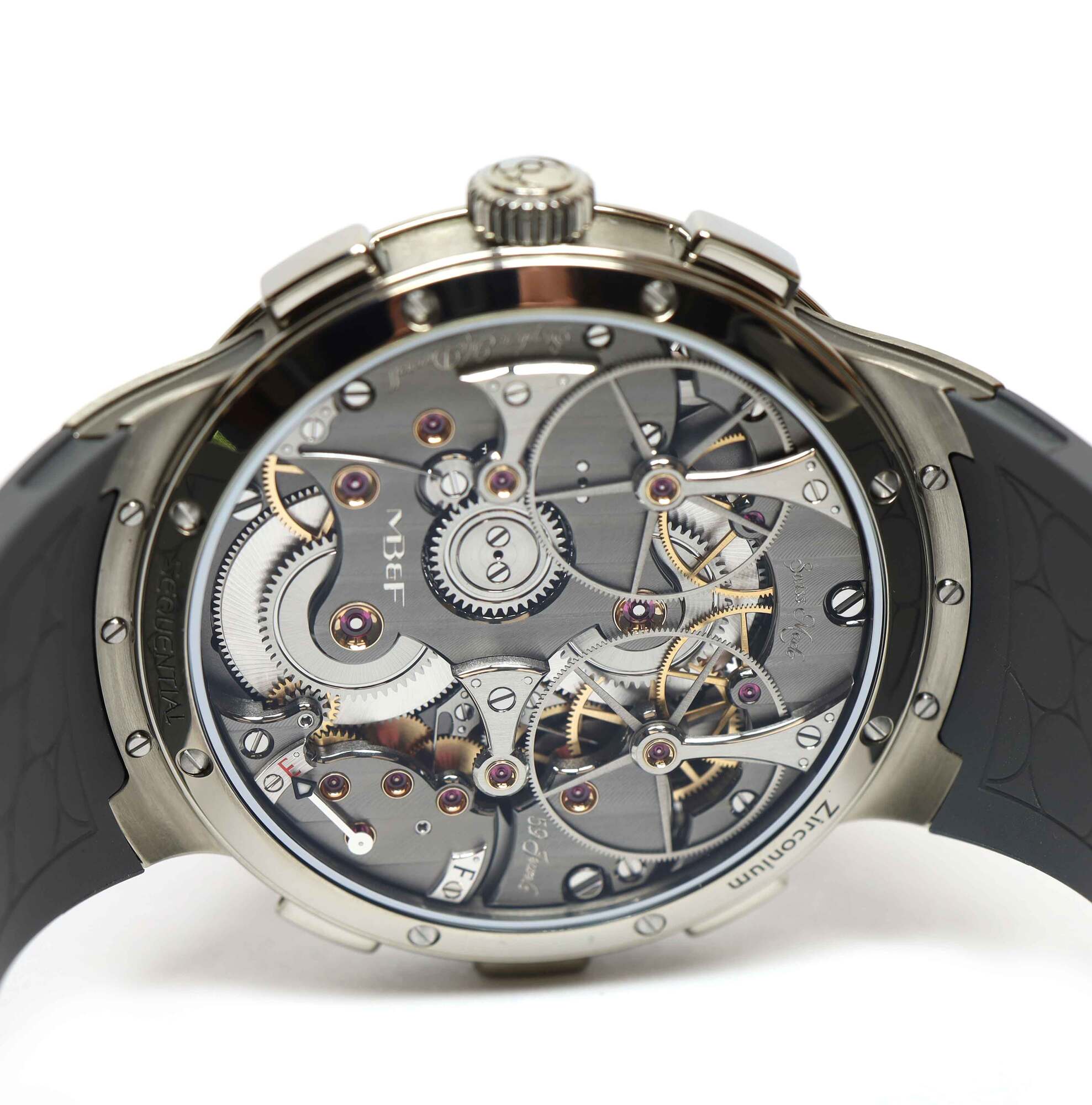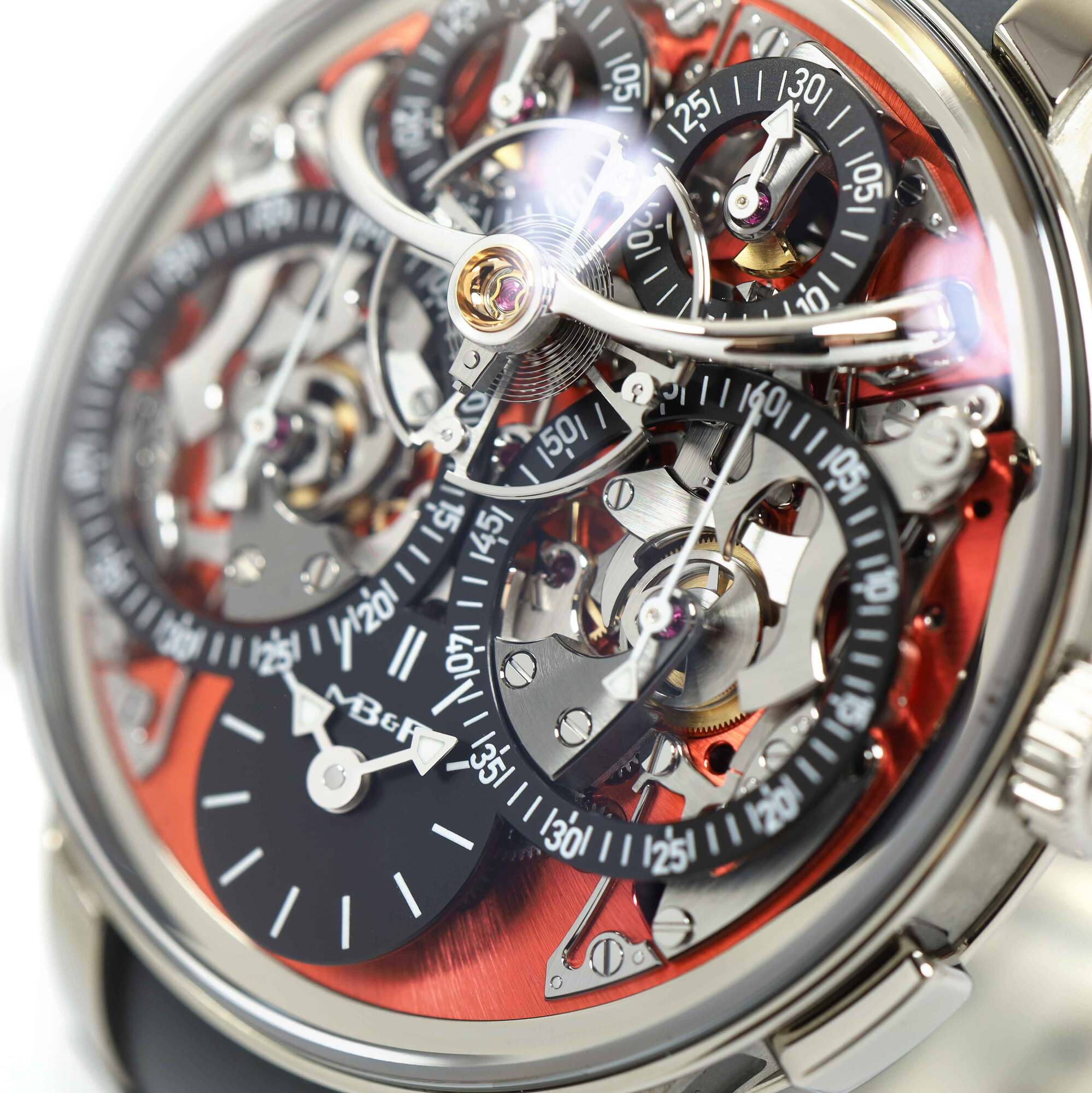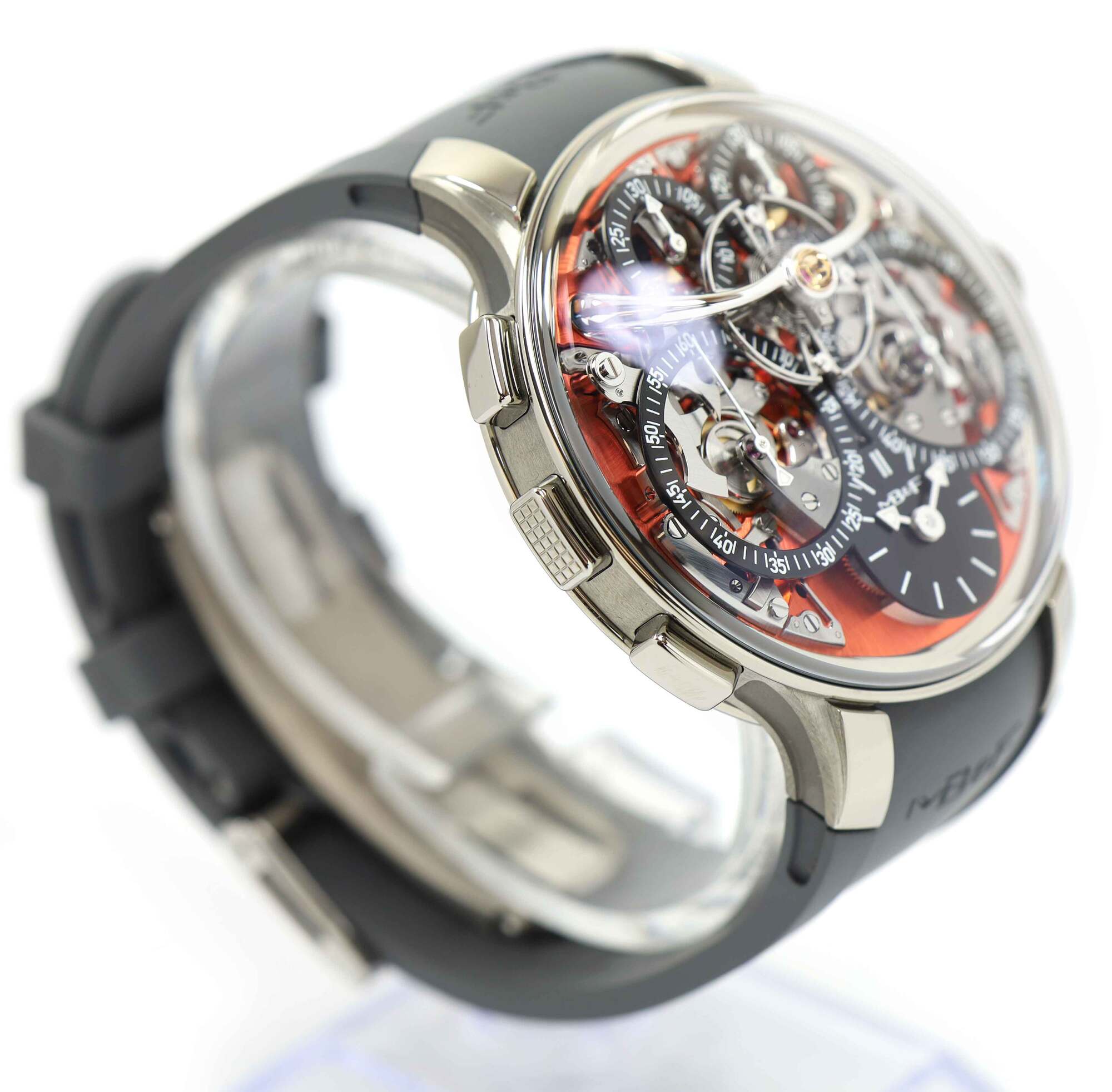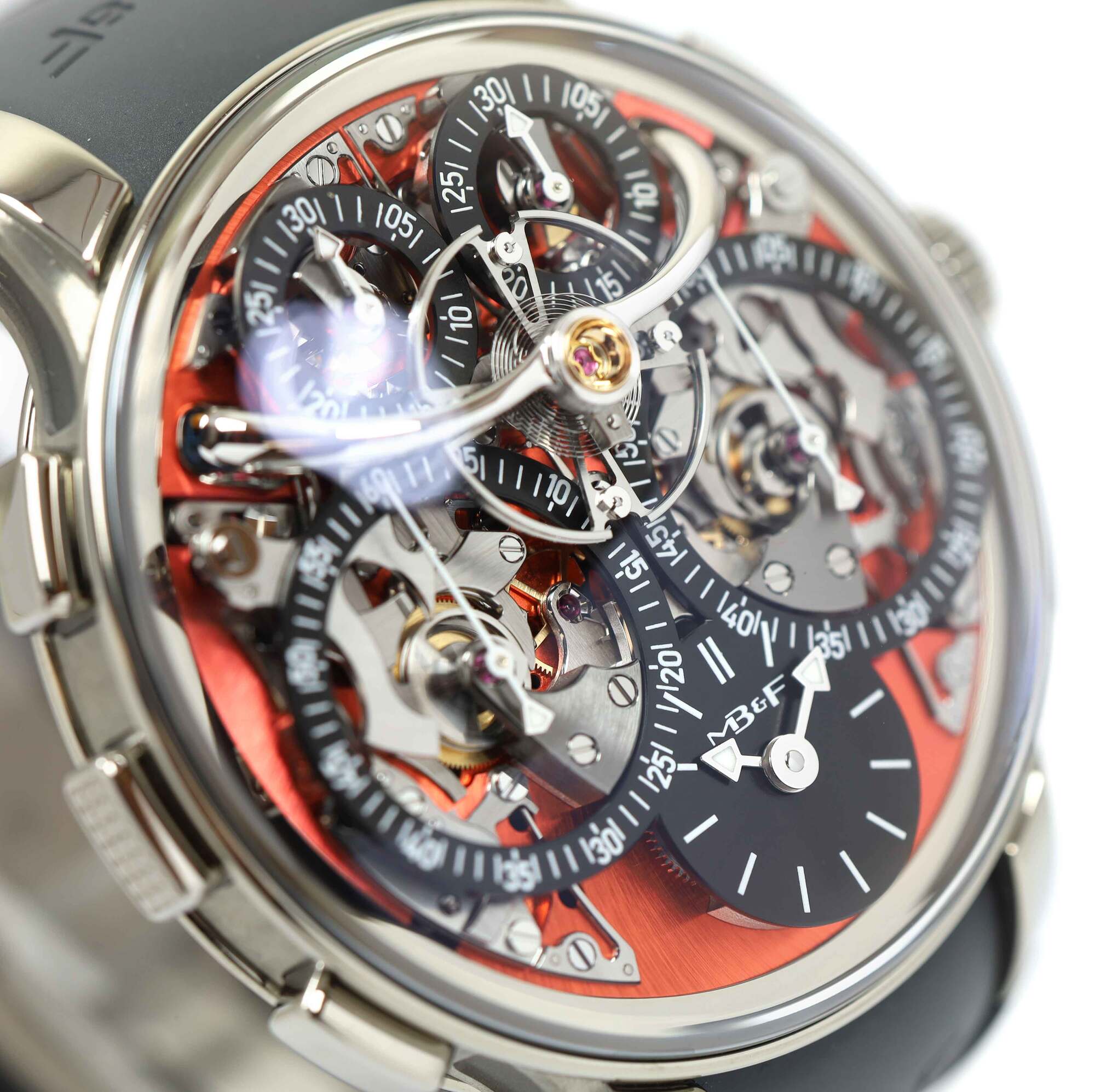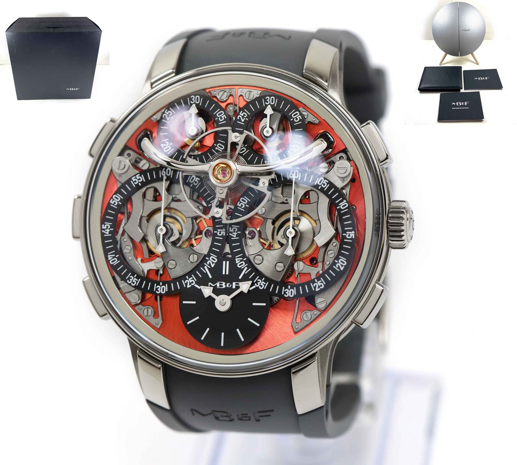THIS MB&F IS NEW AND COMES WITH IT'S BOX, BOOKLET, AND WARRANTY BOOKLET DATED 2024. THIS WATCH FEATURES A 44MM ZIRCONIUM CASE THAT SURROUNDS AN ORANGE/SKELETON DIAL AND COMES ON A DARK GREY RUBBER STRAP WITH A DEPLOYANT BUCKLE. THIS WATCH IS IN STOCK AN...