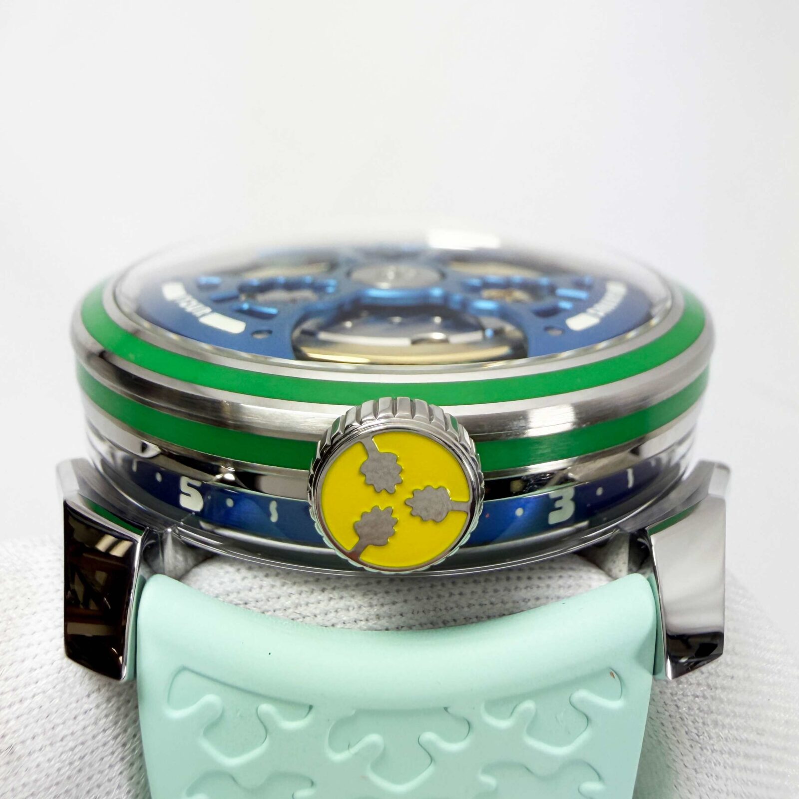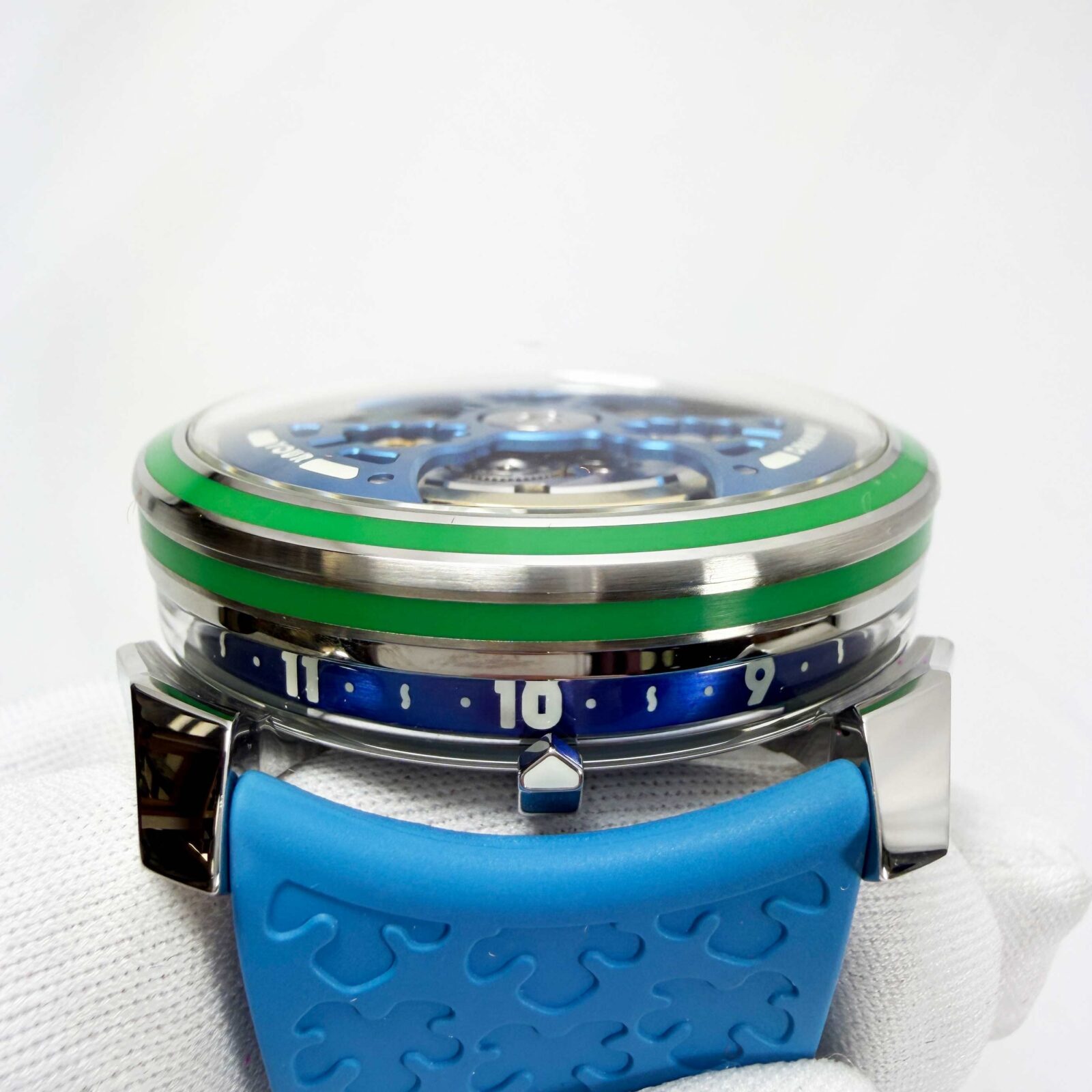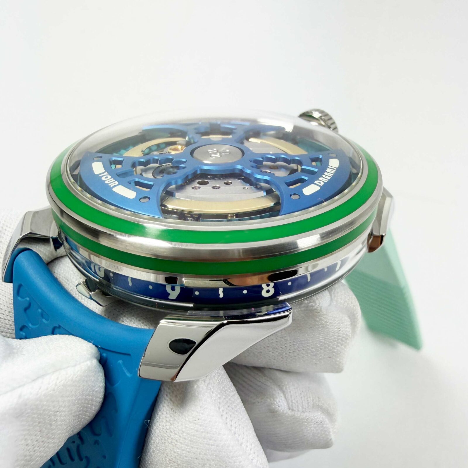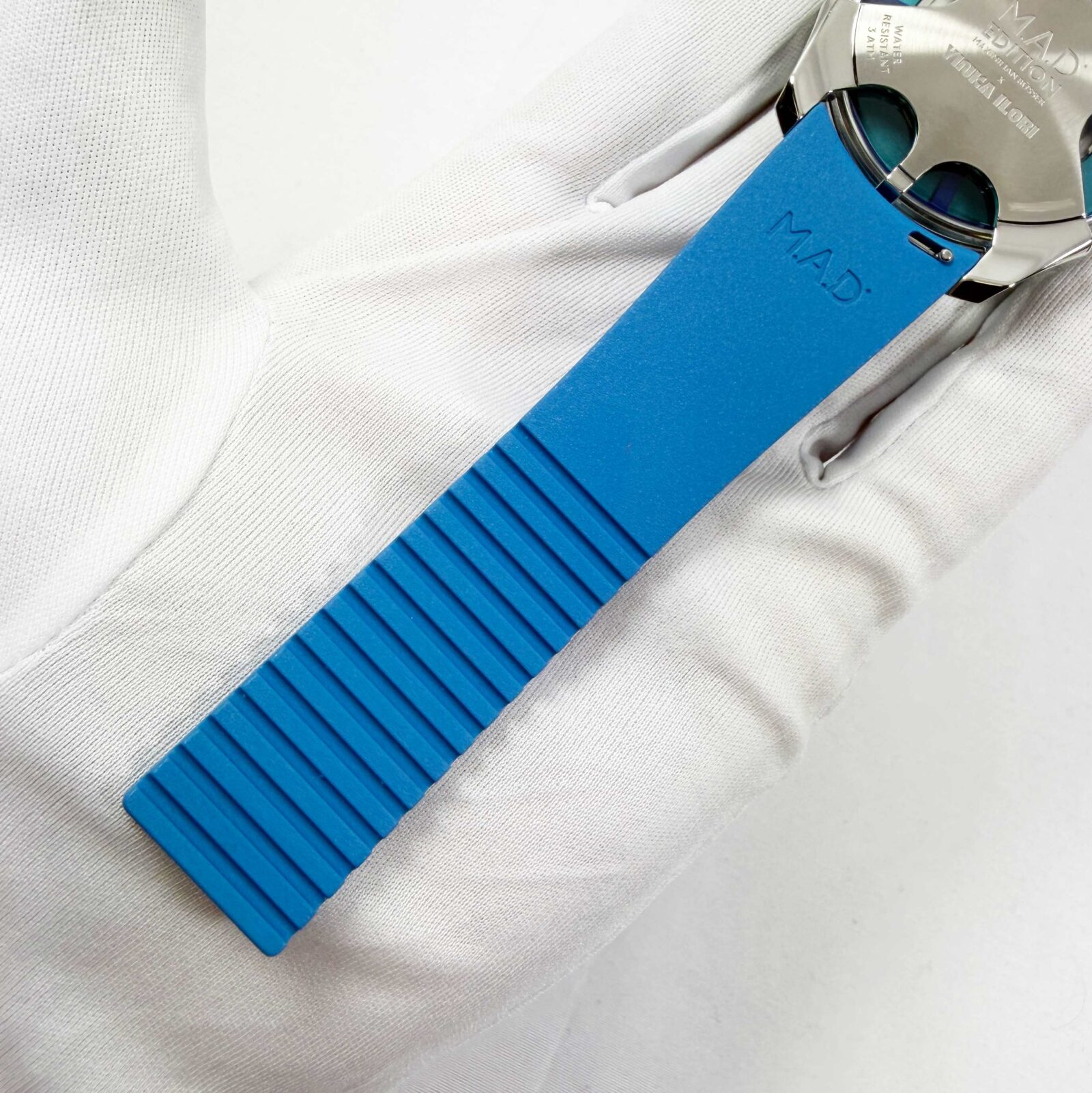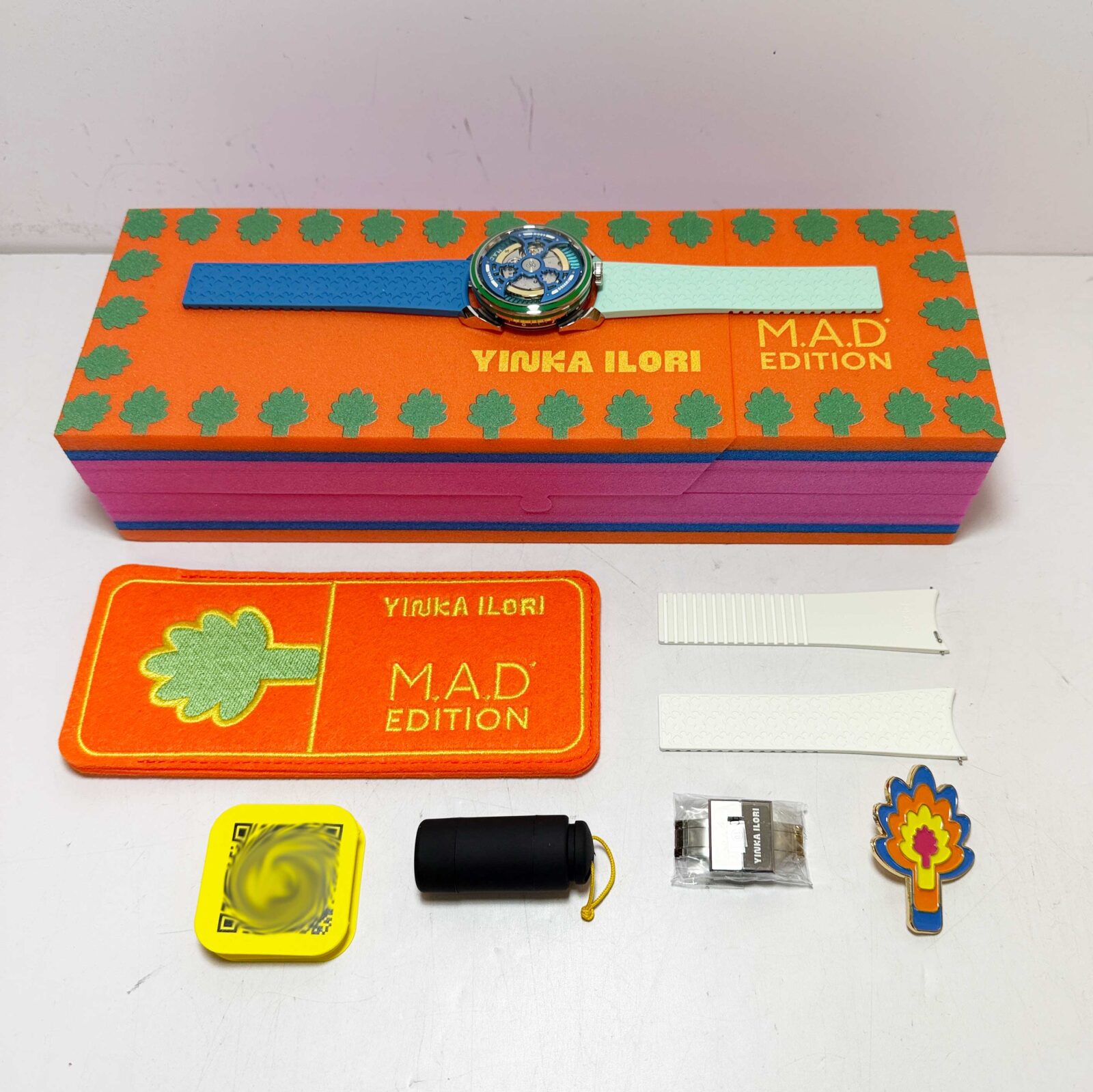 This MB&F watch is new and comes with its box, QR code tag, one white rubber strap/clasp, and watch accessories as shown in the pictures attached. This watch is in stock and ready to ship immediately!