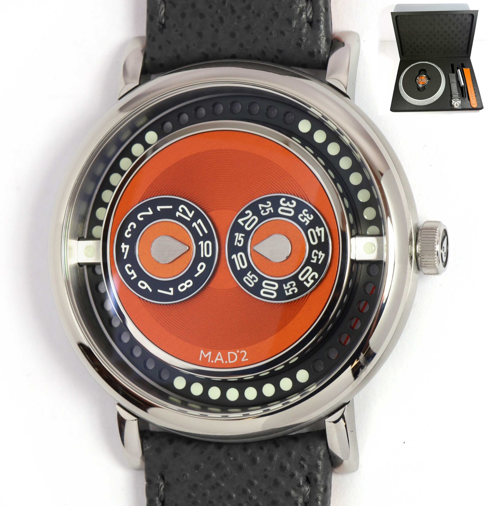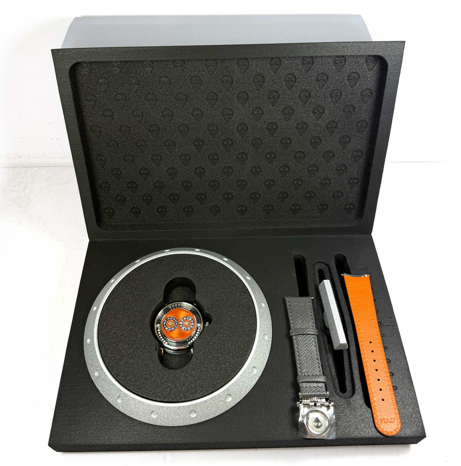 This MB&F watch is new and comes with its box and barcode tag as shown in the pictures attached. This watch is in stock and available to ship immediately!