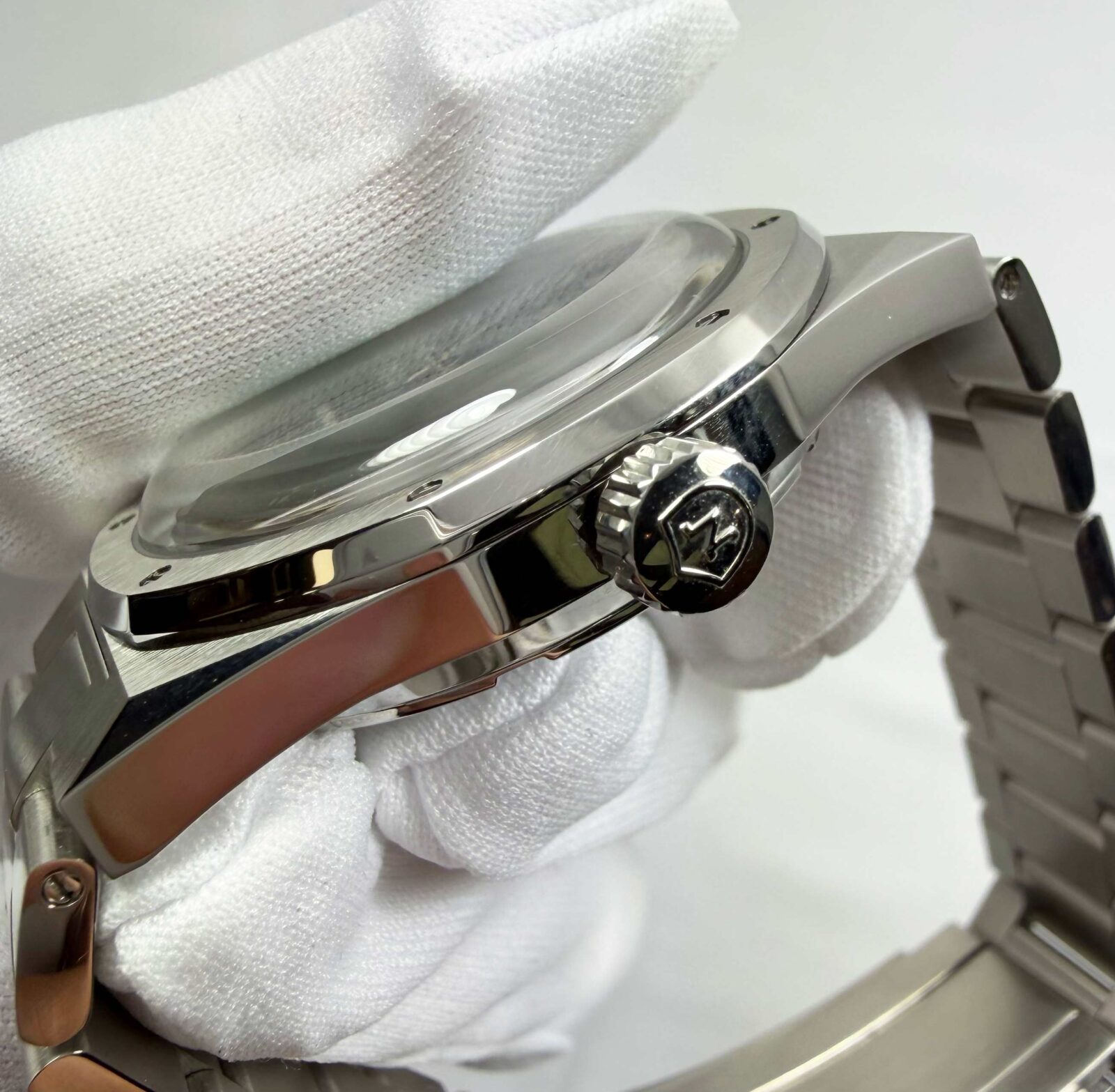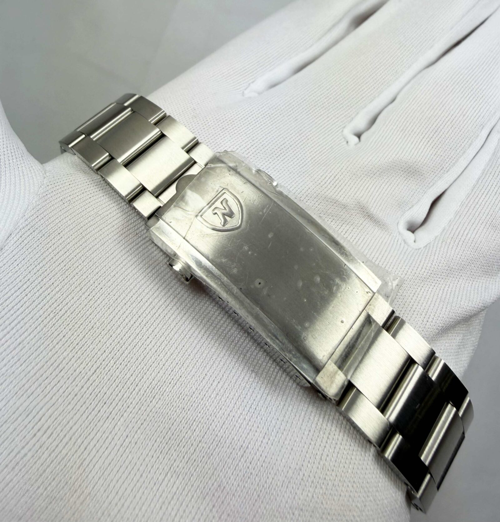 This Nivada Grenchen watch is new and comes with its box, hang tag, one spare link, and warranty paper dated 2025. This watch is in stock and ready to ship immediately!
