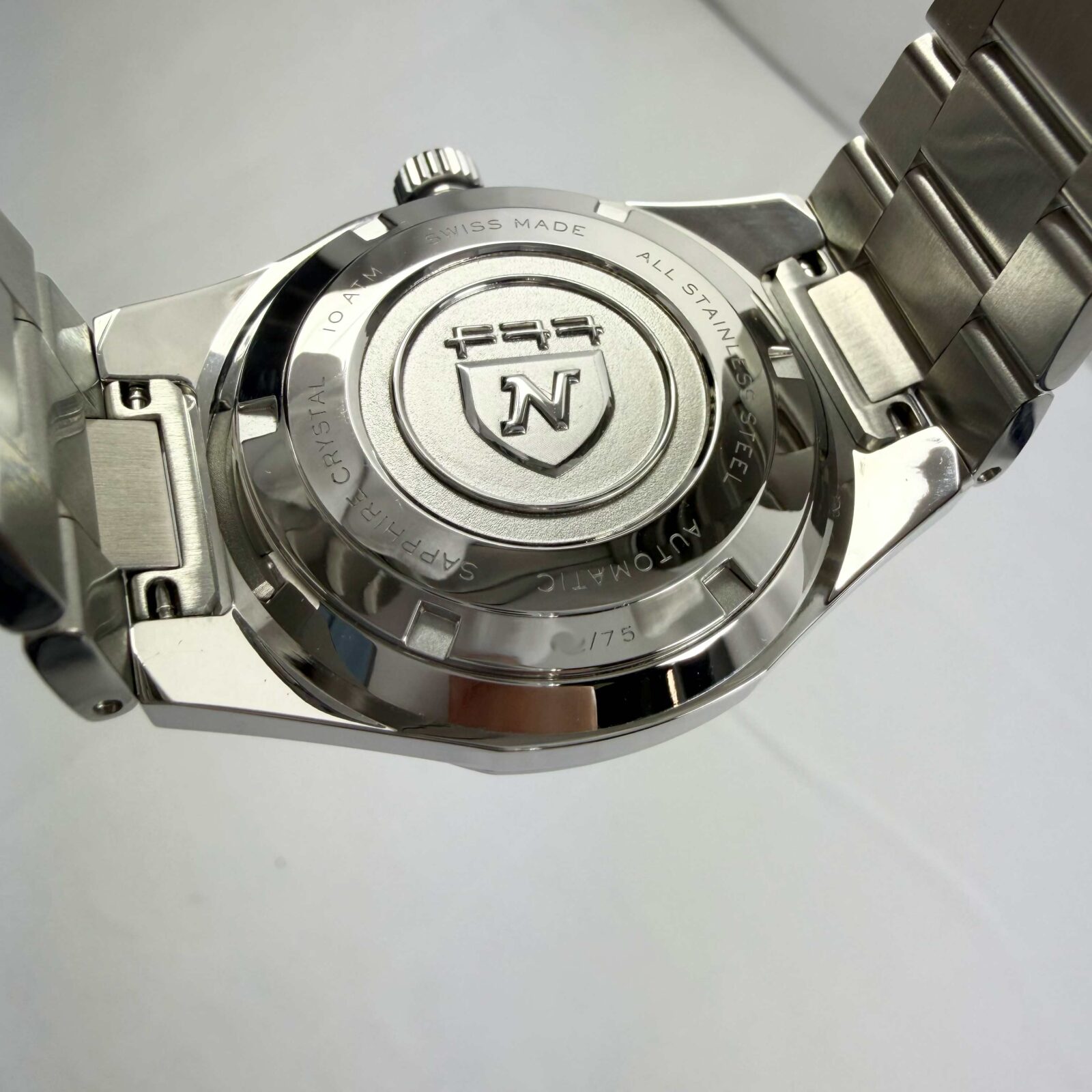 this nivada grenchen watch is new and comes with its box, hang tag, one spare link, and warranty paper dated 2025. This watch is in stock and ready to ship immediately!