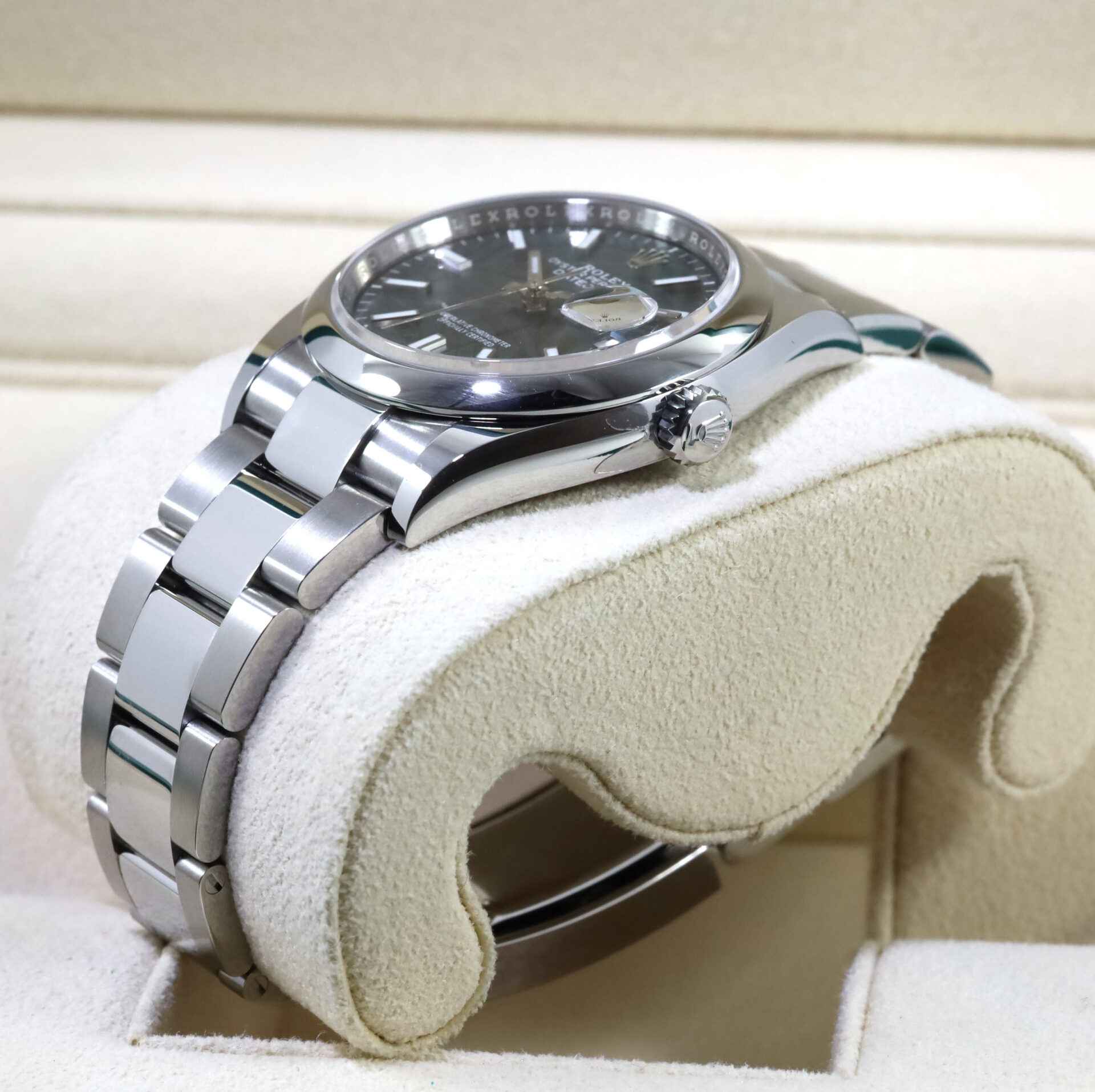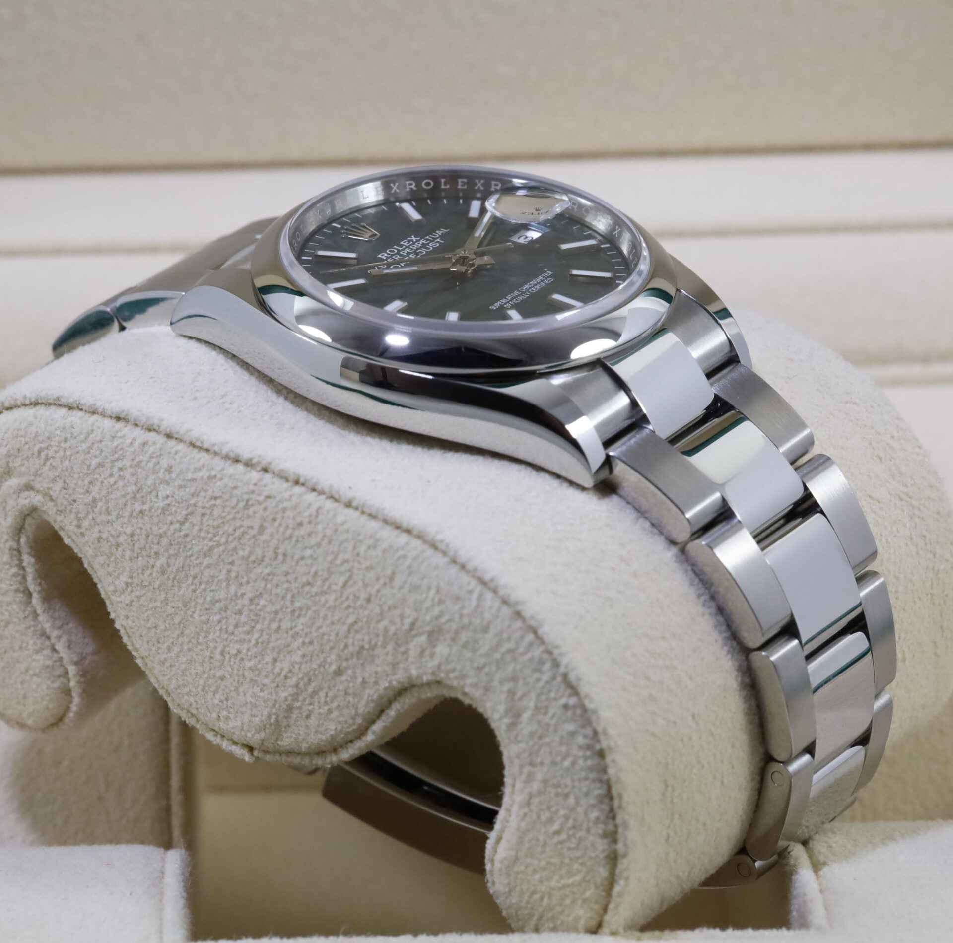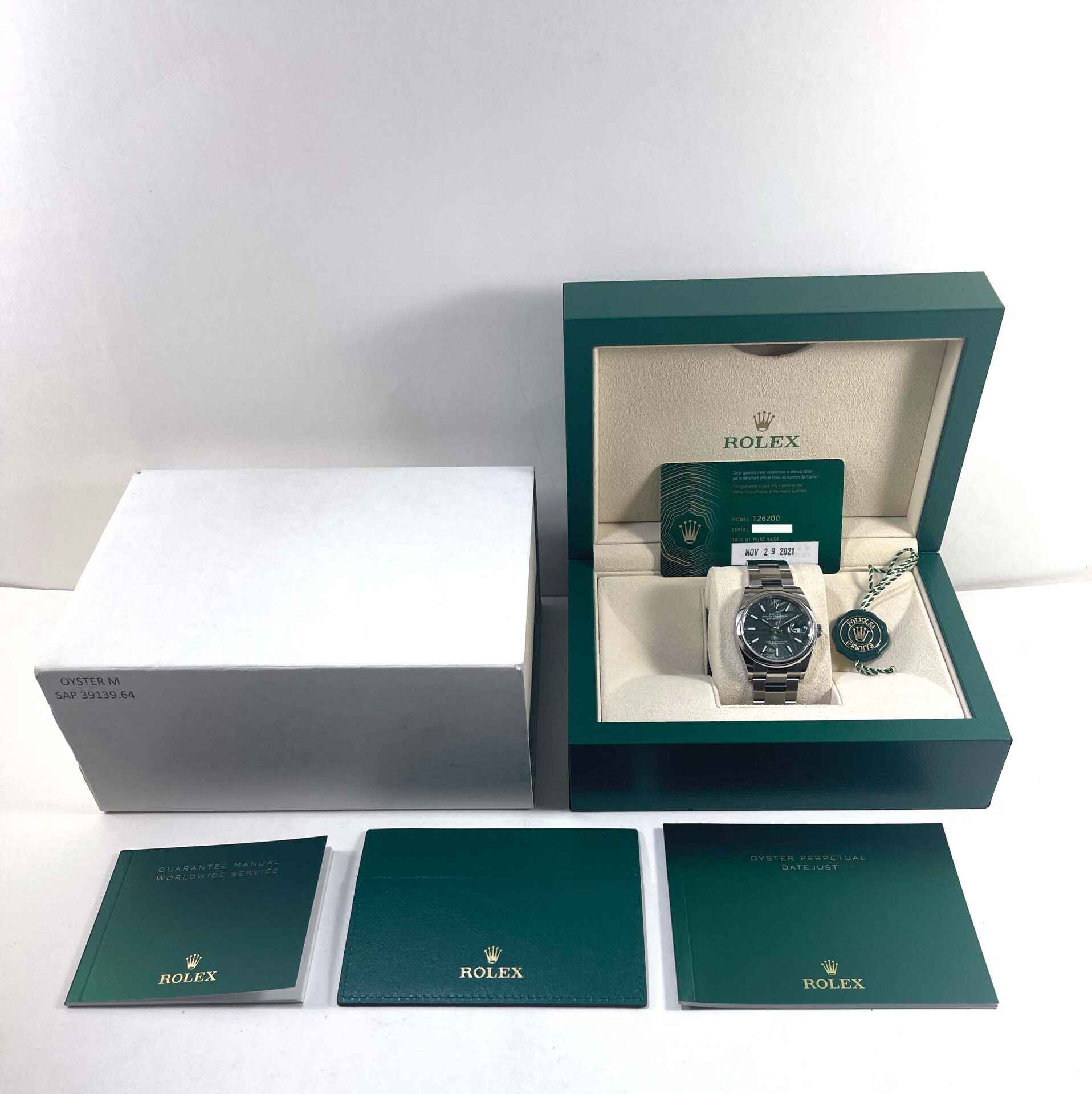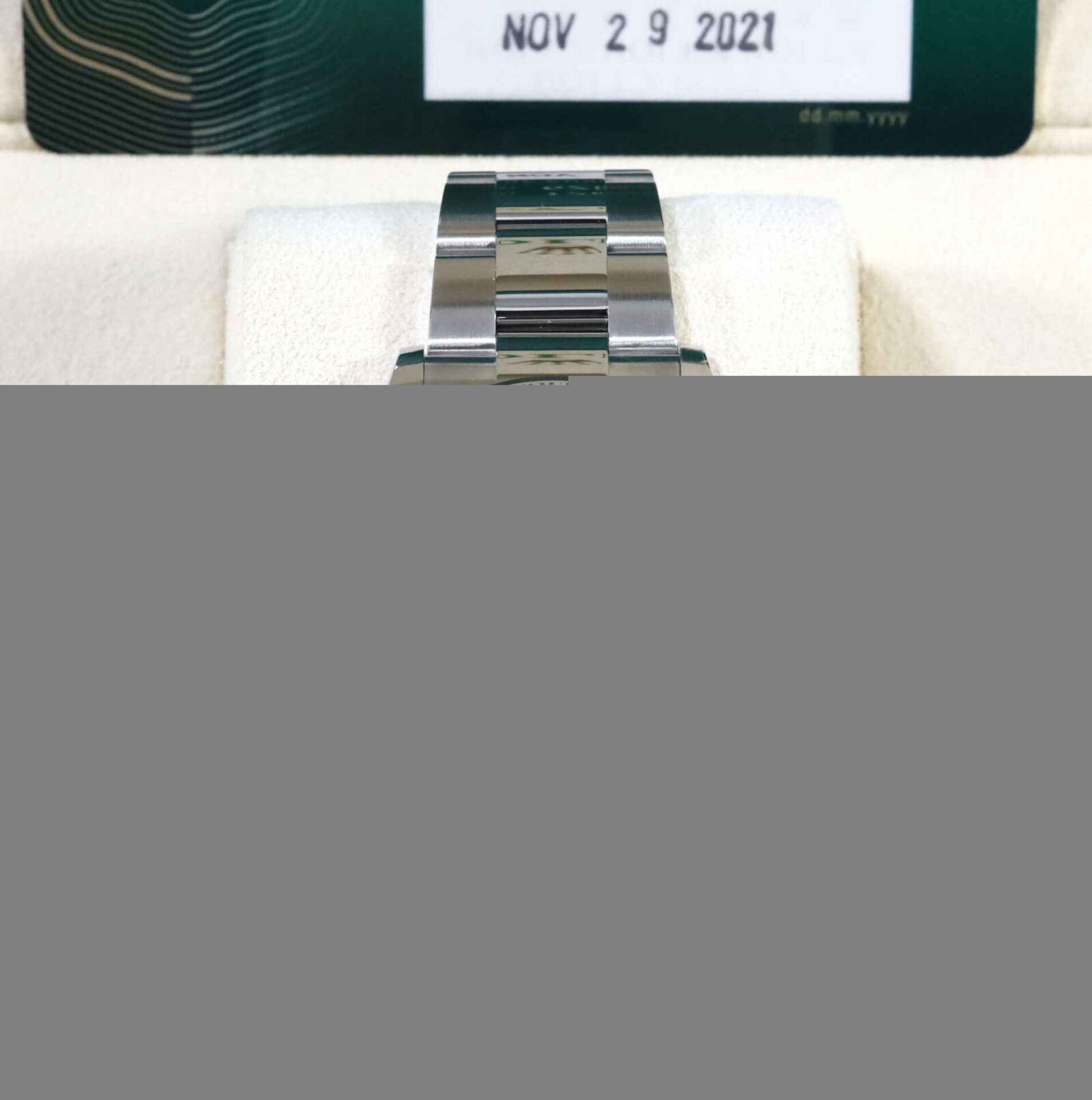 Read Morethis rolex is new and comes with box, papers, hang tag, and warranty card dated november 29th, 2021. This watch features a green motif palm dial with a stainless-steel smooth bezel on a steel oyster band. This watch is in stock and available to ship immediately!
