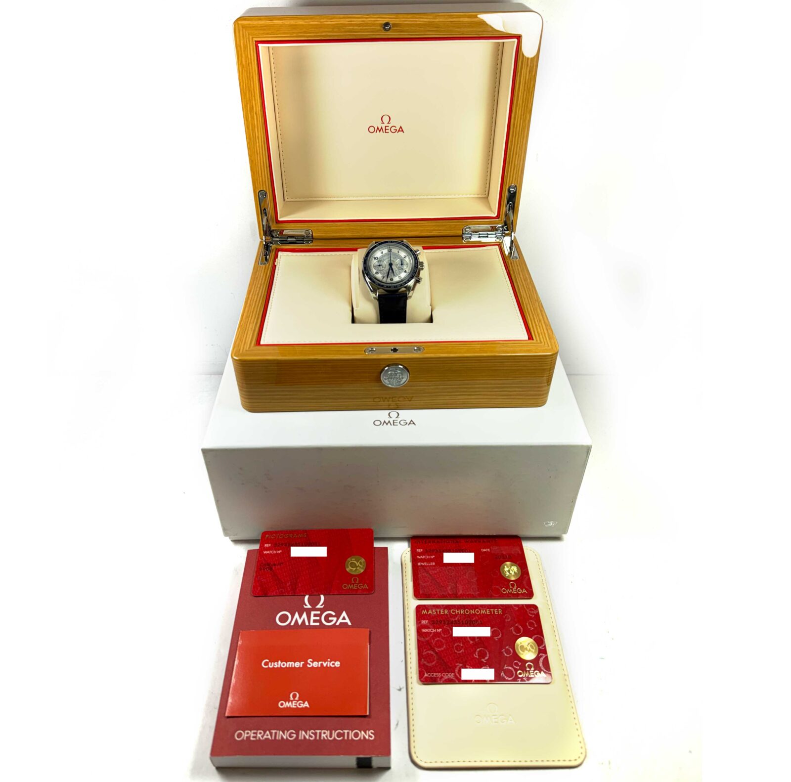 this omega watch is new and comes with its box, booklets, and warranty cards as shown in the pictures attached. This watch is in stock and available to ship immediately!