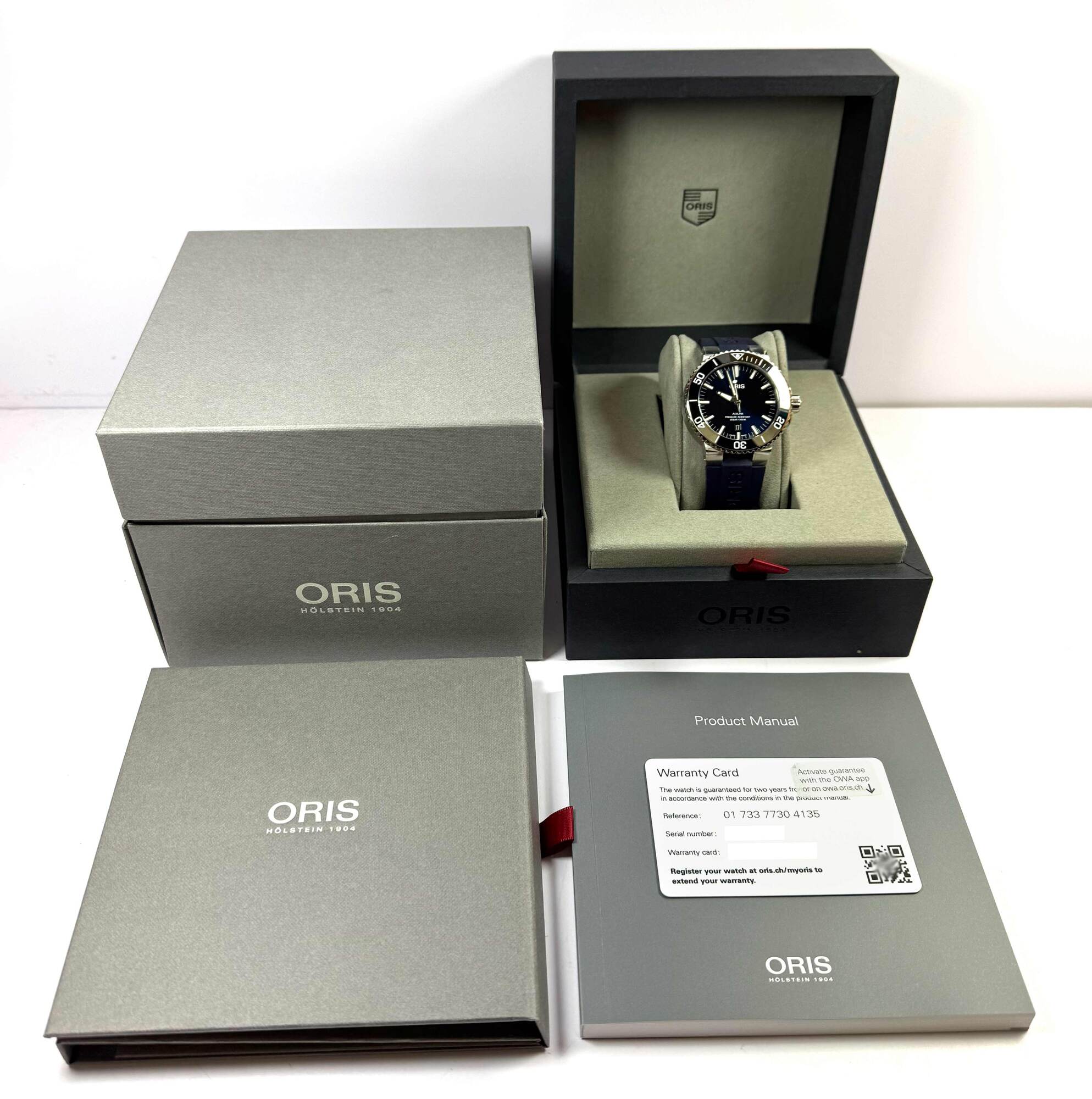 This oris watch is new with stickers and comes with its box, booklets, and warranty card as shown in the pictures attached. This watch is in stock and available to ship immediately!