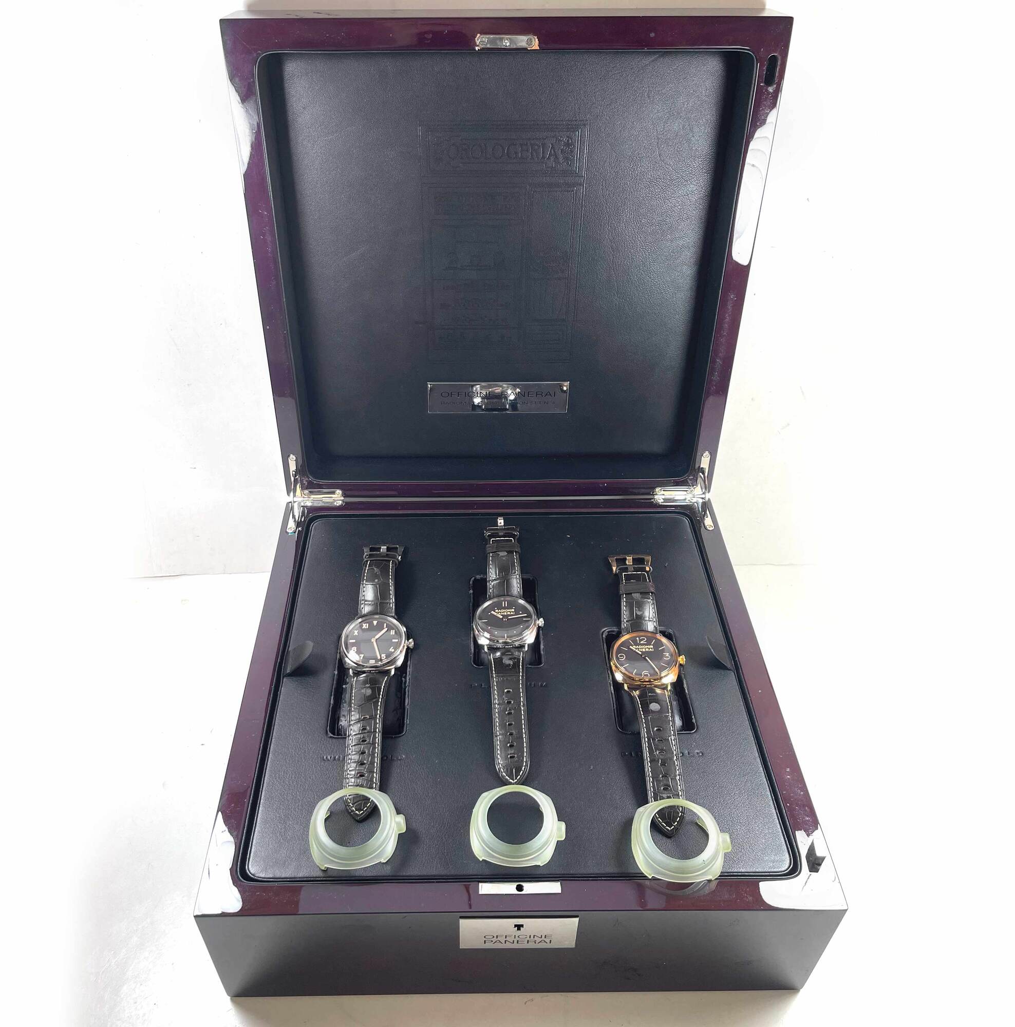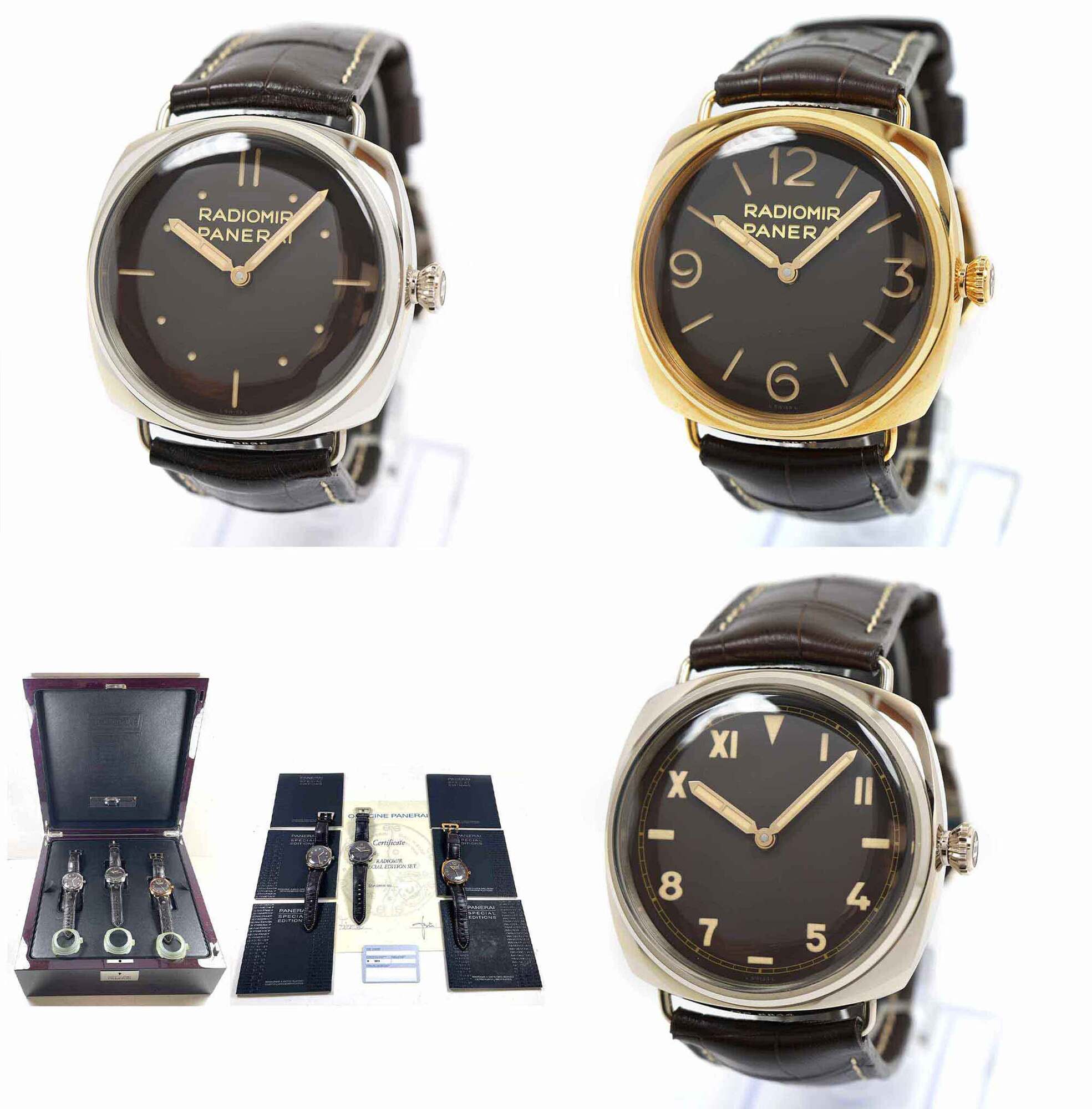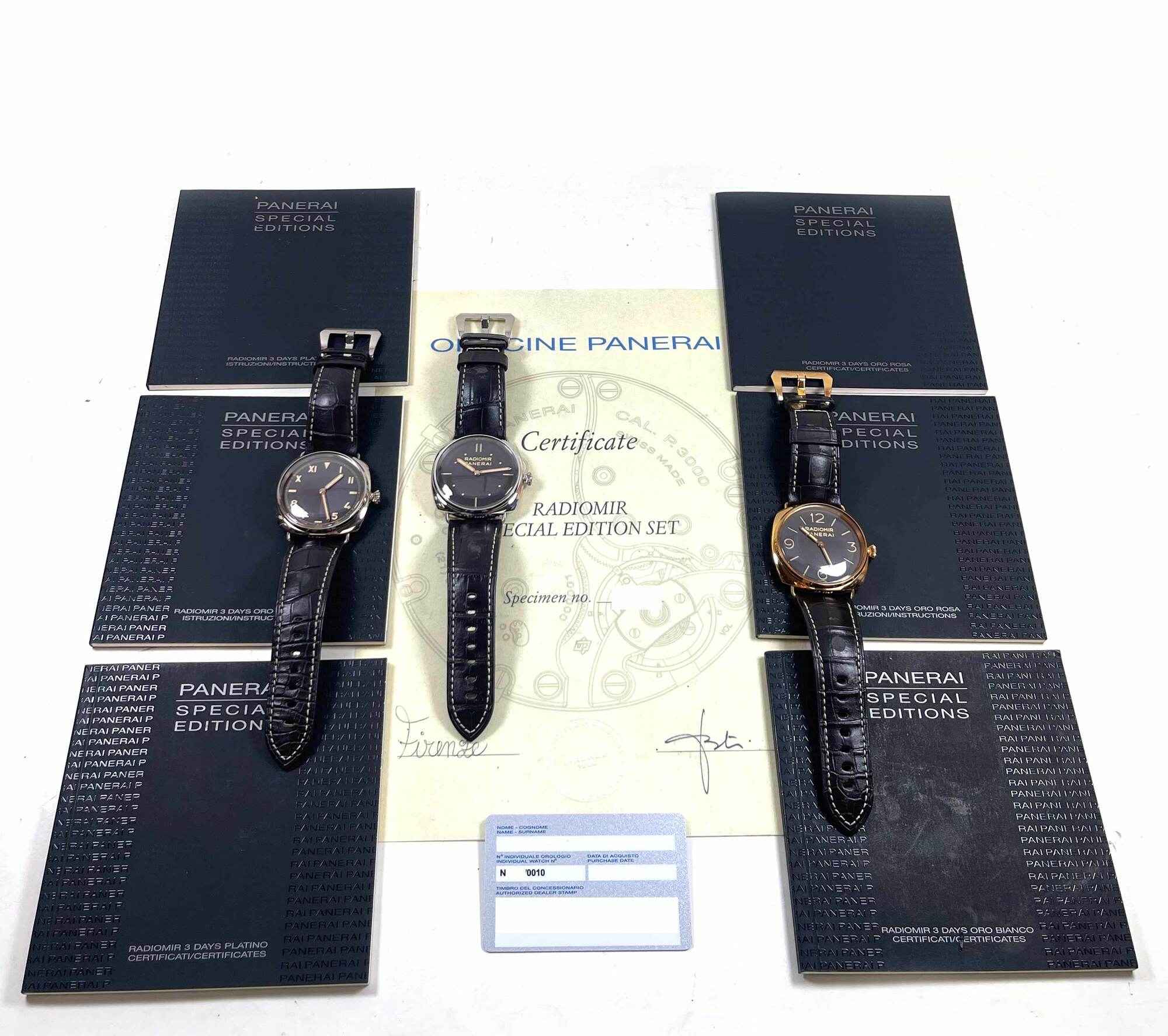 this panerai radiomir special edition set is new with the caseback sticker attached to all 3 watches. These come exactly as shown in the pictures attached which includes the box, booklets, bezel protector, warranty card, and warranty papers dated december 14th, 2011 as shown in the pictures attached. This set is apart of a limited edition with only 10 others produced and is in stock and available to ship immediately!