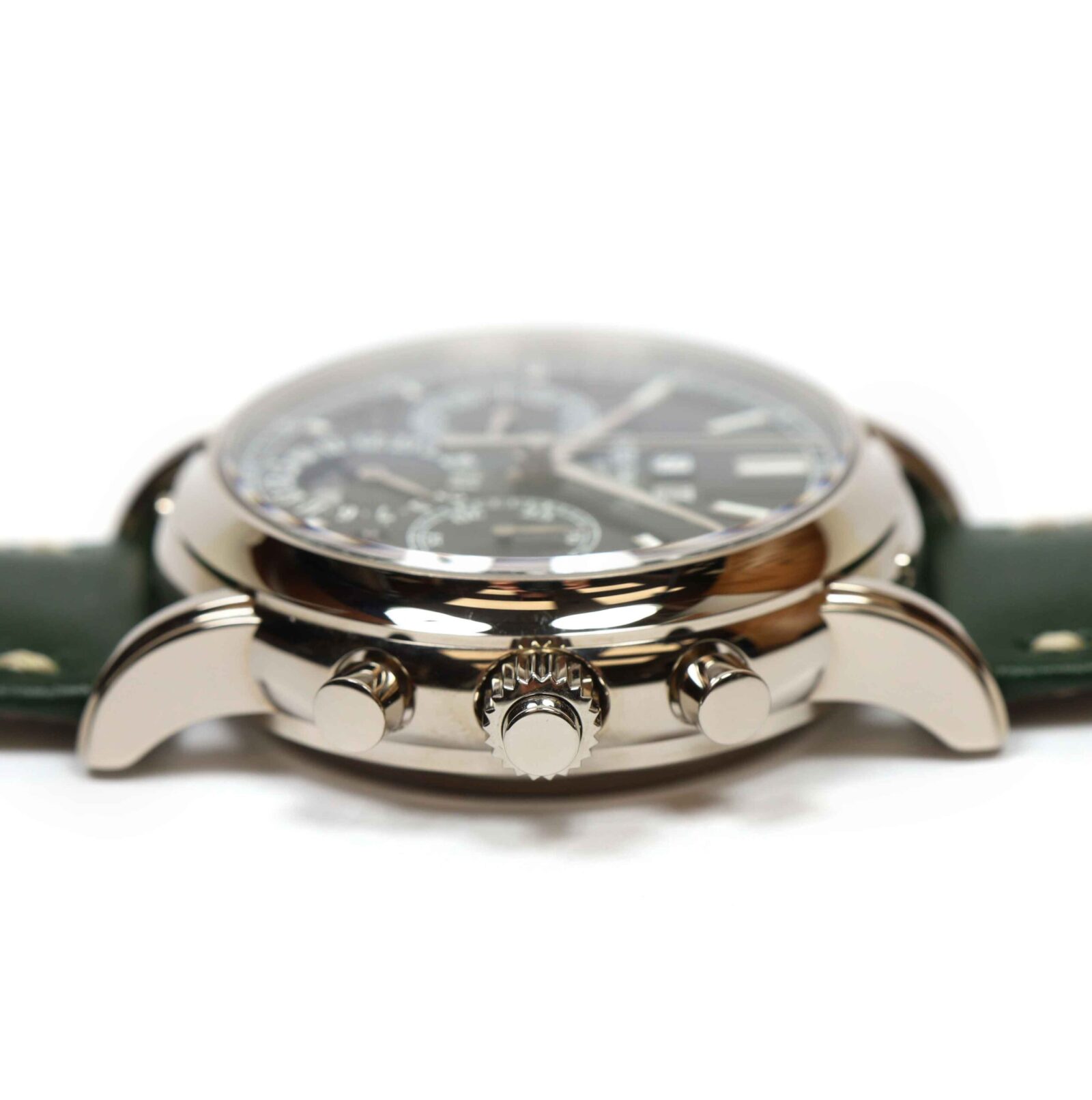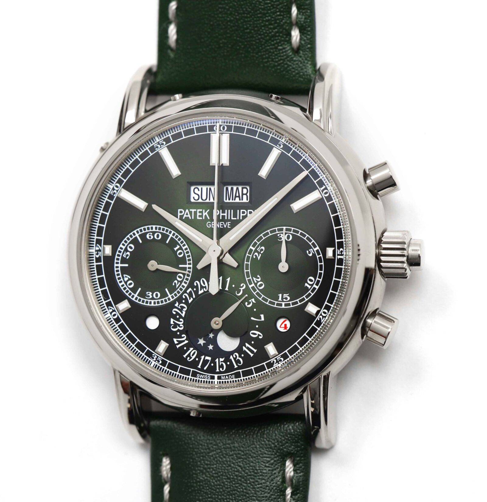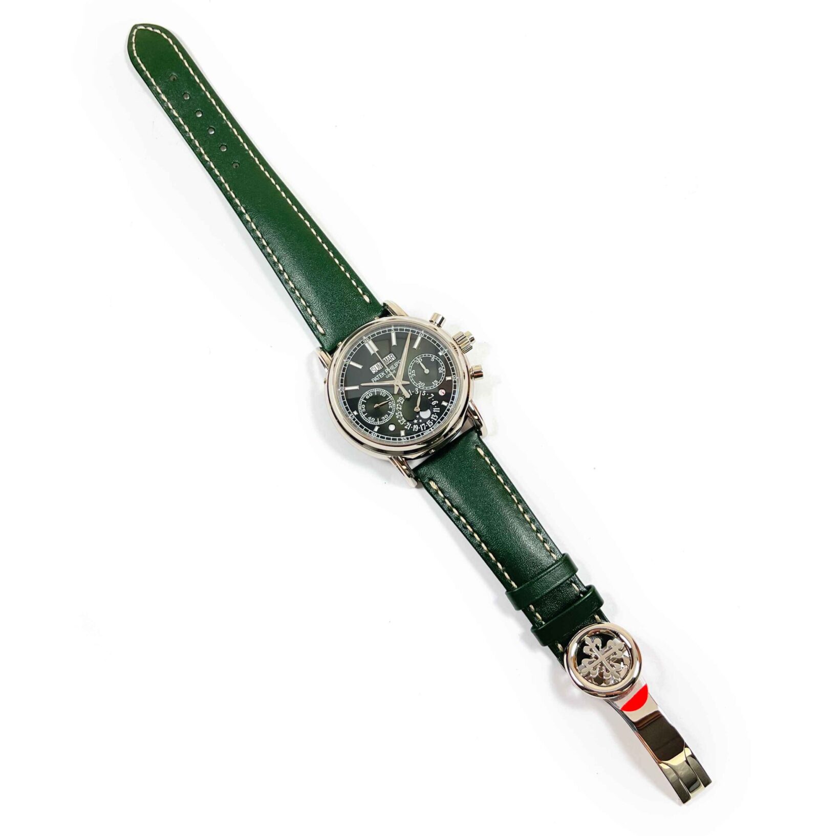 Read Morethis patek is new and comes with its box, booklets, and warranty paper dated late 2023. This watch features an 18k white gold case that surrounds a green dial and comes on a green leather strap. The watch functions include hours, minutes, small-seconds, day, date, month, moon phase, leap year indicator, split-second chronograph and perpetual calendar. This watch is in stock and available to ship immediately!