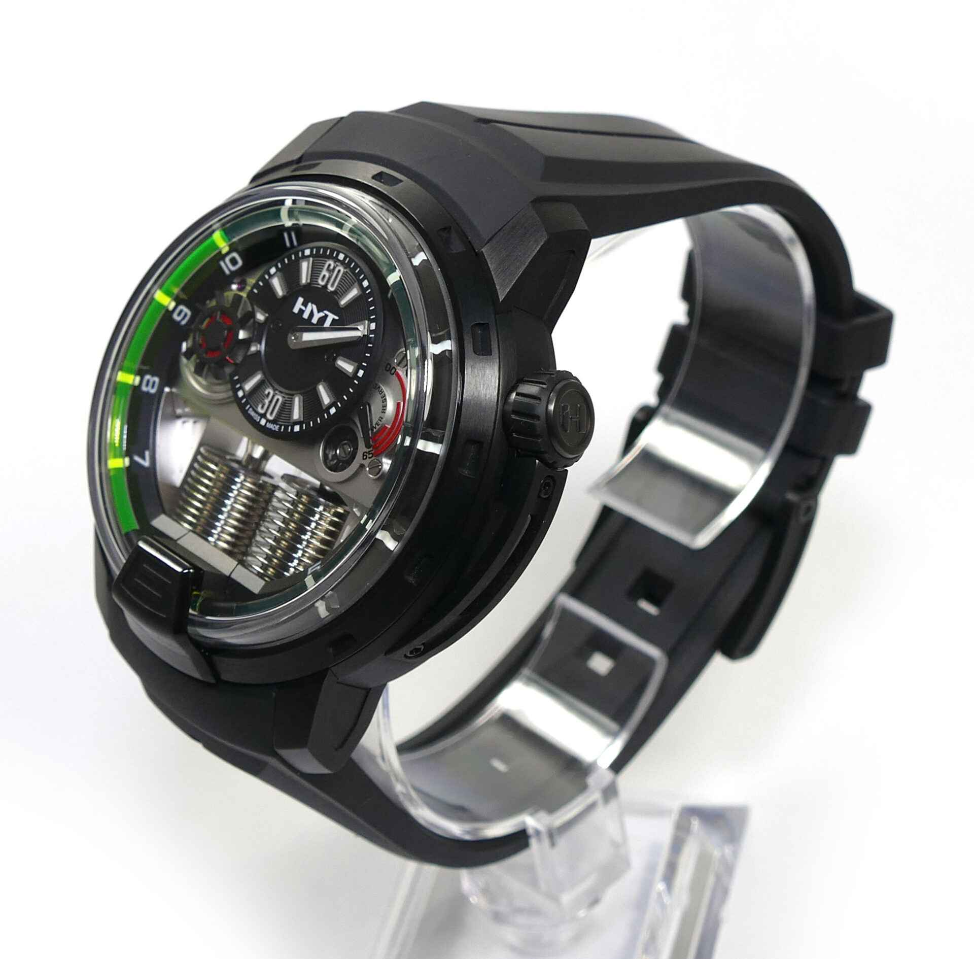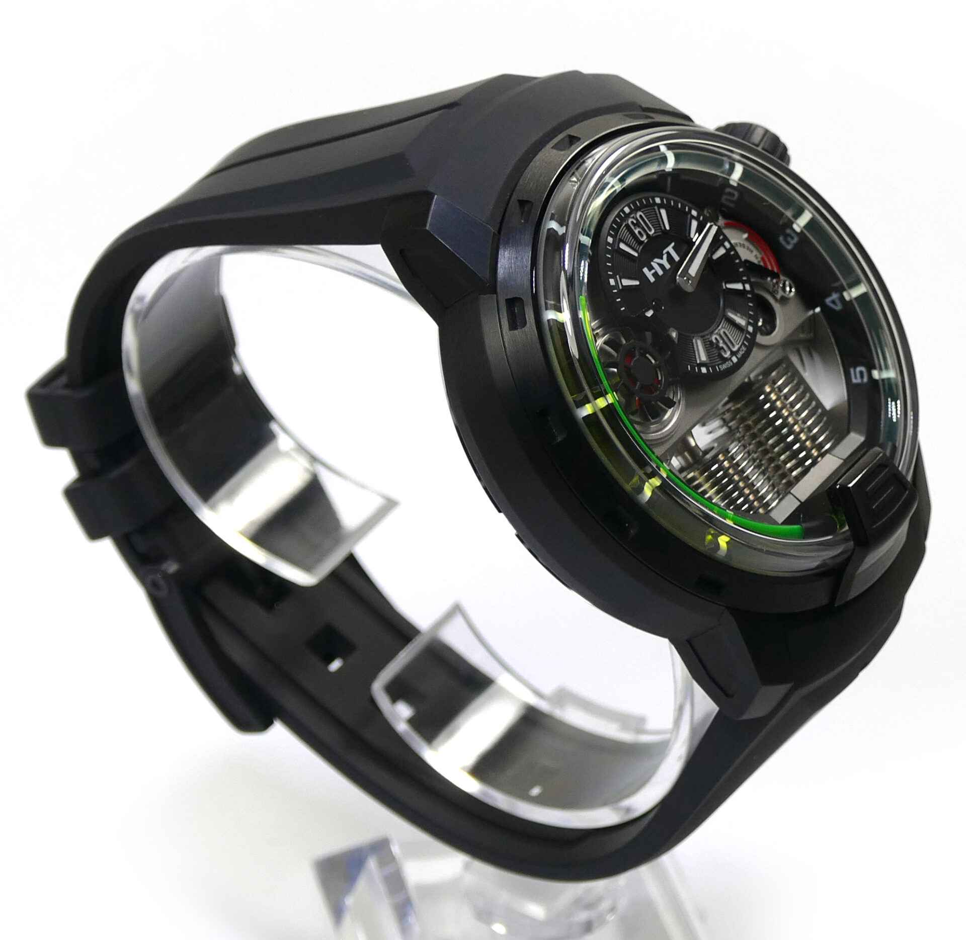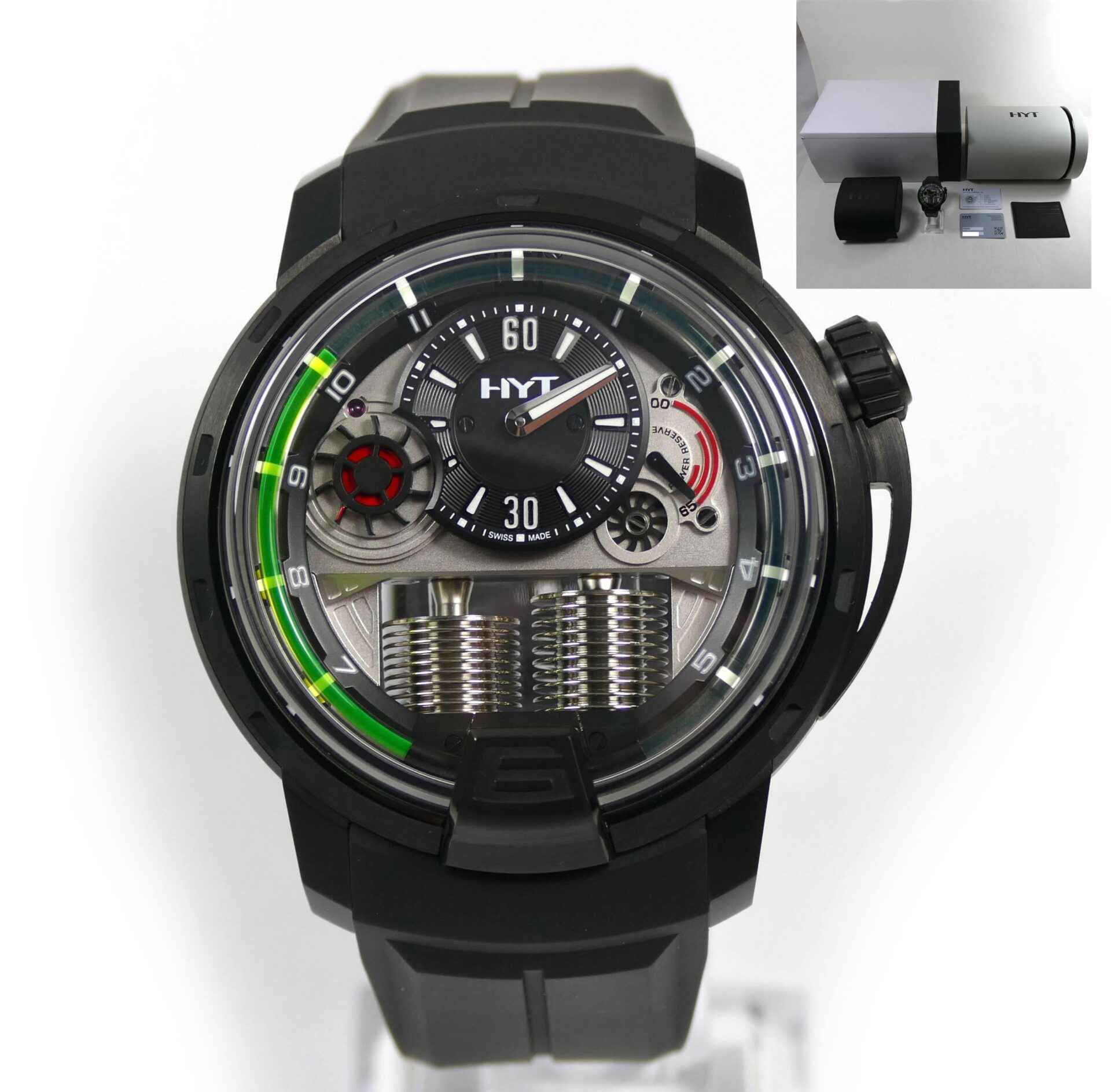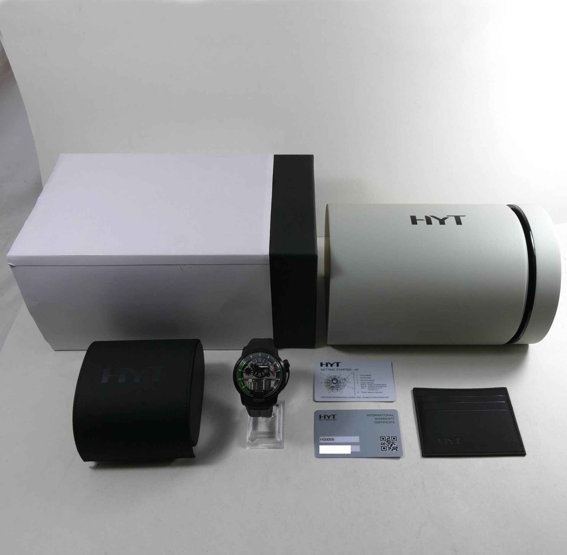 this hyt watch is brand new, and comes with its complete set of box, papers, and warranty card. This watch features a skeleton dial with green liquid that acts as the hour indicator, the minutes are displayed in the center sub-dial, and also a power reserve indicator on the dial. this hyt watch is in stock and ready to ship immediately!