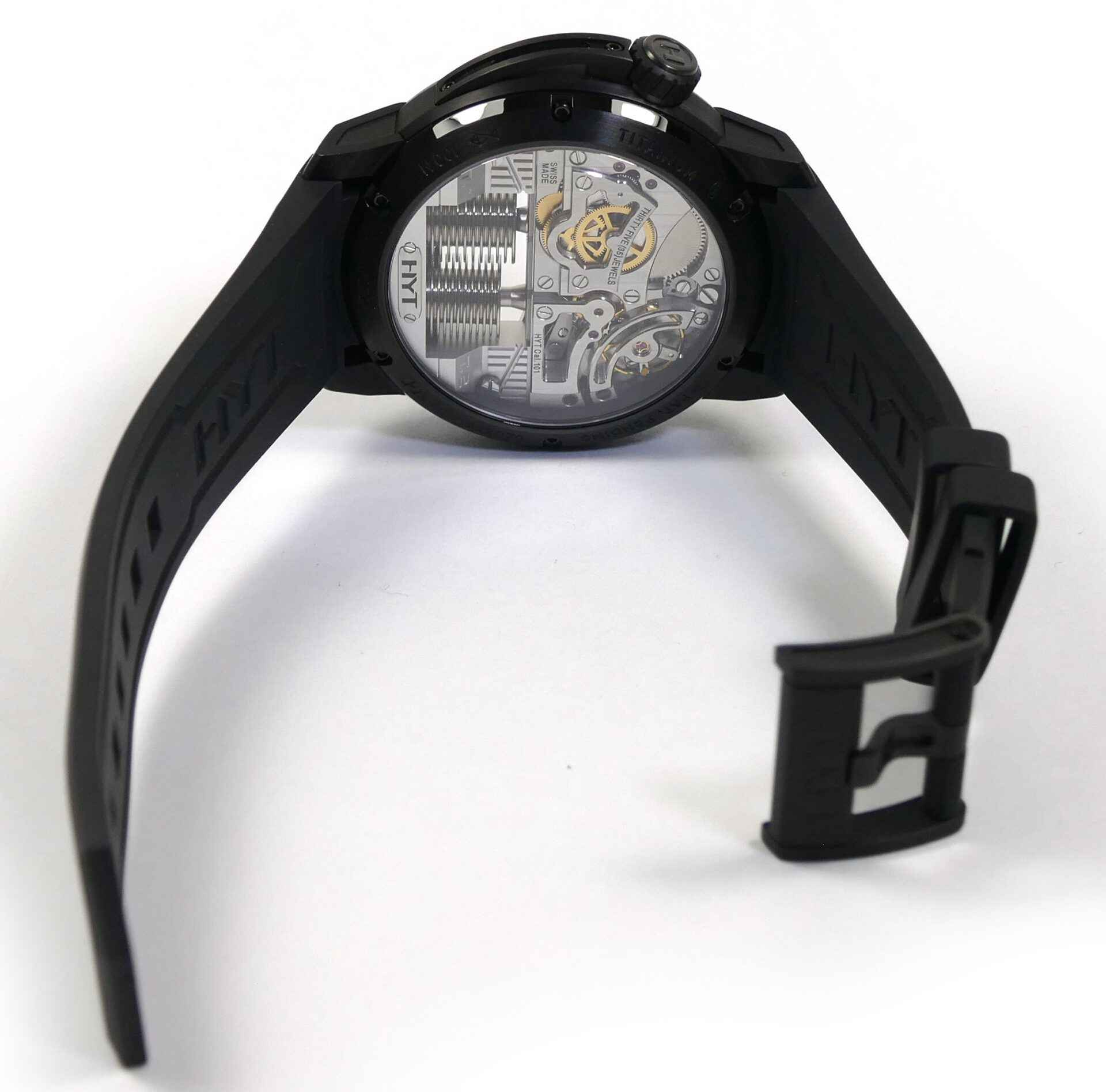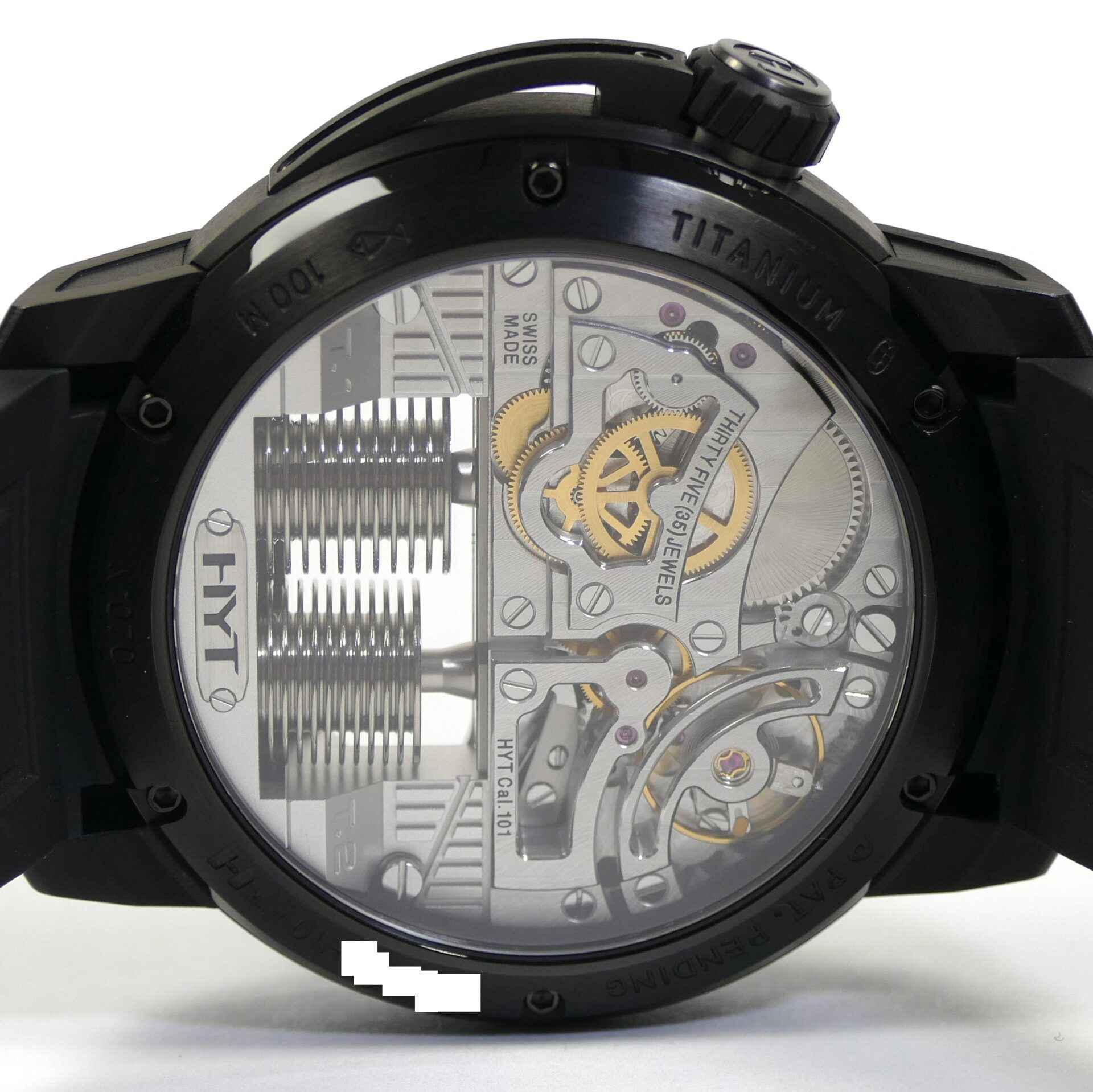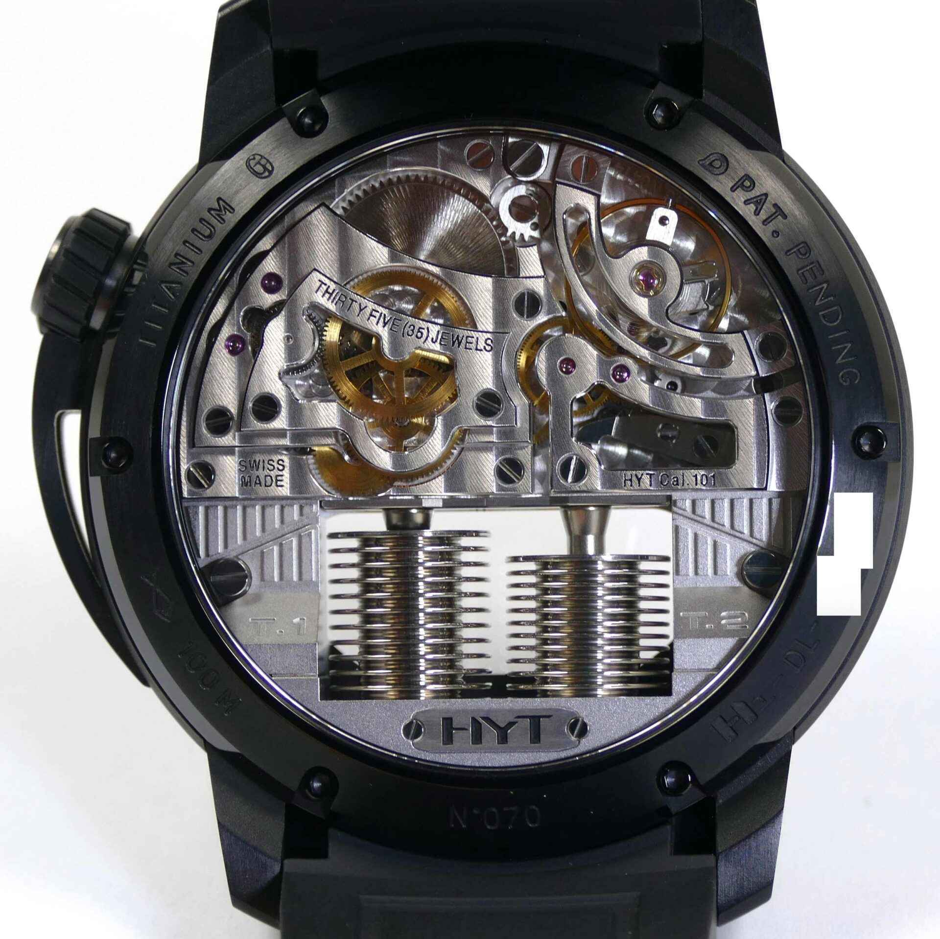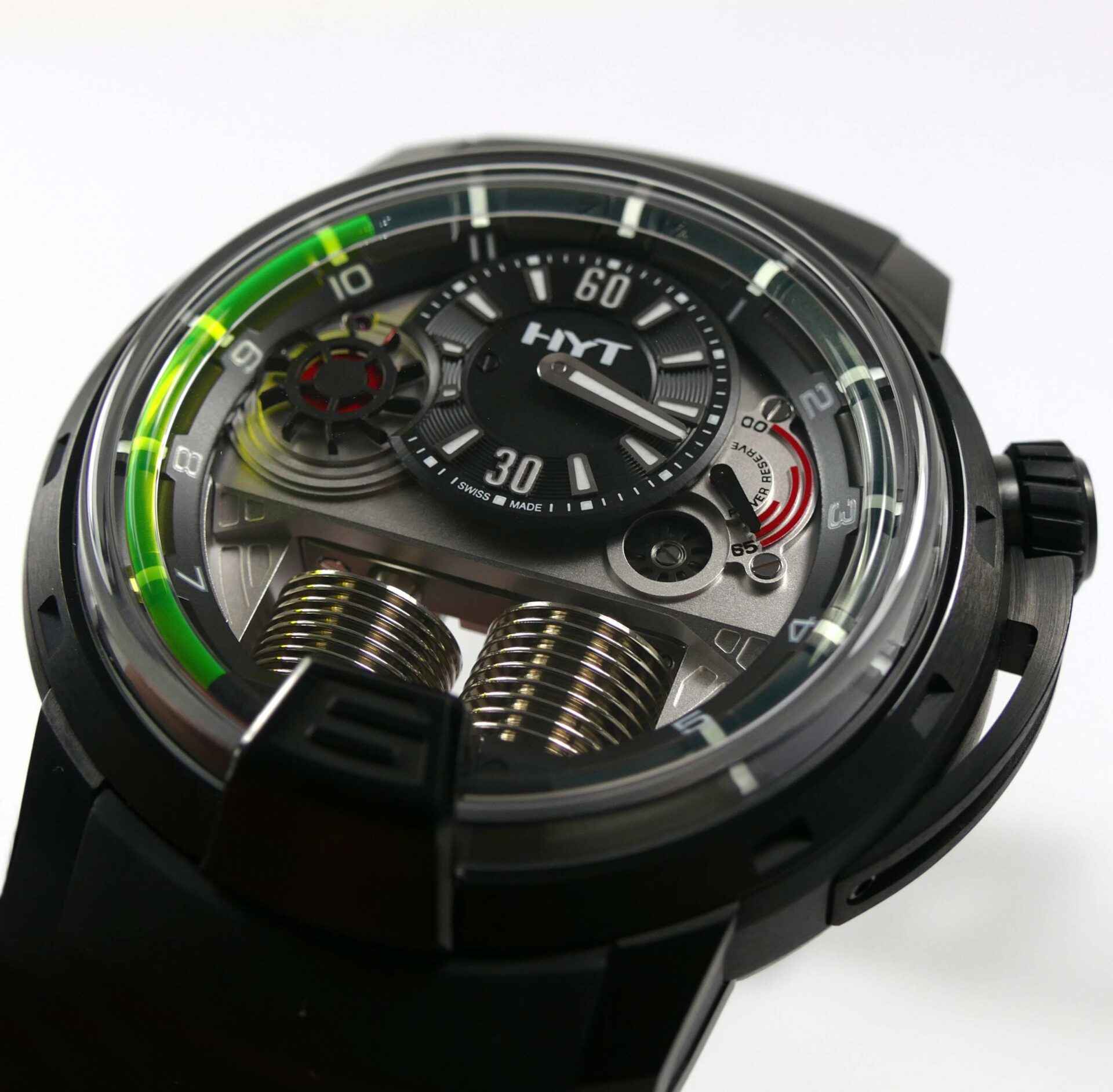 this hyt watch is brand new, and comes with its complete set of box, papers, and warranty card. This watch features a skeleton dial with green liquid that acts as the hour indicator, the minutes are displayed in the center sub-dial, and also a power reserve indicator on the dial. this hyt watch is in stock and ready to ship immediately!