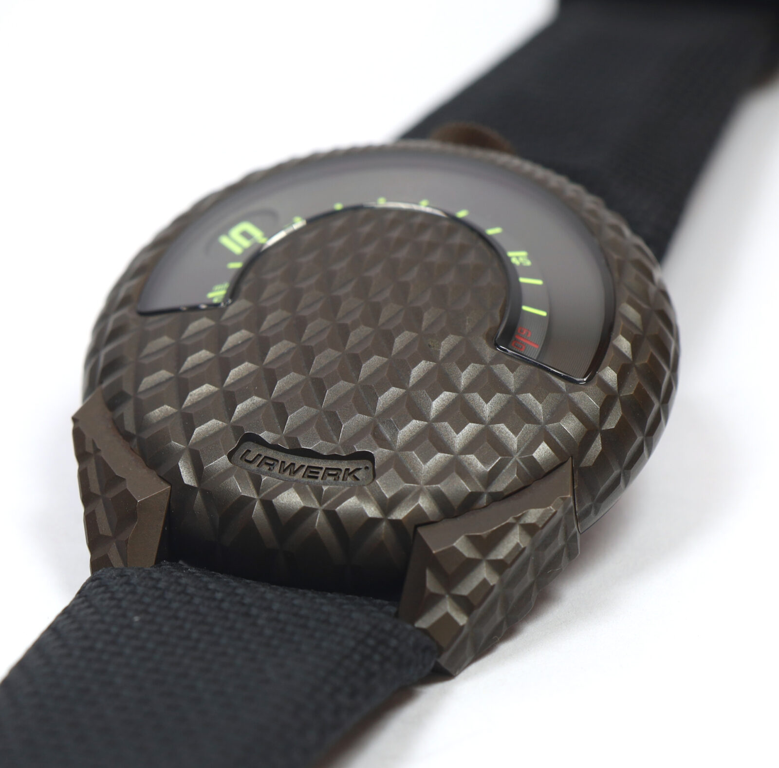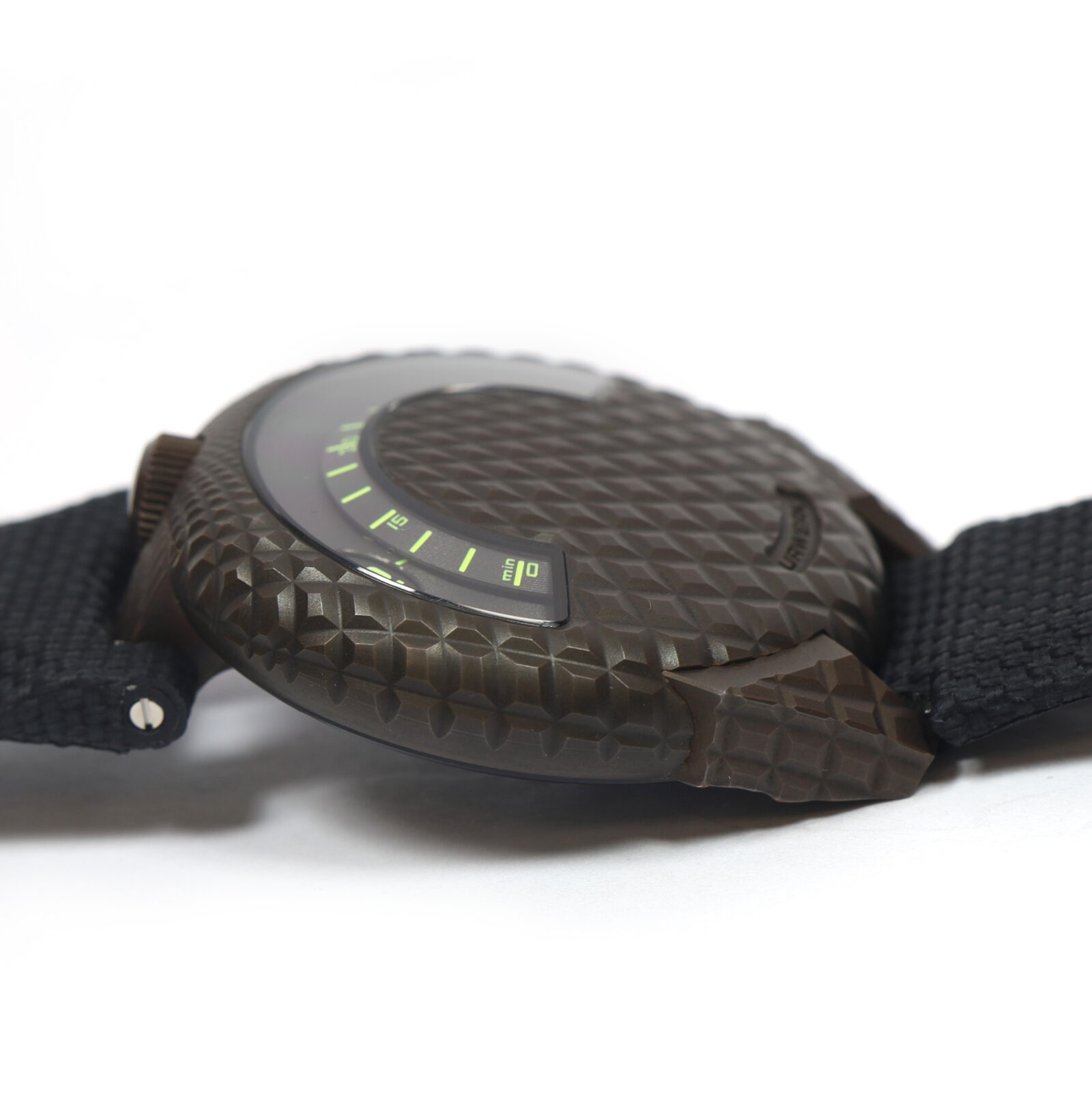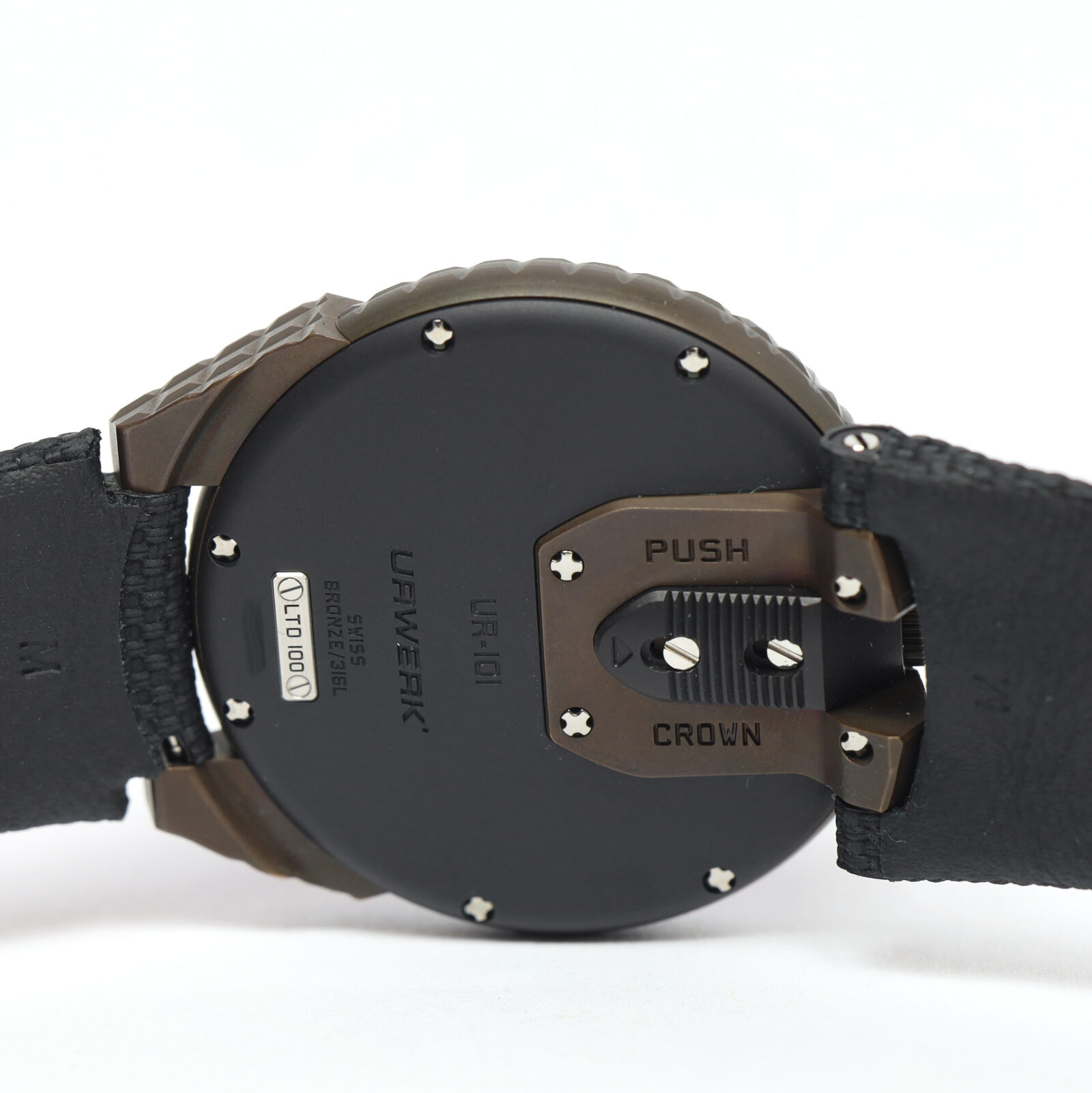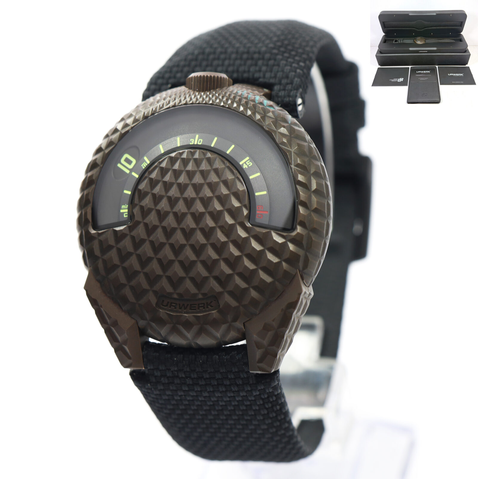 This Urwerk watch is new and comes with its box, booklets, and warranty card as shown. Please note the bronze case (near the crown) has oxidized as shown in the pictures attached. This watch is part of a very limited edition with only 100 total pieces produced...