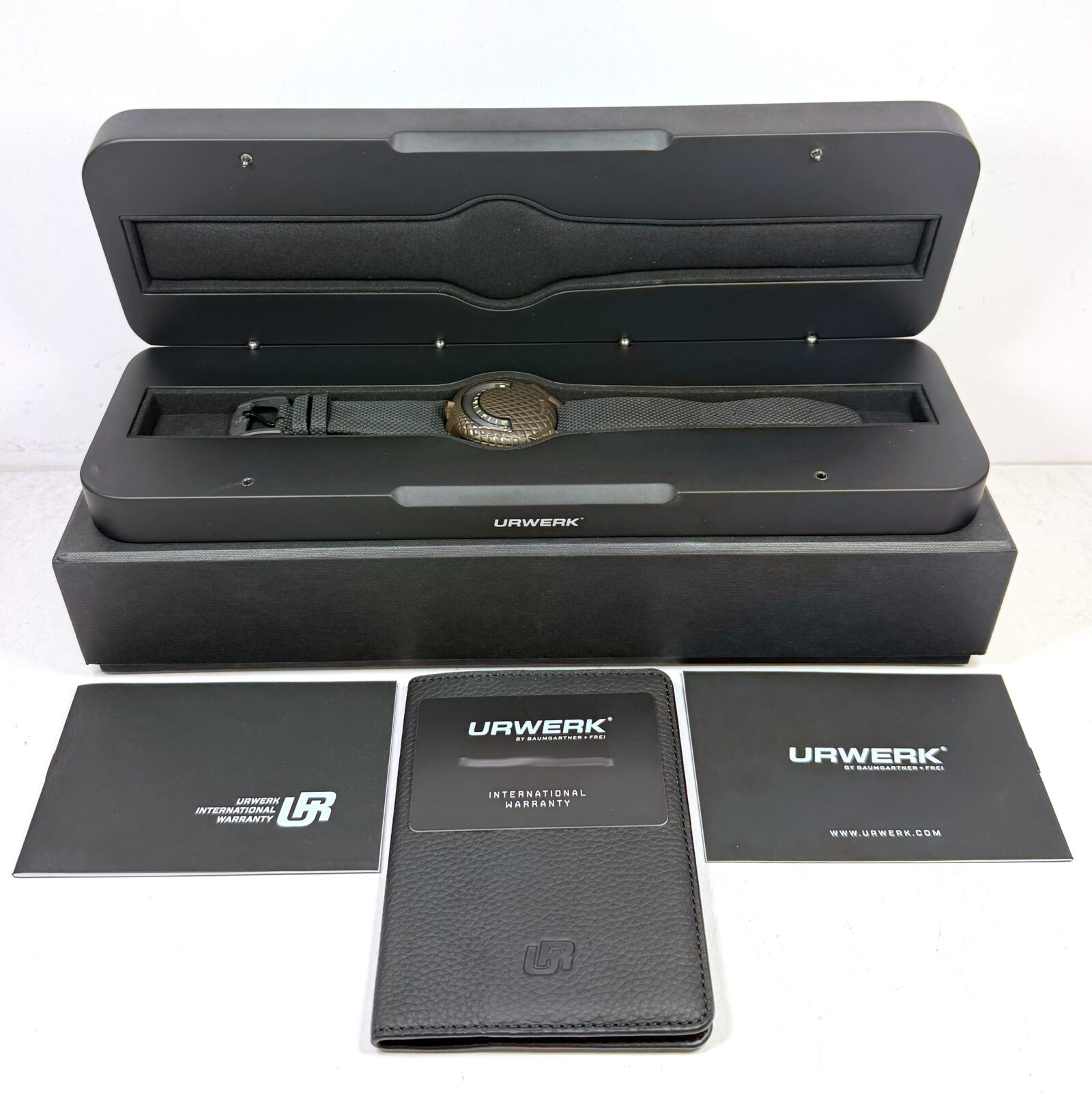 this urwerk watch is new and comes with its box, booklets, and warranty card as shown. Please note the bronze case (near the crown) has oxidized as shown in the pictures attached. This watch is part of a very limited edition with only 100 total pieces produced in this model. This watch is in stock and available to ship immediately!