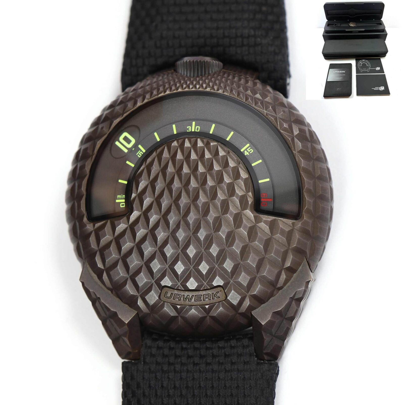 THIS URWERK WATCH IS NEW AND COMES WITH ITS BOX AND WARRANTY CARD AS SHOWN IN THE PICTURES ATTACHED. THIS WATCH IS IN STOCK AND AVAILABLE TO SHIP IMMEDIATELY!