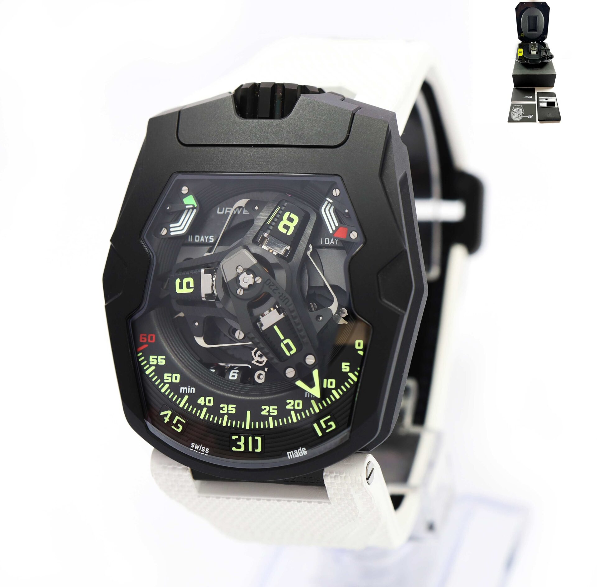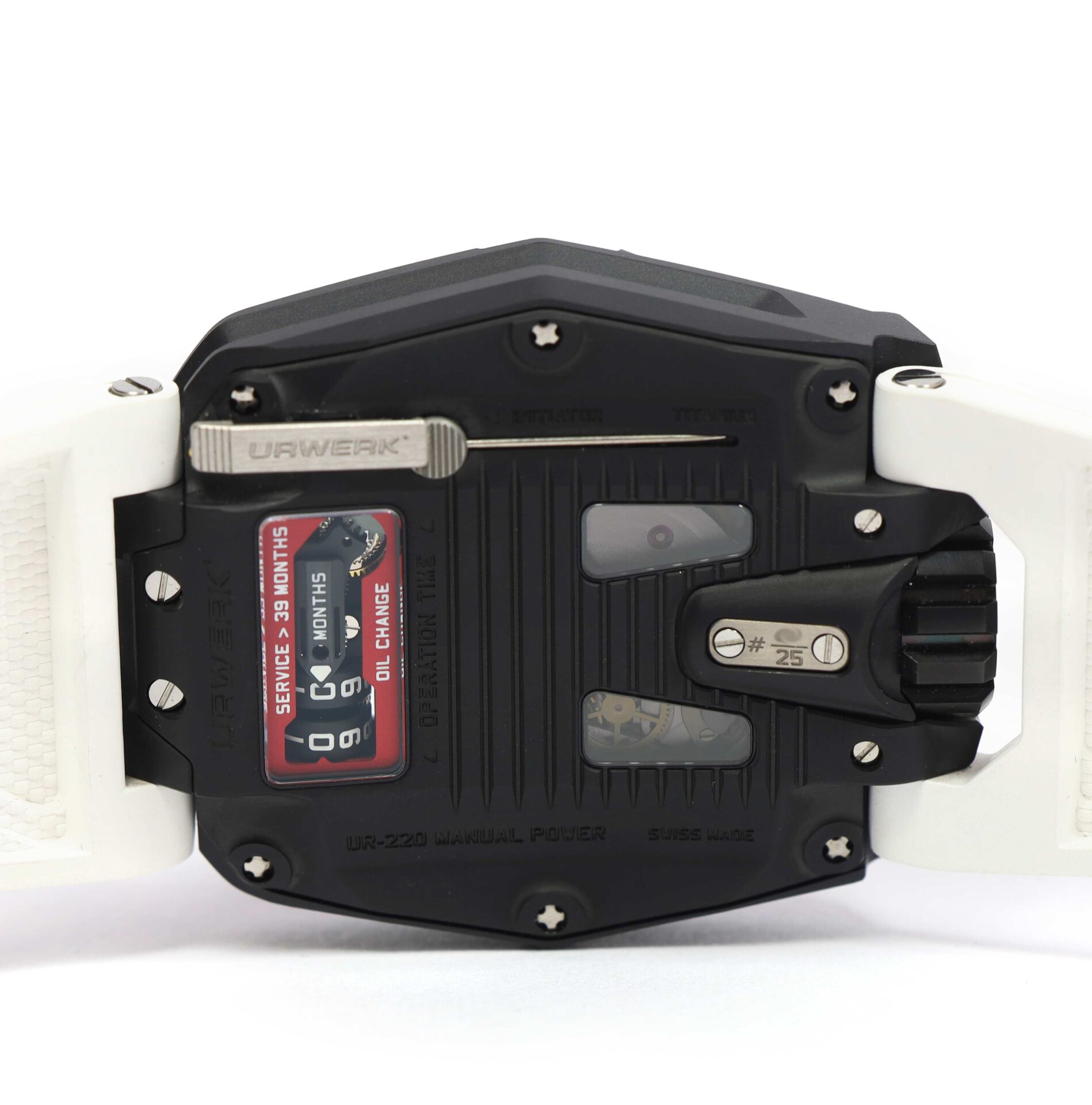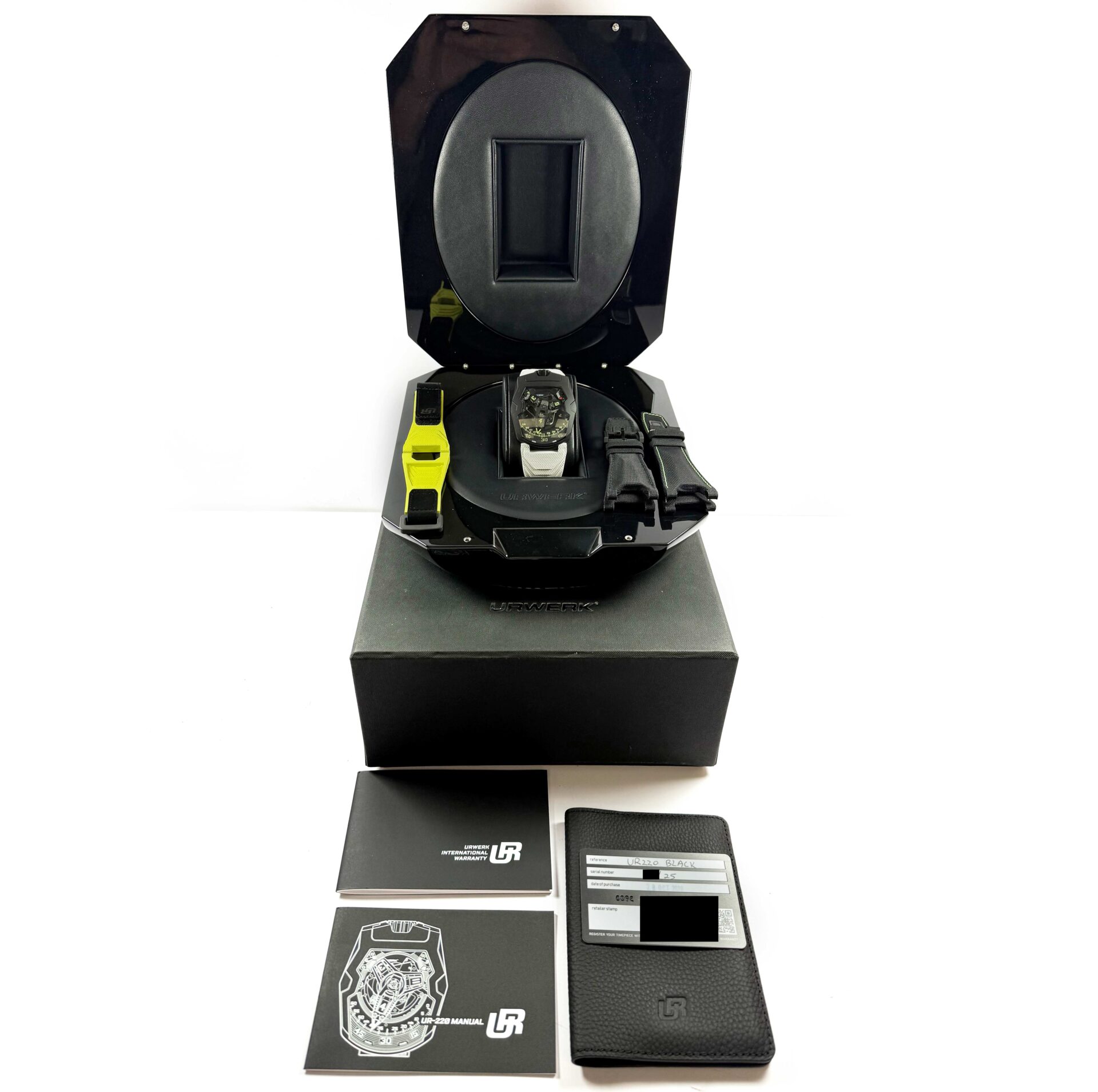 THIS URWERK UR-220 IS NEW AND COMES WITH ITS BOX, BOOKLETS, 3 ADDITIONAL URWERK STRAPS, AND WARRANTY CARD DATED OCTOBER 20TH, 2020 AS SHOWN IN THE PICTURES ATTACHED. THIS WATCH FEATURES A 43.8MM X 53.6MM BLACK DLC-COATED TITANIUM CASE AND THE WATCH FUNCTION...