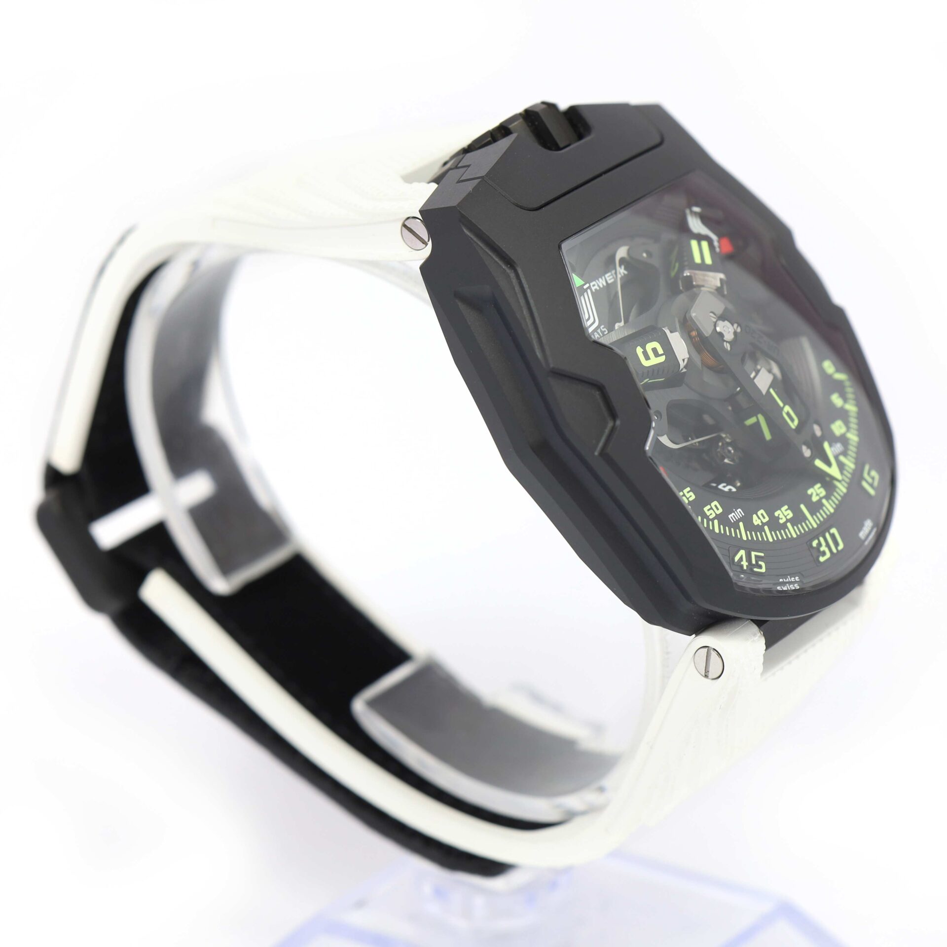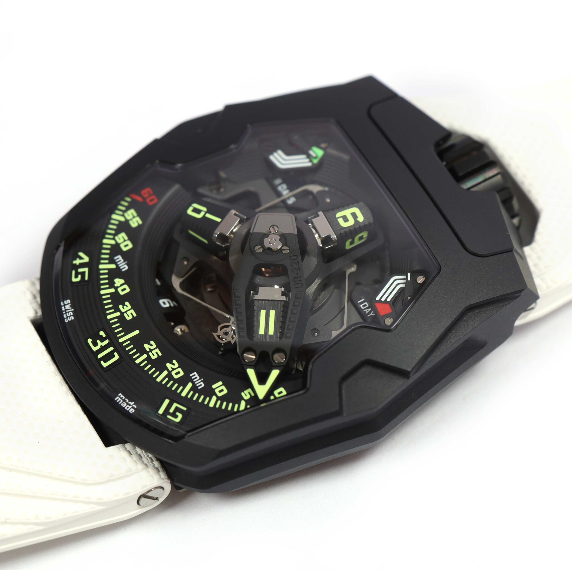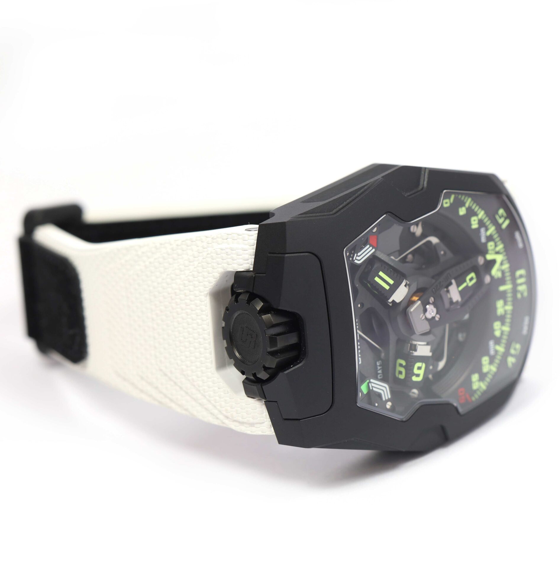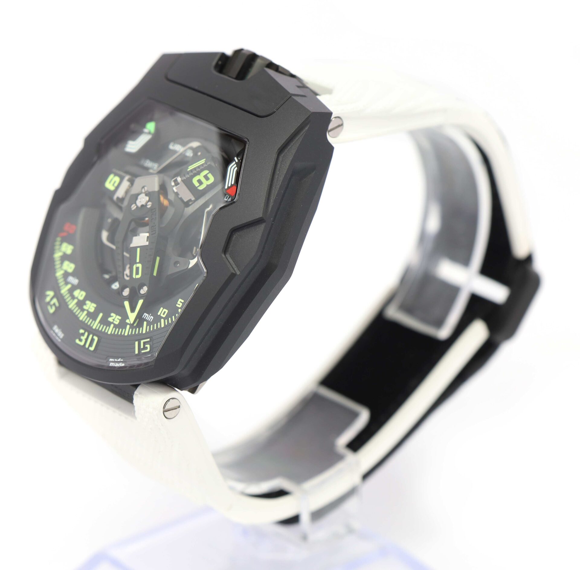 THIS URWERK UR-220 IS NEW AND COMES WITH ITS BOX, BOOKLETS, 3 ADDITIONAL URWERK STRAPS, AND WARRANTY CARD DATED OCTOBER 20TH, 2020 AS SHOWN IN THE PICTURES ATTACHED. THIS WATCH FEATURES A 43.8MM X 53.6MM BLACK DLC-COATED TITANIUM CASE AND THE WATCH FUNCTION...