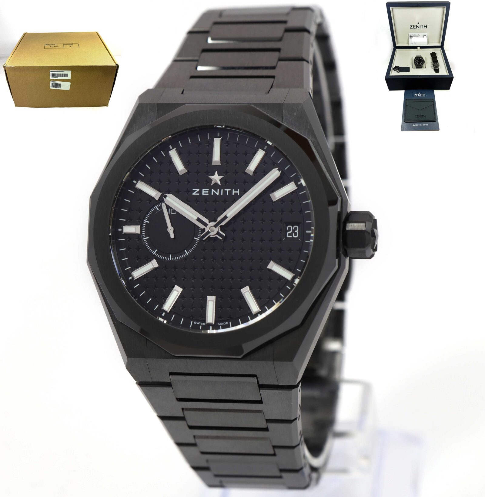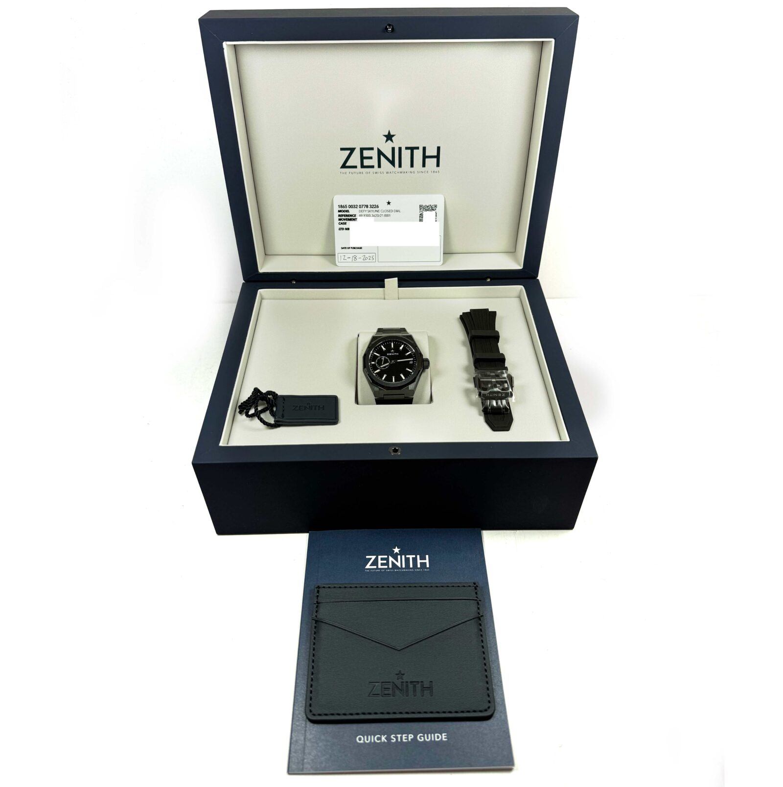 this zenith watch is new and comes with its box, booklet, zenith wallet, hang tag, one additional strap, and warranty card dated december 18th, 2025 as shown in the pictures attached. This watch is in stock and available to ship immediately!