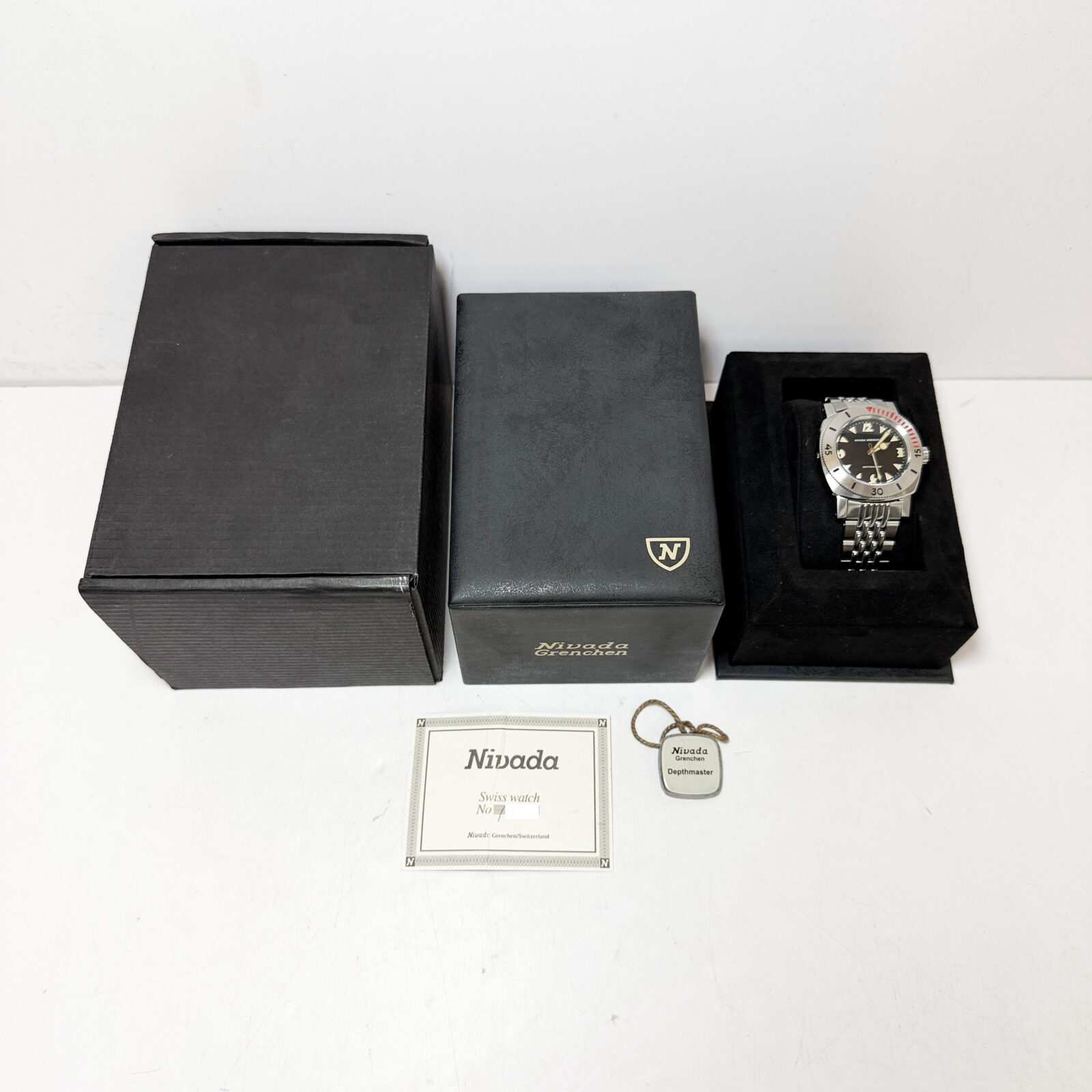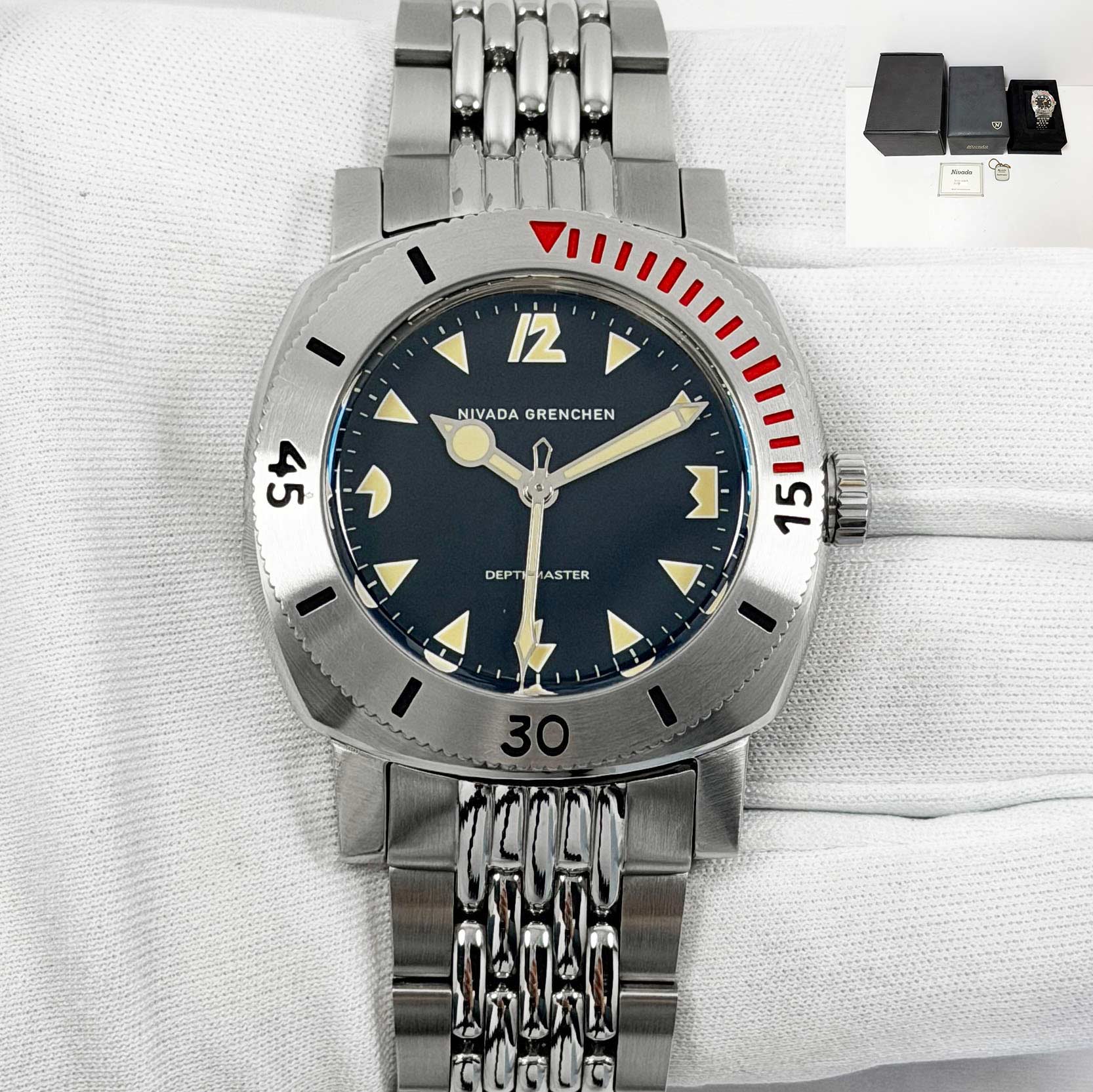 this nivada grenchen watch comes with its box, hangtag, and paper. The photos shown are of the exact watch being sold and accurately represent its condition. This watch is in stock and ready to ship immediately!